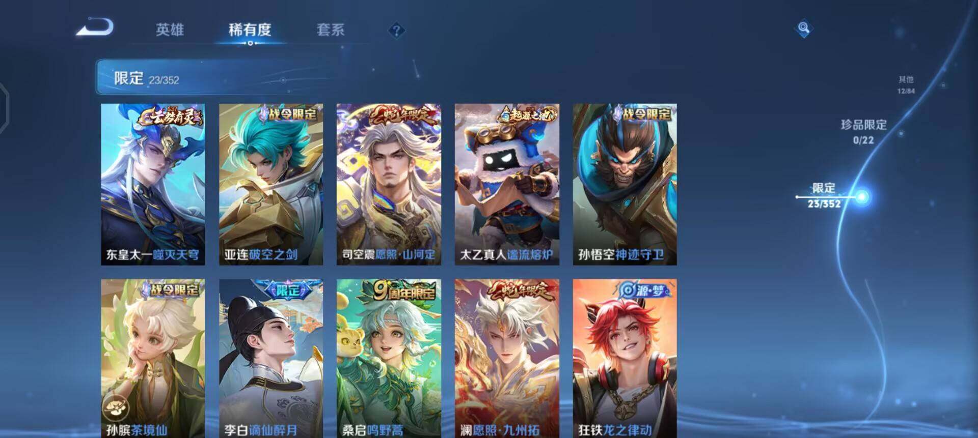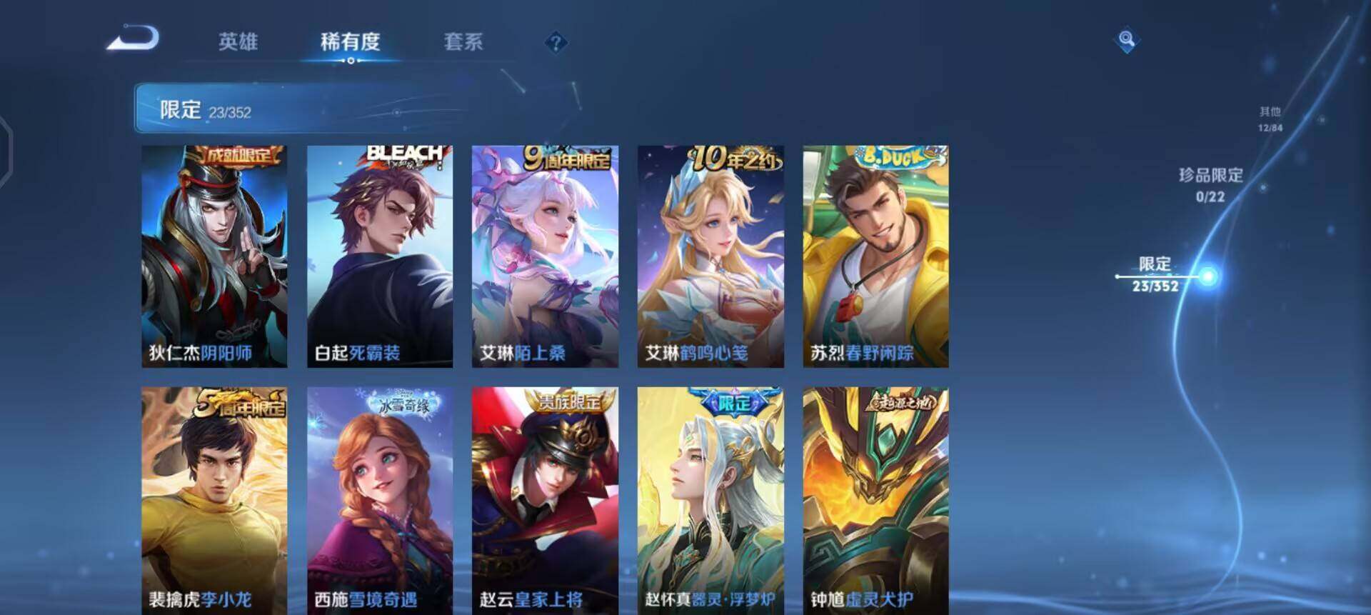 【限定皮肤】:李白谪仙醉月,狄仁杰阴阳师,赵云皇家上将,项羽海滩派对,裴擒虎李小龙,沈
