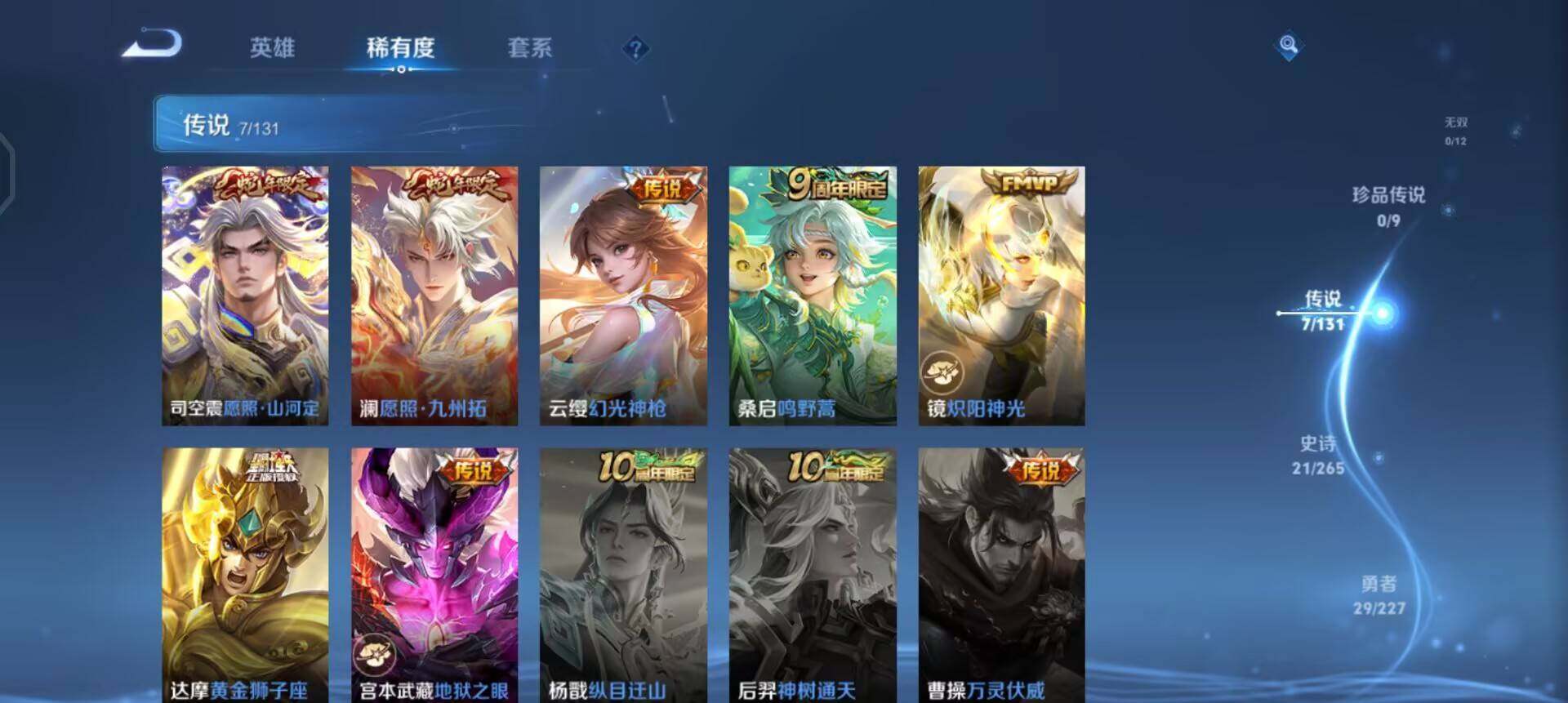 【传说皮肤】:司空震愿照山河定,澜愿照九州拓,云缨幻光神枪,桑启鸣野蒿,镜炽阳神光,达摩黄金狮子座,宫本武藏地狱之眼