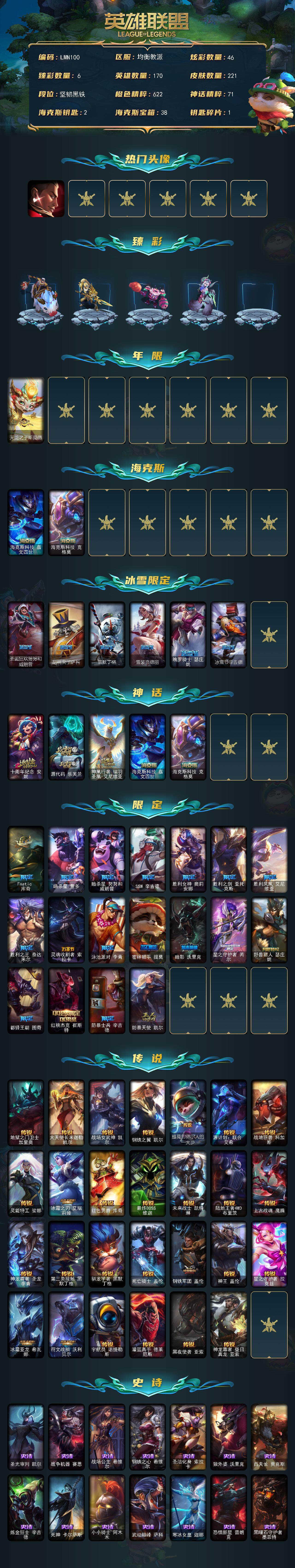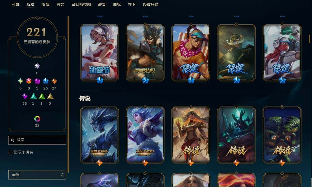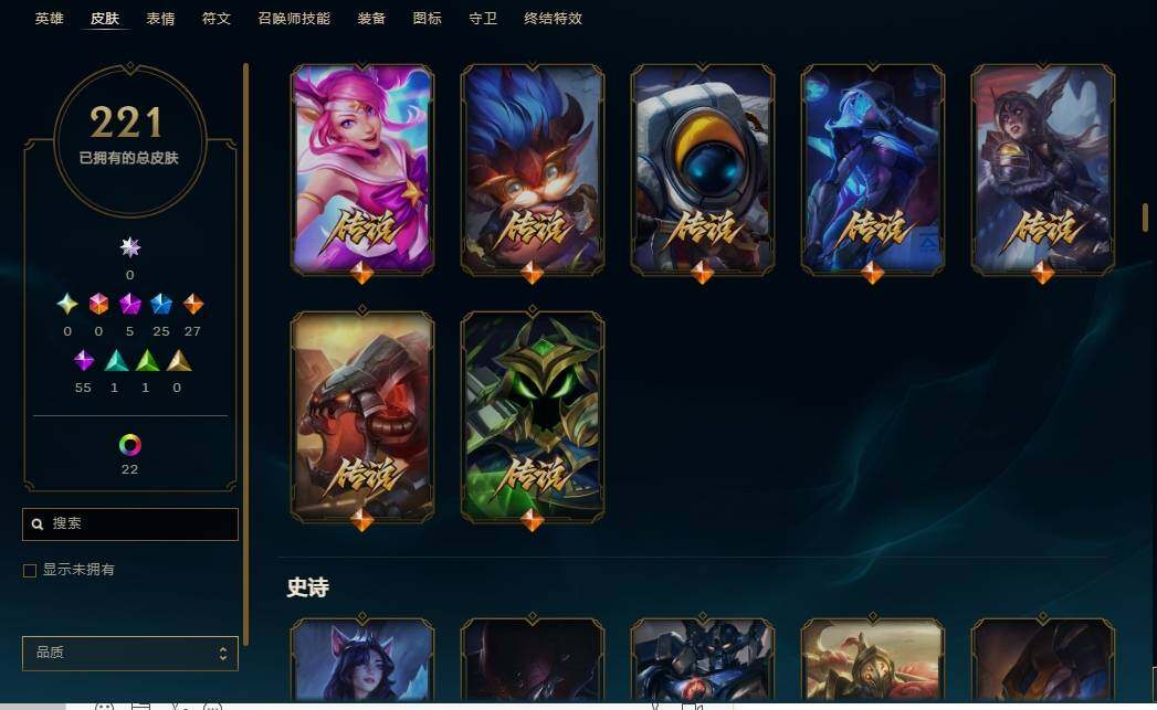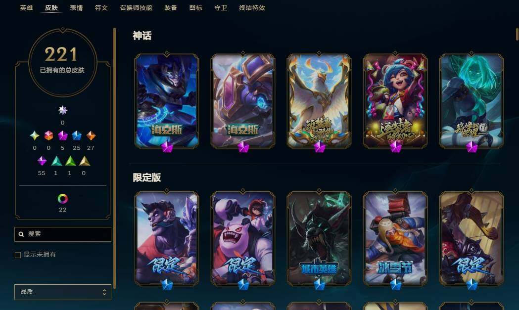 170英雄/221皮肤/5神话/25限定/6臻彩/46炫彩/27传说/55史诗/黑铁