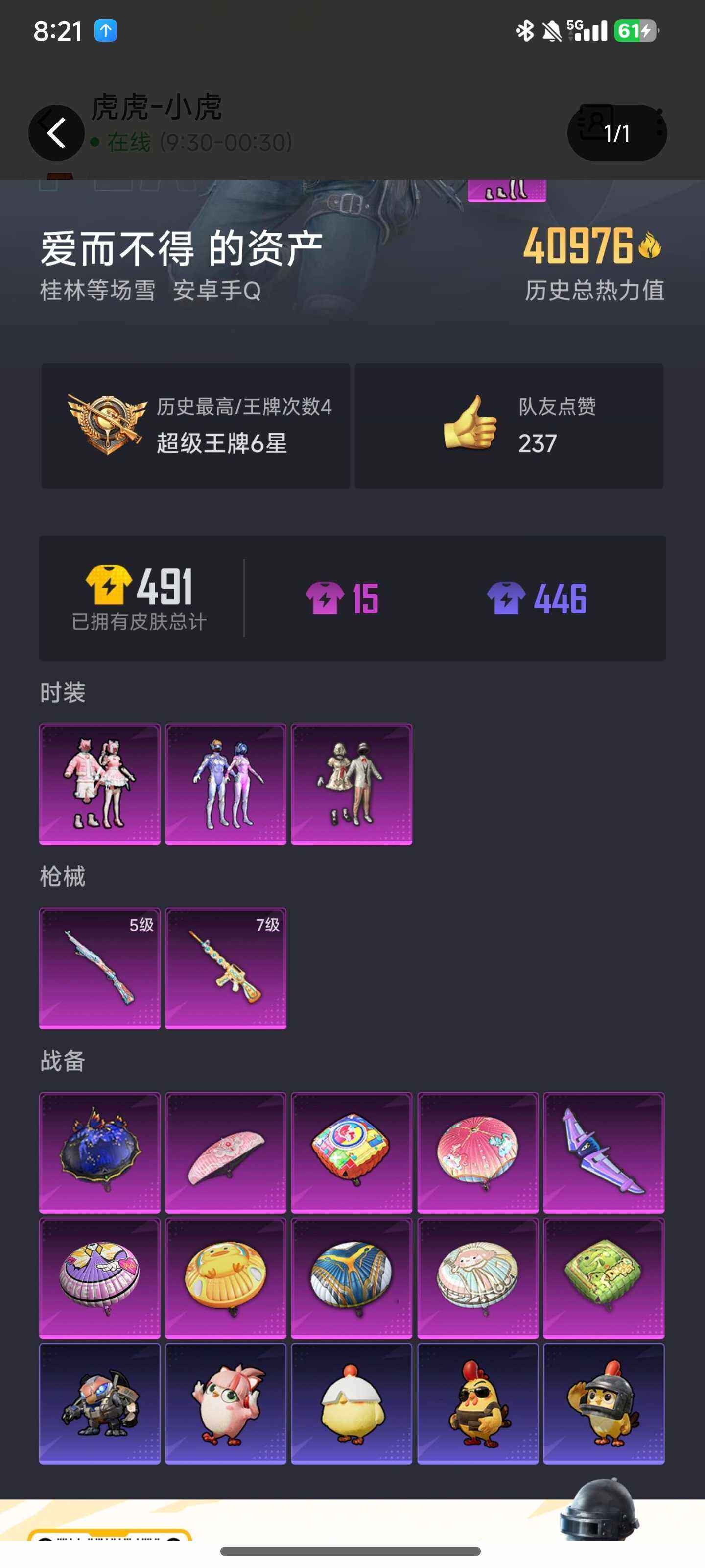 【A1454】安卓【小号/梦幻火箭/3粉装-2满特效枪-1粉色飞行器】 手Q--40976热力值-4王牌印记-111套装-140枪皮