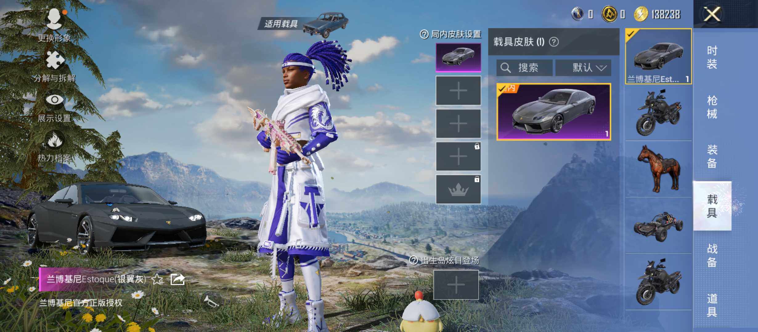 【A1583】安卓 【男神号 梦幻火箭 浪漫天命 新星烈龙 M416-心之恋语(六级) 兰博基尼Estoque(银翼灰)】手Q-6粉装-1特效枪-1载具-2粉色飞行器-26003热力值-2王牌印记-58套装-81枪皮