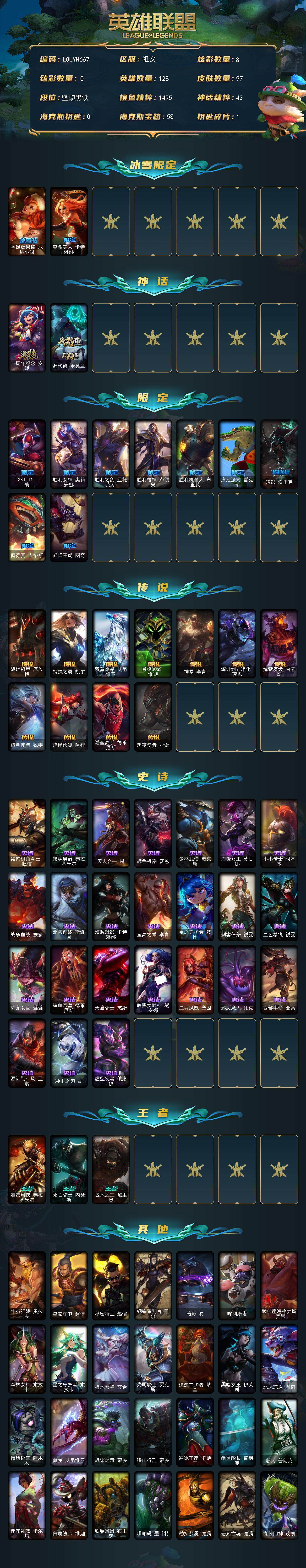 128英雄/97皮肤/2神话/11限定/8炫彩/11传说/24史诗/未定级账号等级:241/