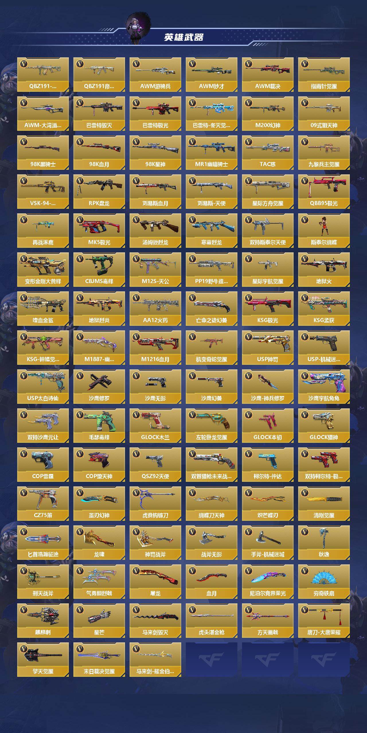 【QZZ2189】VIP7/325V/势至尊/王者之刺/王者之势/王者之影/王者之心/王者之锋/王者之兽/王者之狱/王者之魂/王者之电/王者幻神/王者之霆/M12S-雷霆王者/KSG-孟获/81式-光明之神/MK47-仁德/M4A1-仲达/M4A1-星象/TAC-慈/M200-幻神/AWM-妙才/AWM-游骑兵/COP 357-雷霆/COP 357-堕天神/81式-阿波罗/AN94-盖/幽灵刀锋觉醒/樱/瞳/关小雨/夏日灵狐-X/炽天使-X/祝融夫人/零-新生/虹儿/AK47-无影/AK47-火
