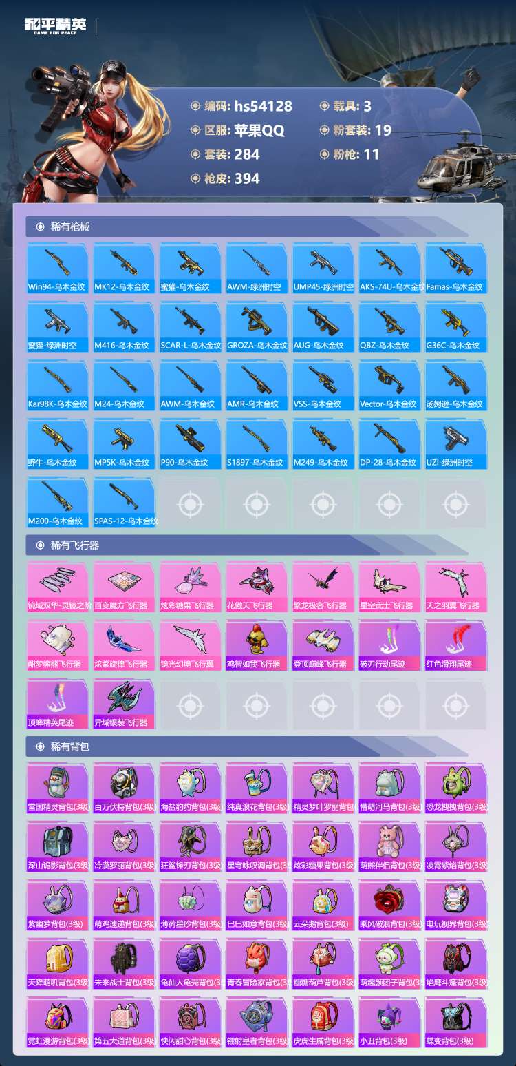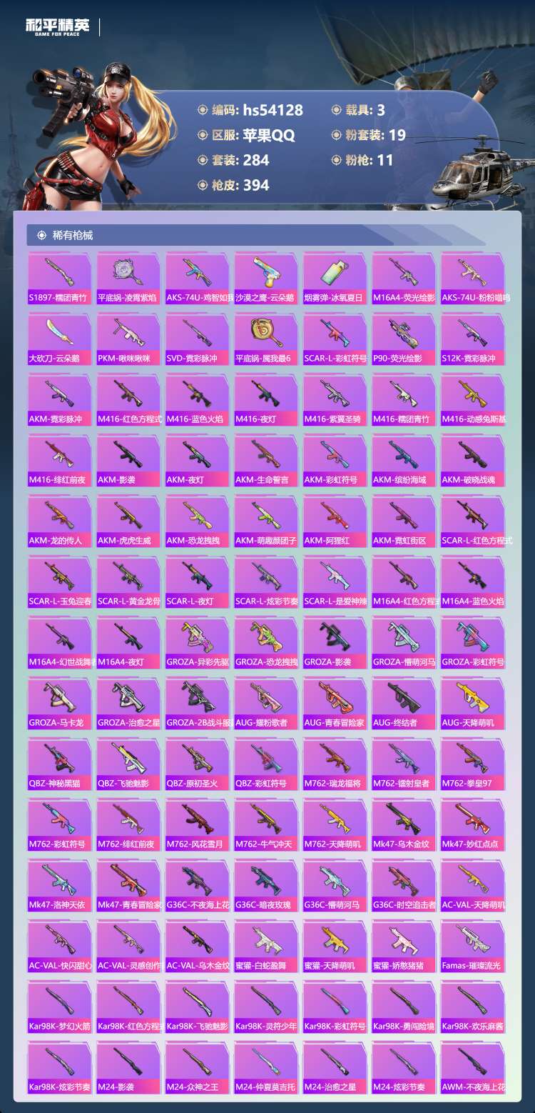 hs54128 苹果手Q-14王牌印记-19粉装-11特效枪-3载具-131602热力值-284套装