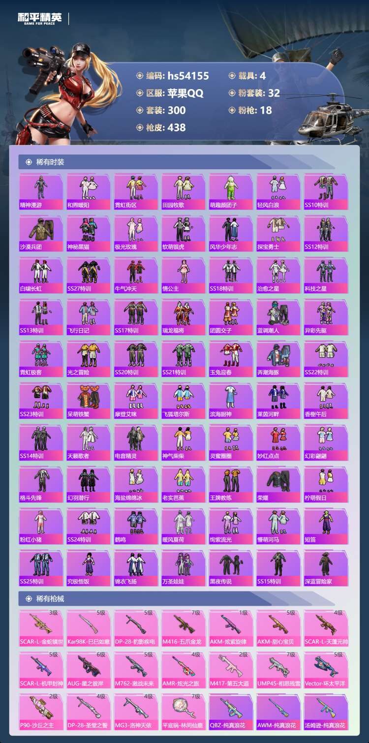 hs54155 苹果手Q-22王牌印记-1红装-32粉装-18特效枪-4载具-157858热力值-3