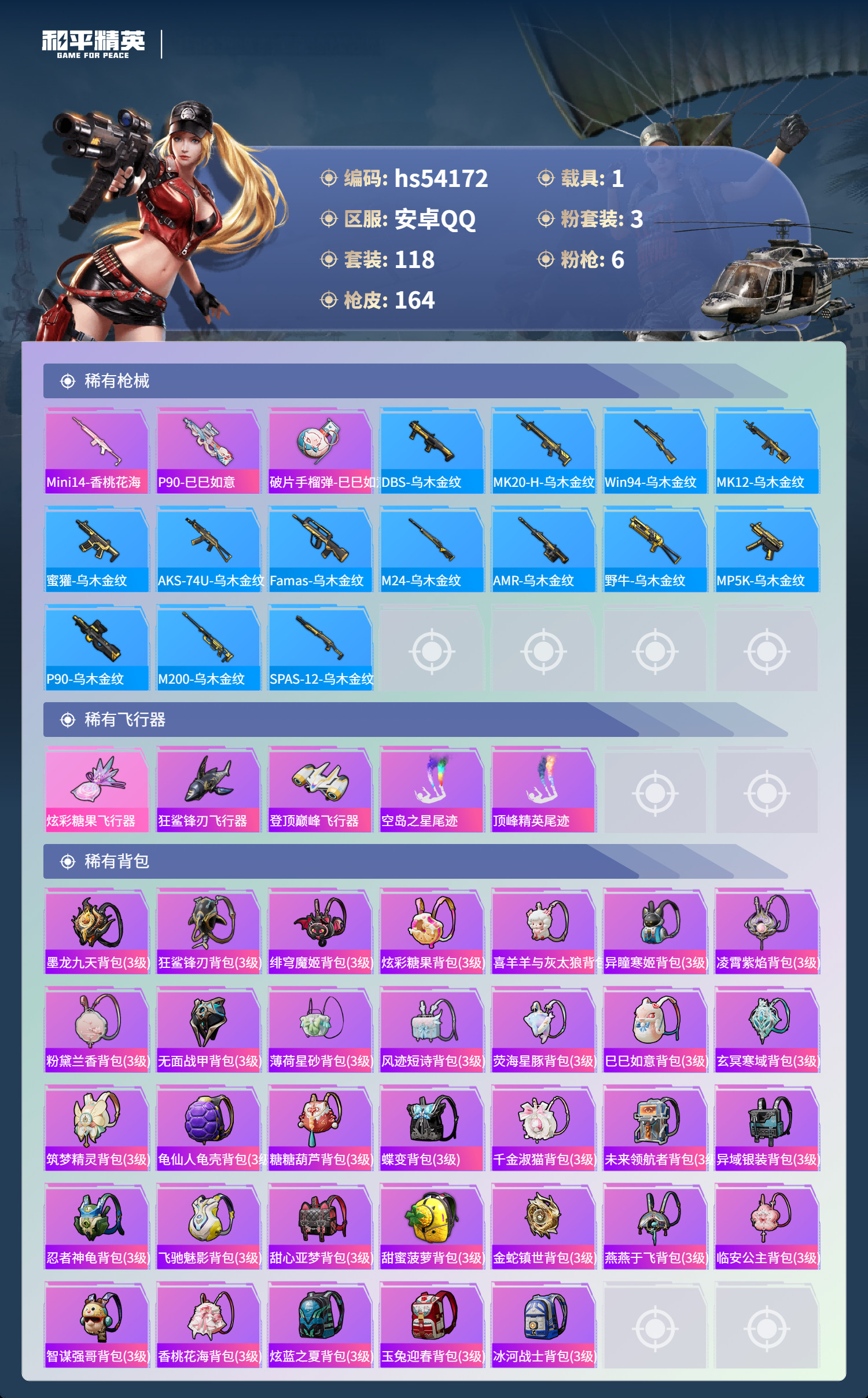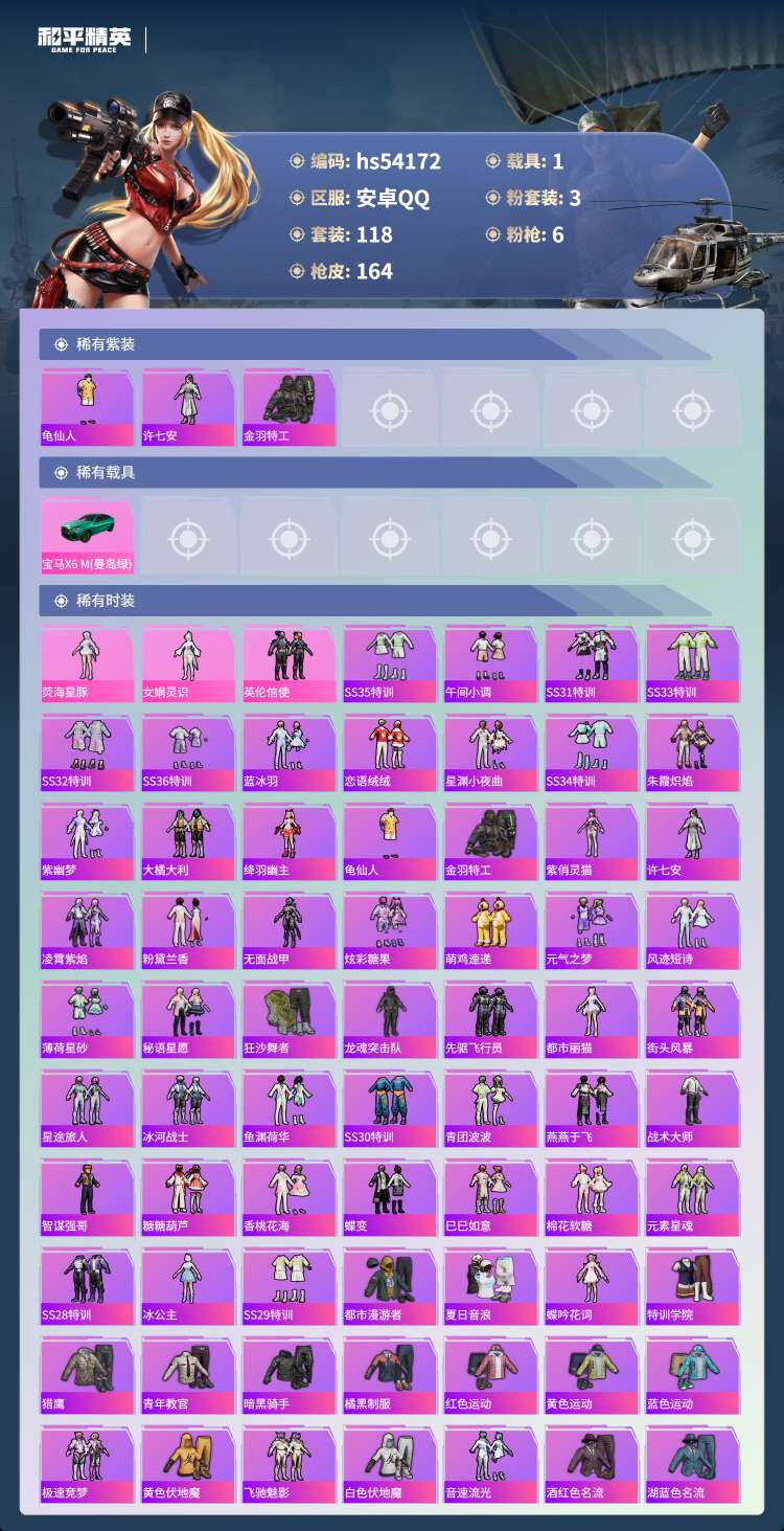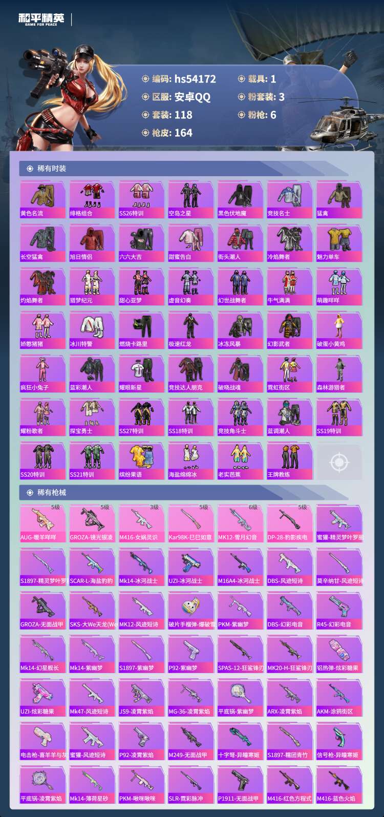 hs54172 安卓手Q-8王牌印记-3粉装-6特效枪-1载具-47376热力值-118套装-164
