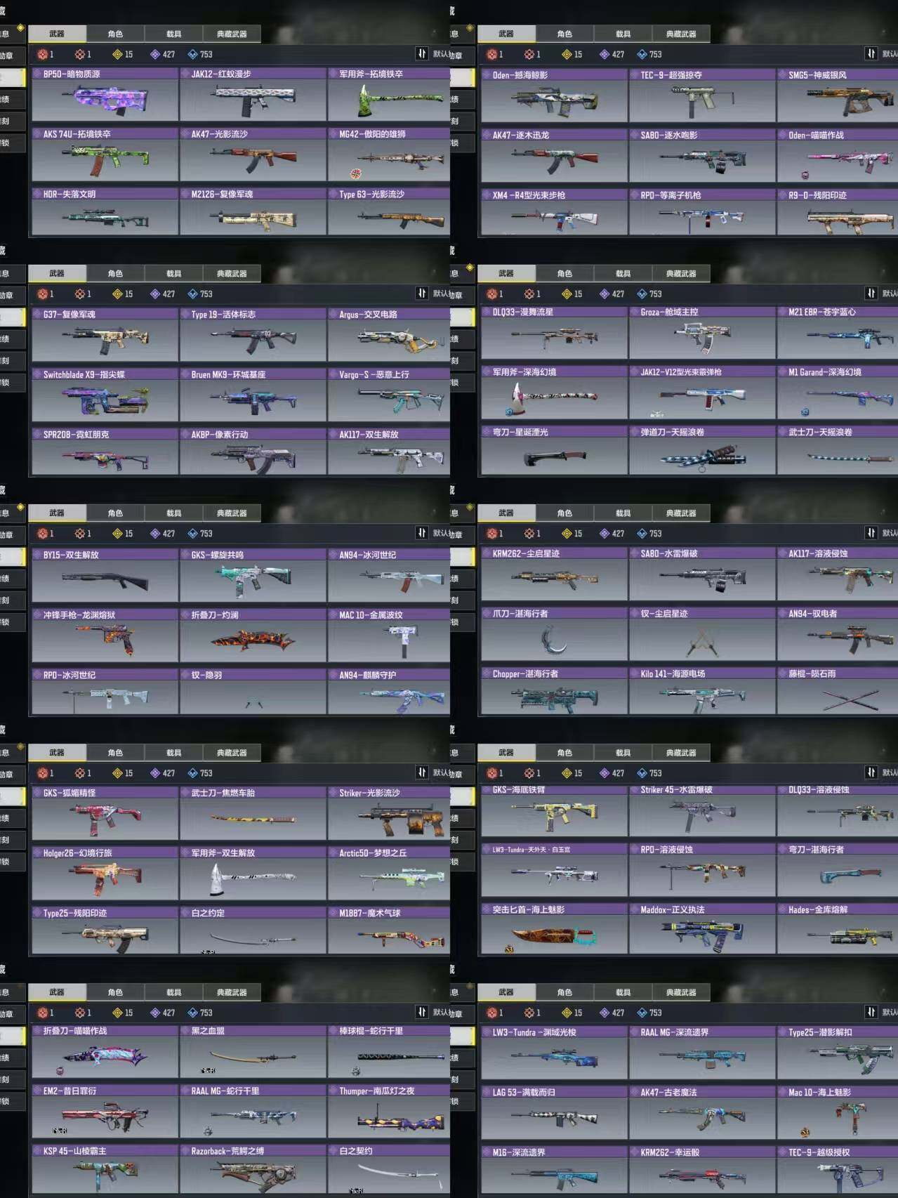 x39,1神话满级熔岩,15传说427传说红色彗星钻皮火箭炮深红地隙神灯灵愿一路悠扬神灯灵愿星彩乐手愚人小丑,AK117-熔岩,电棍-永恒炽热,CR56-回音律动,G37-群山灿阳,SA80-狂暴冲锋,M4-皇家黑魂,AK47-火箭炮, FFAR 1-星彩乐手, RPD-一路悠扬 , DLQ33-狂热祈愿