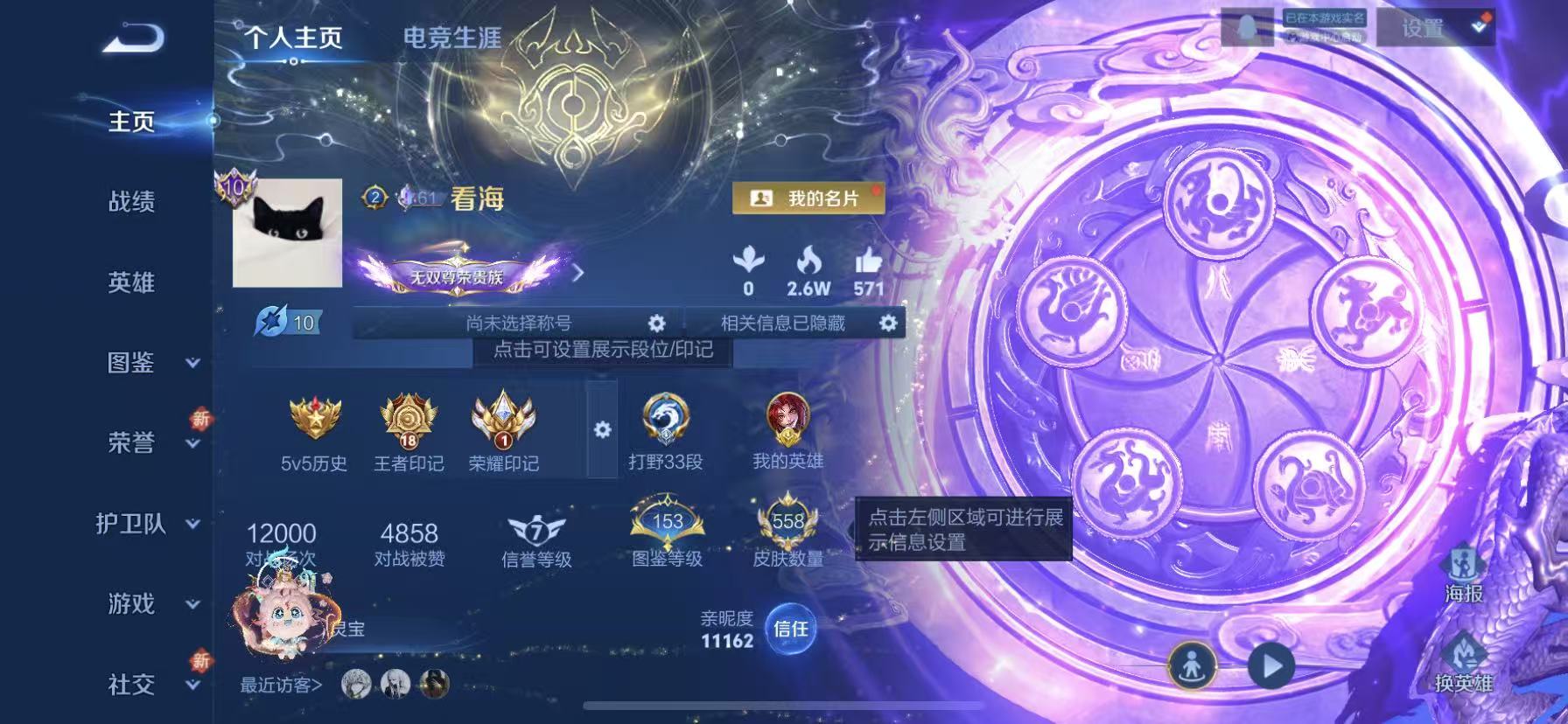 无双贵族到1.1/双天幕/金标白虎志皮肤数量558印记总数1