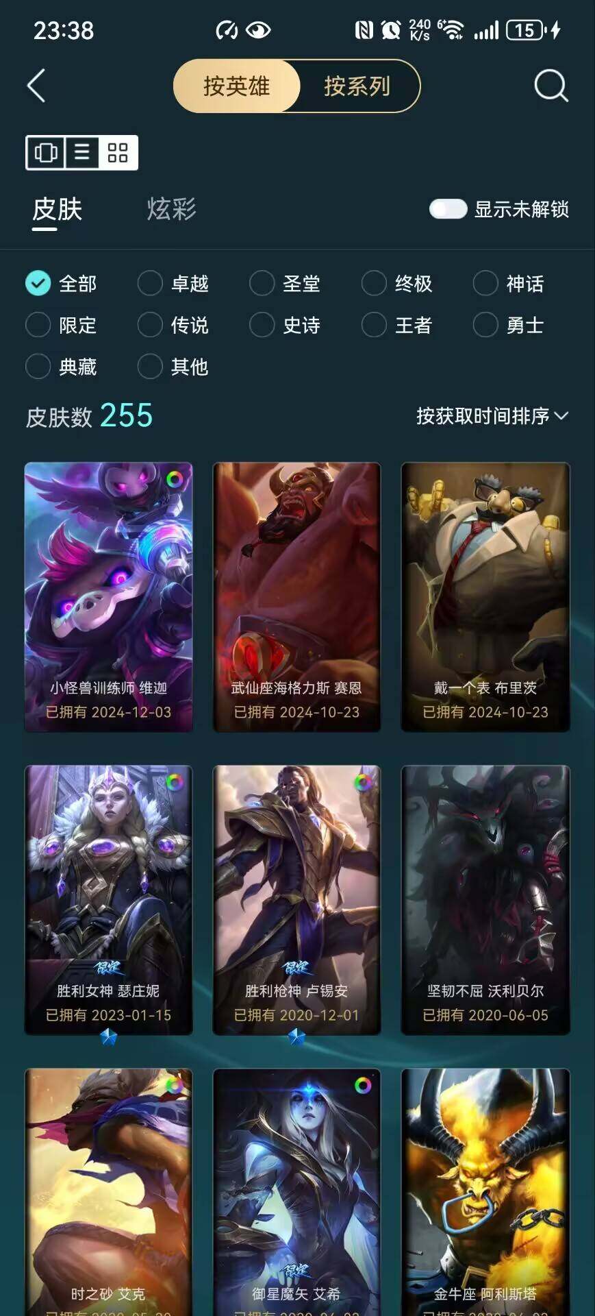 未定级段位-101英雄-255皮肤-19炫彩-0终极-1神话-52限定-21传说-75史诗