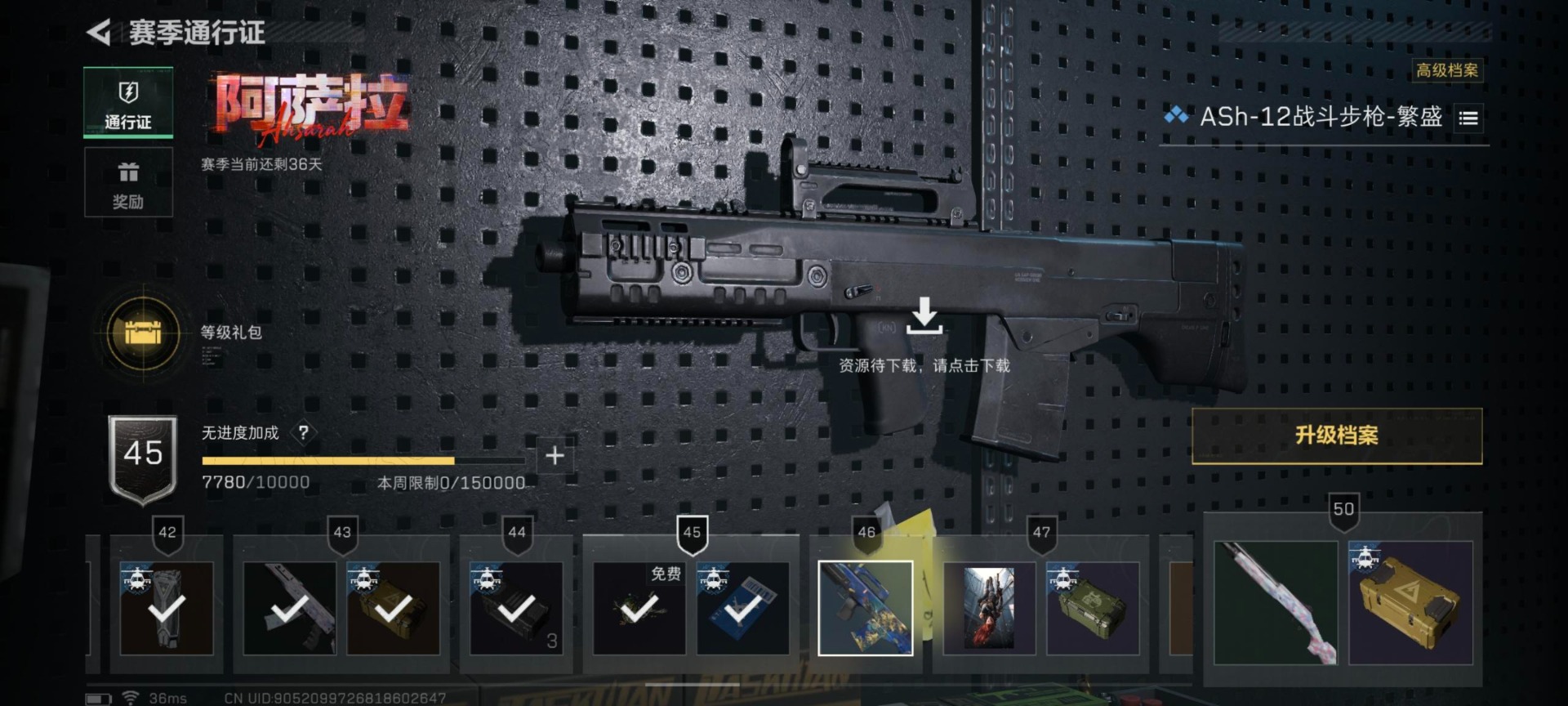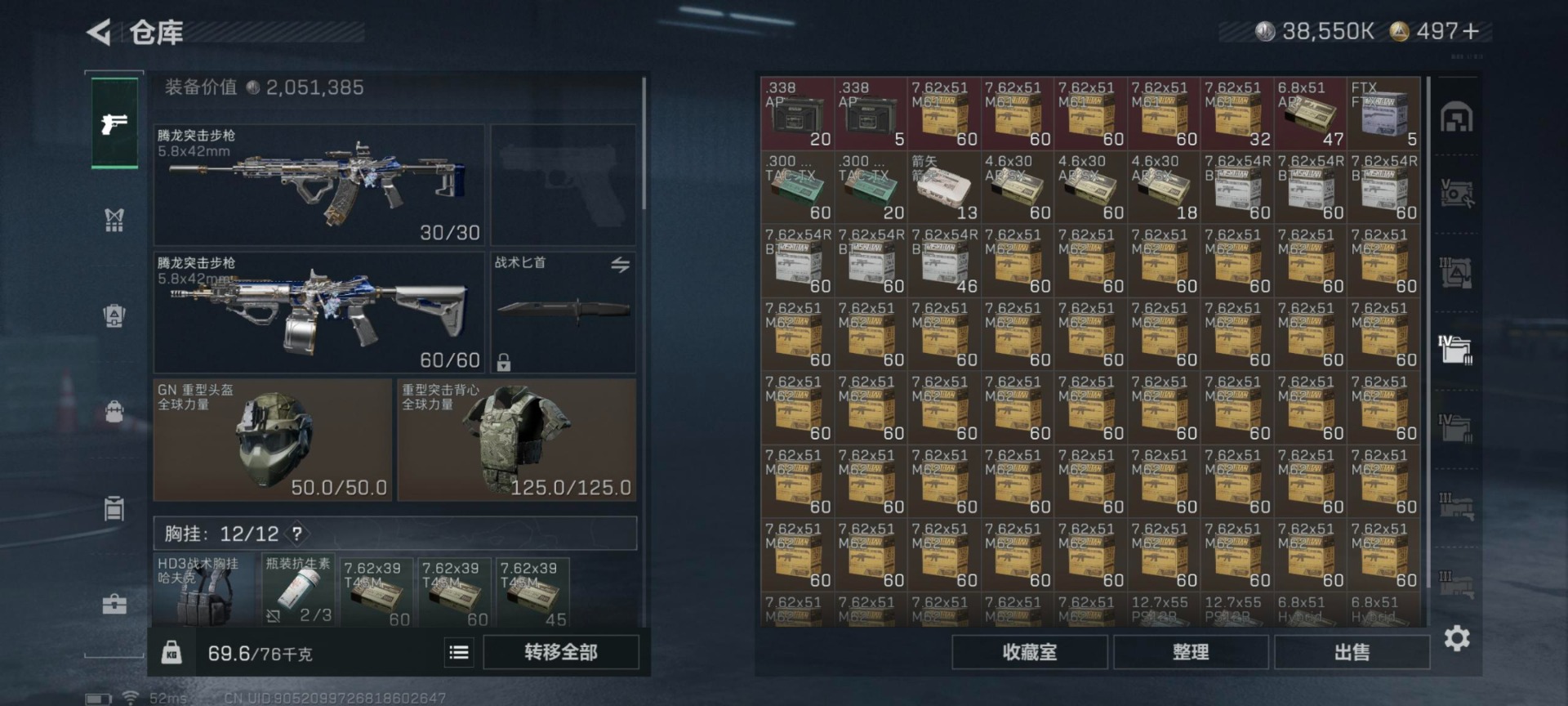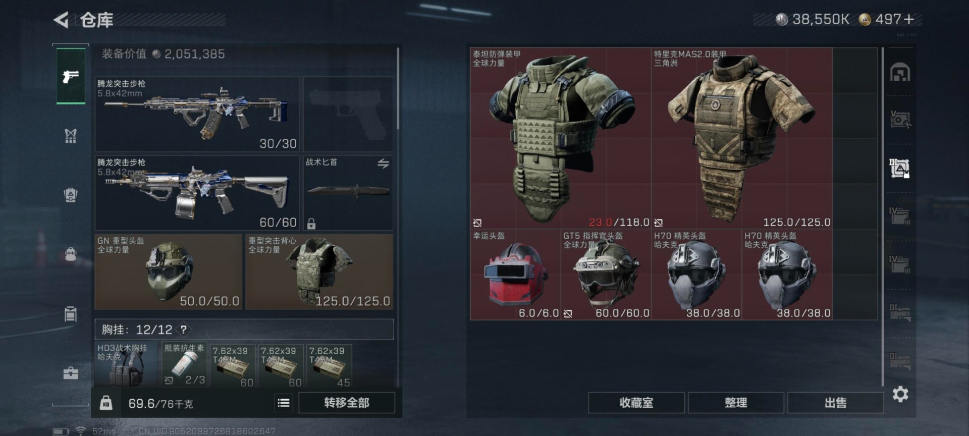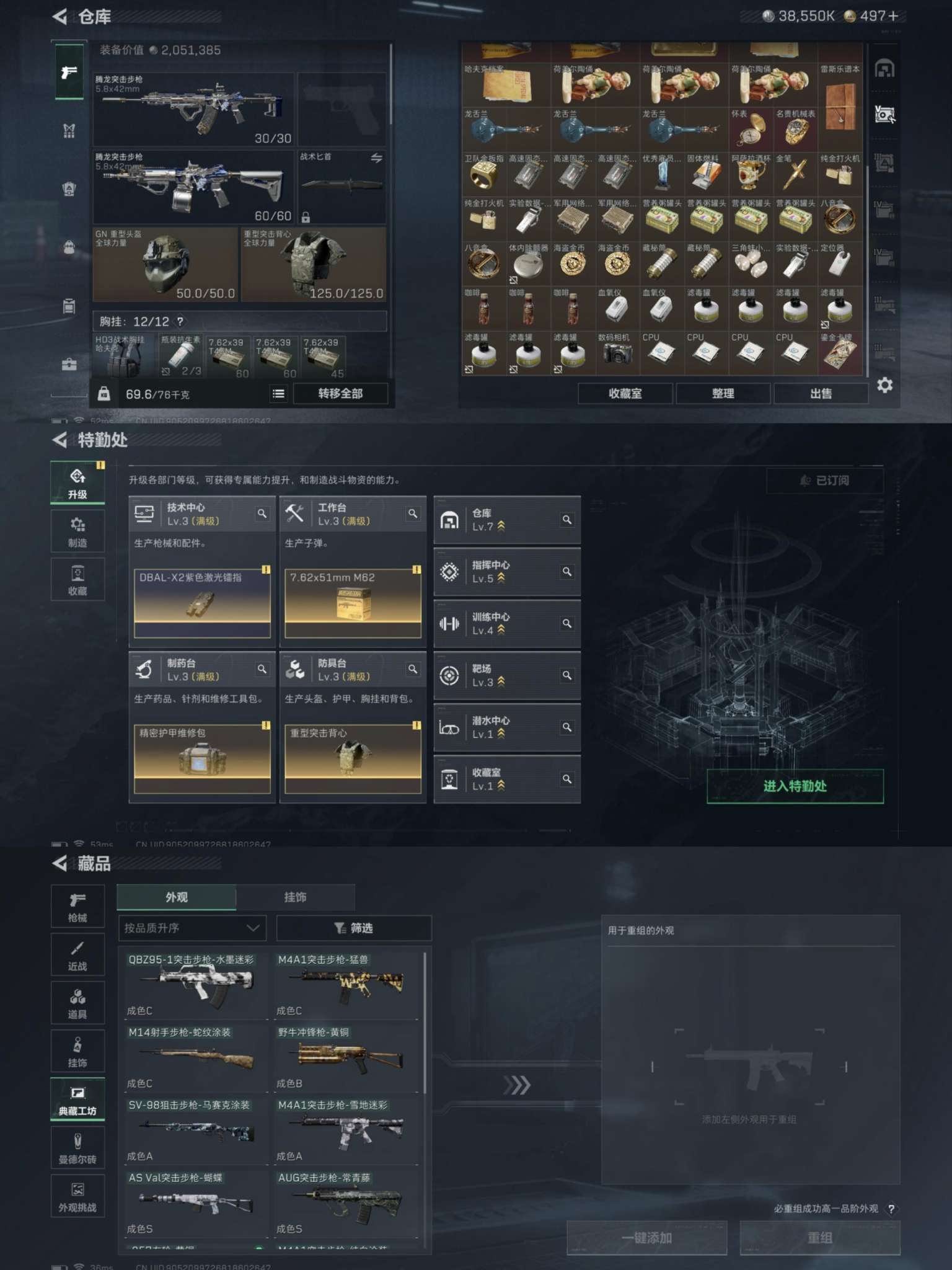总资产:208.5M 6干员外观 23传说枪械 高级安全箱(2*3)1.28号到期 哈夫币:38.5