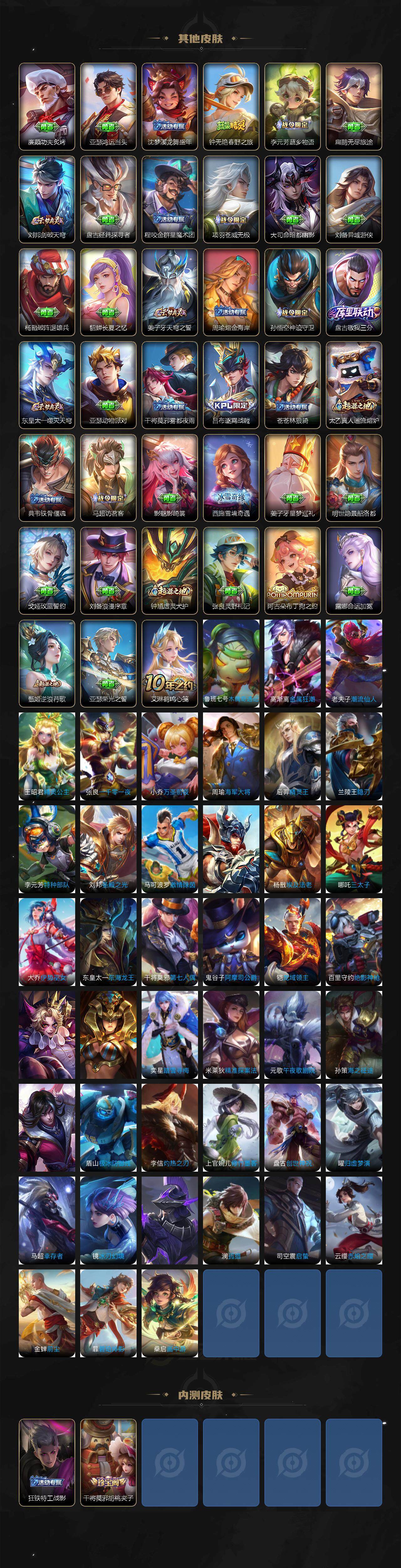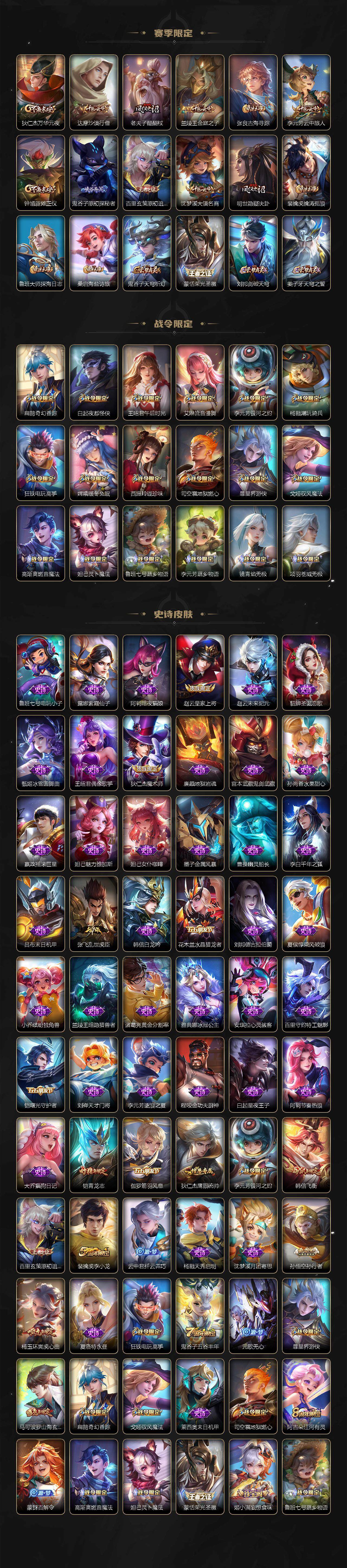 【传说皮肤】:后羿神树通天,司空震愿照山河定,澜愿照九州拓,虞姬愿照岁时盈,云缨幻光神枪,桑启鸣野蒿,亚连落雪白狼,吕布曦玄引,孙尚香乘龙问璇玑,孙策乘龙淬吴钩,赵云乘龙铭钟鼎,澜电玩雷克斯,李信山