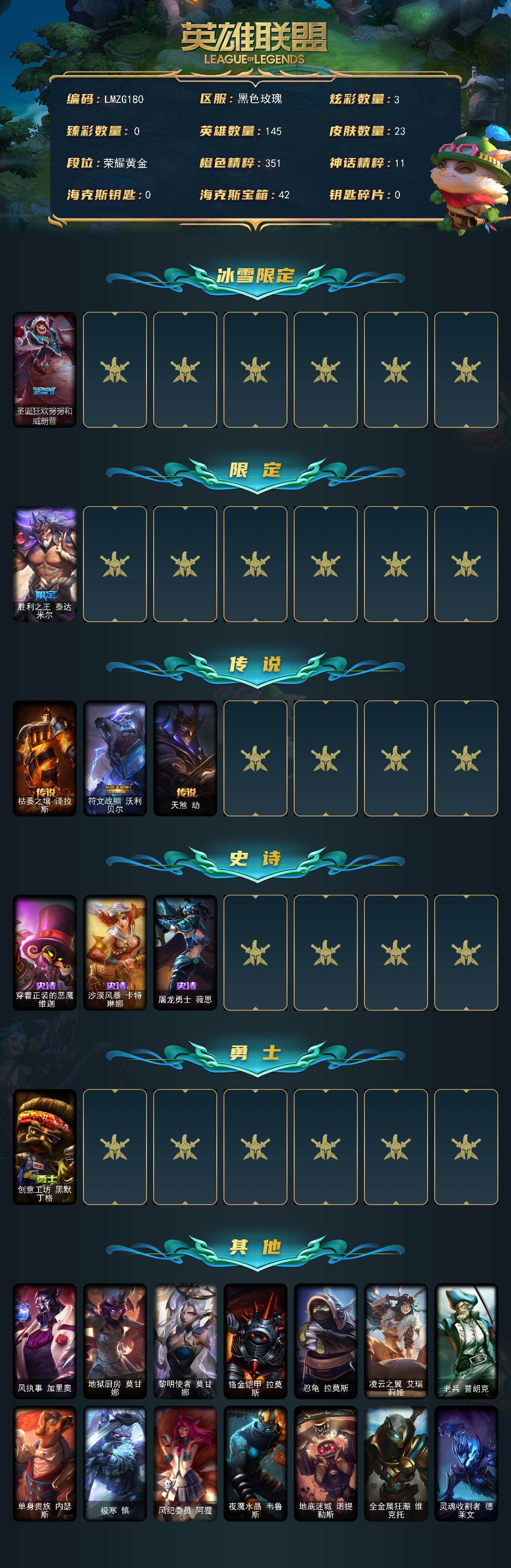 【LMZG180】145英雄/23皮肤/2限定/3炫彩/3传说/3史诗/黄金/圣诞狂欢努努和威朗普/胜利之王泰达米尔/枯萎之壤泽拉斯/符文战熊沃利贝尔/天煞劫/穿着正装的恶魔维迦/沙漠风暴卡特琳娜/屠龙勇士薇恩/创意工坊黑默丁格/风执事加里奥/地狱厨房莫甘娜/黎明使者莫甘娜/铬金铠甲拉莫斯/忍龟拉莫斯/凌云之翼艾瑞莉娅/老兵普朗克/单身贵族内瑟斯/极寒慎/风纪委员阿狸/夜魔水晶韦鲁斯/地底迷城诺提勒斯/全金属狂潮维克托/灵魂收割者德莱文