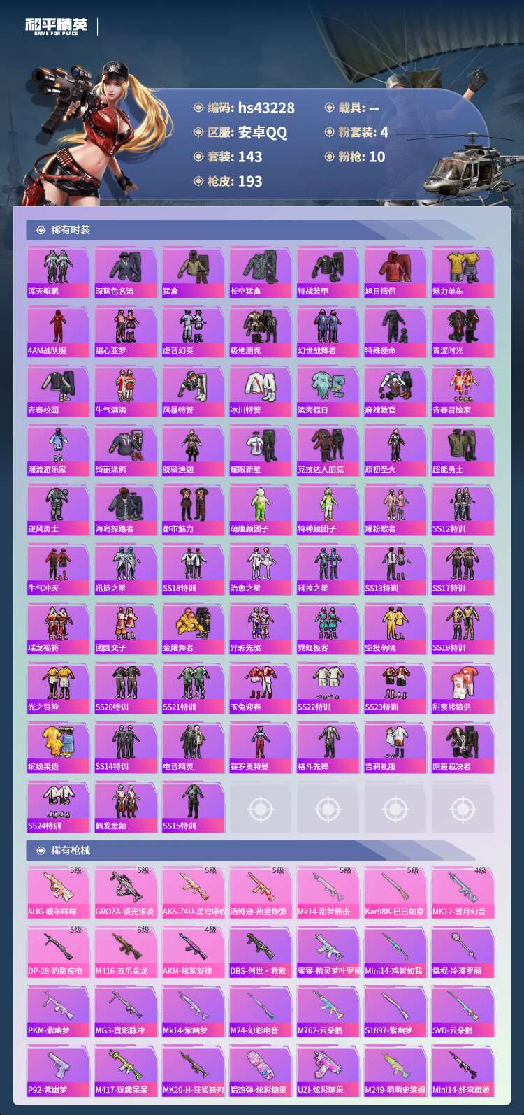 12王牌印记-4粉装-10特效枪-62362热力值-143套装-193枪皮-4卓越印记-2传奇印记【
