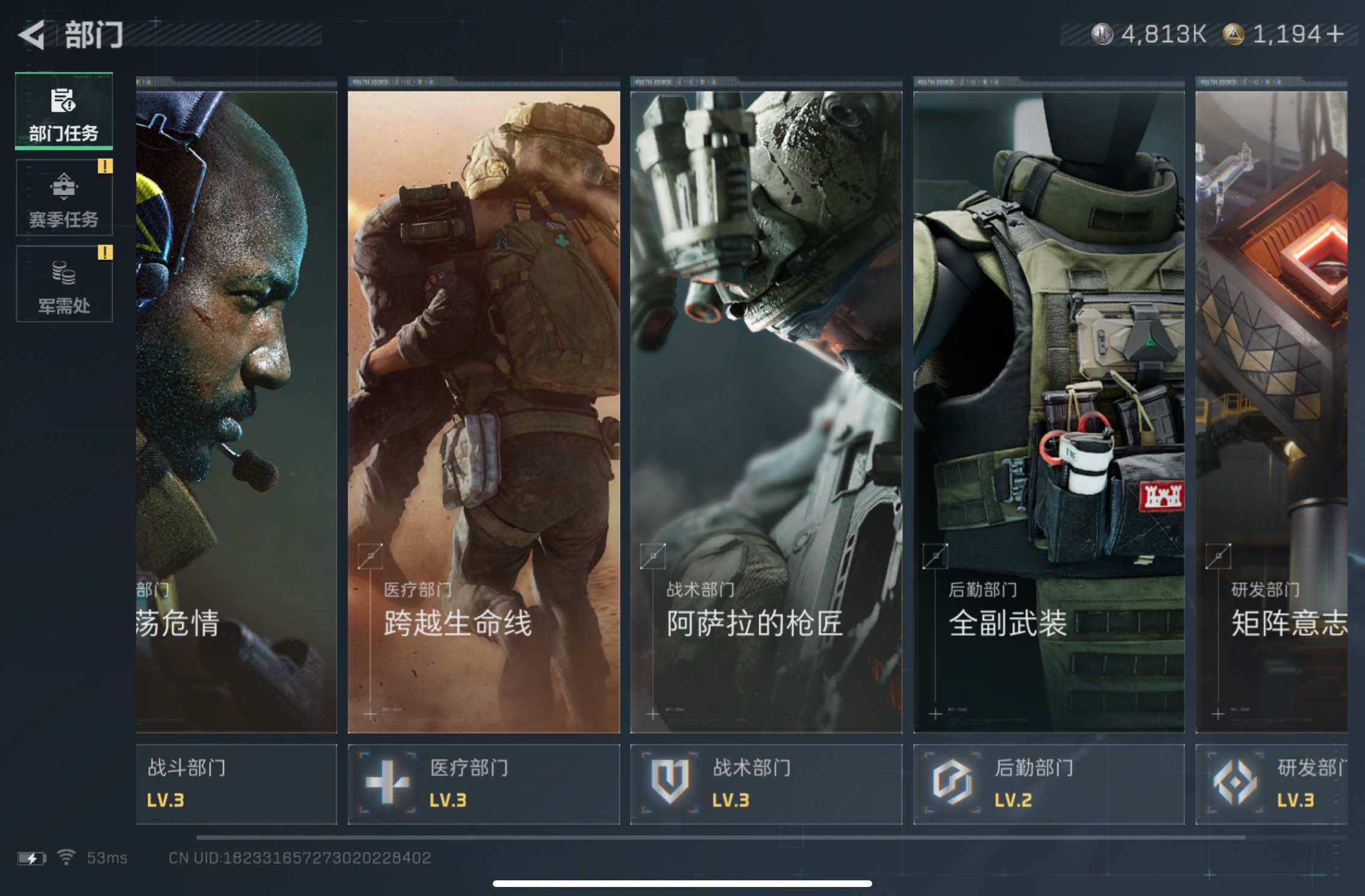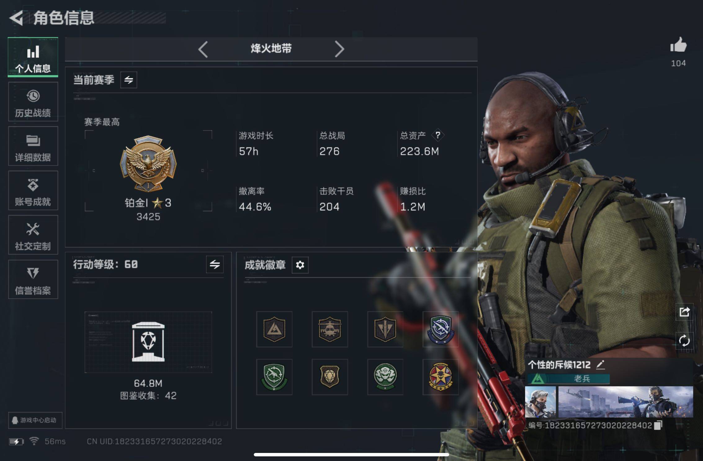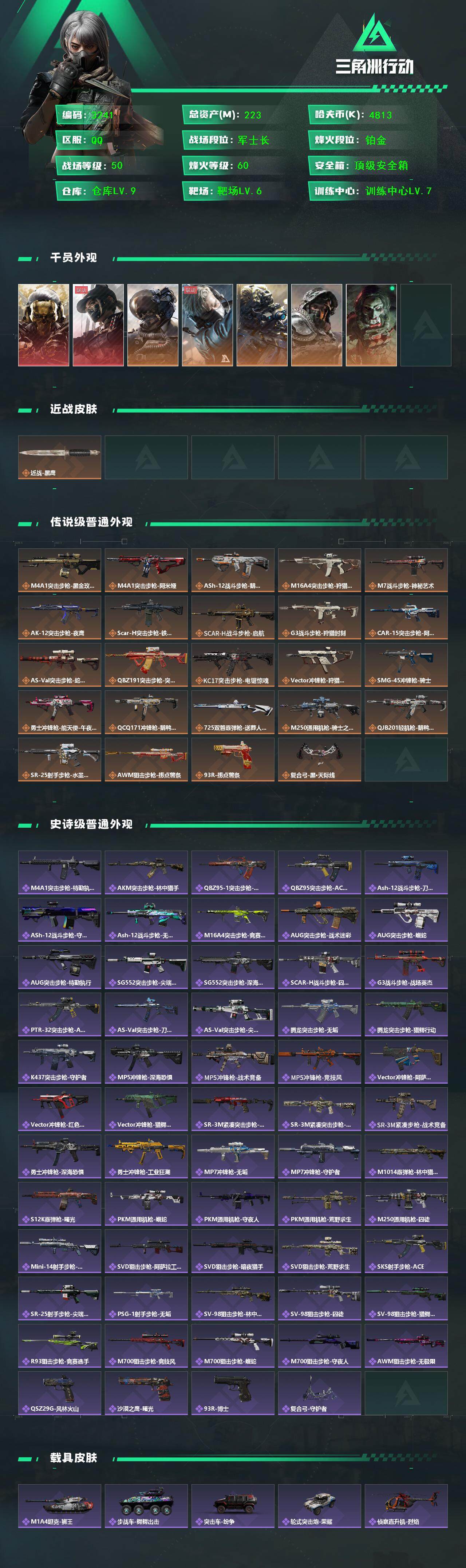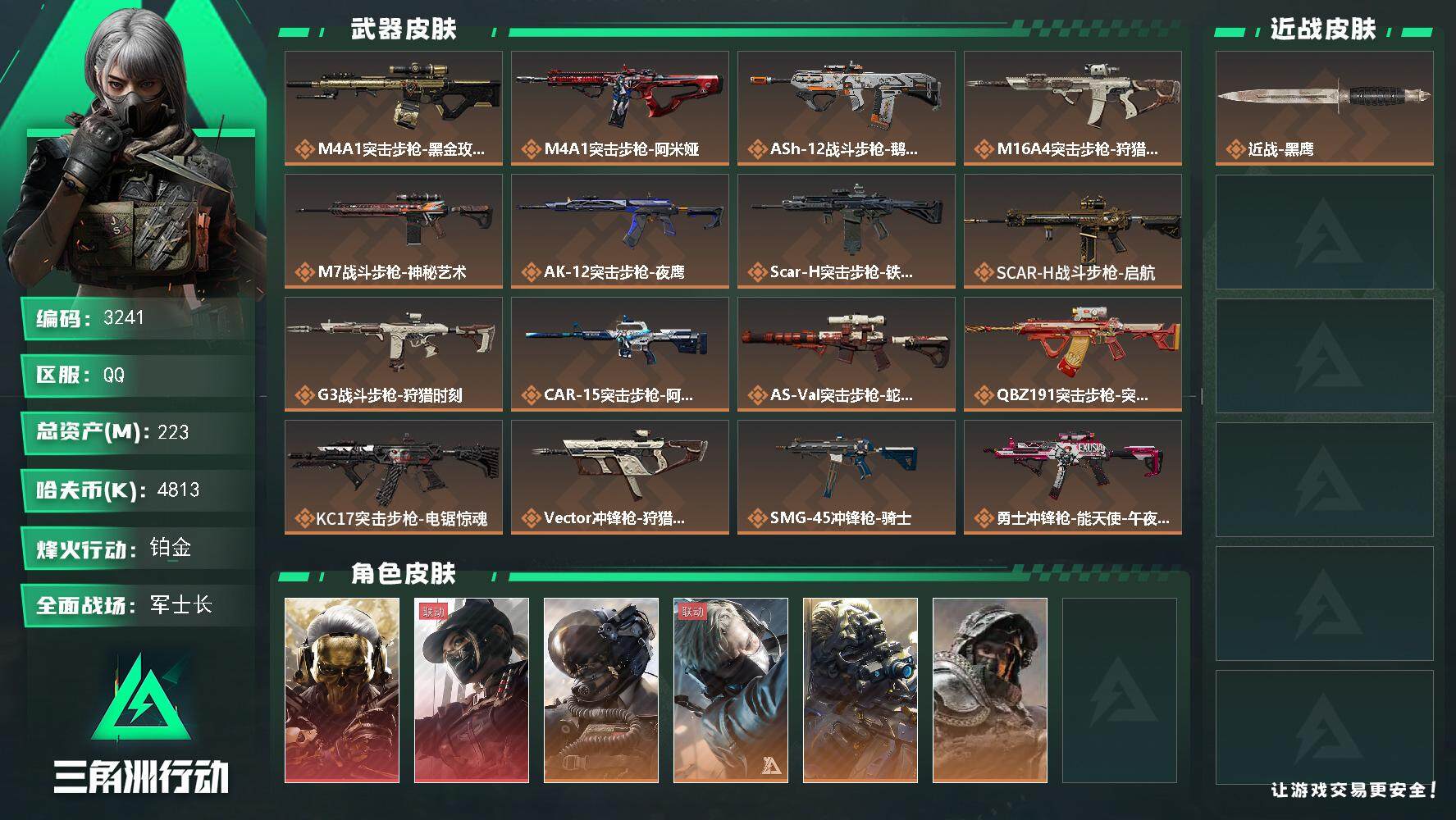 总资产223M/哈夫币4813k/赛季3*3,红狼-蚀金玫瑰,露娜-黑·天际线,威龙-壮志凌云,蜂医