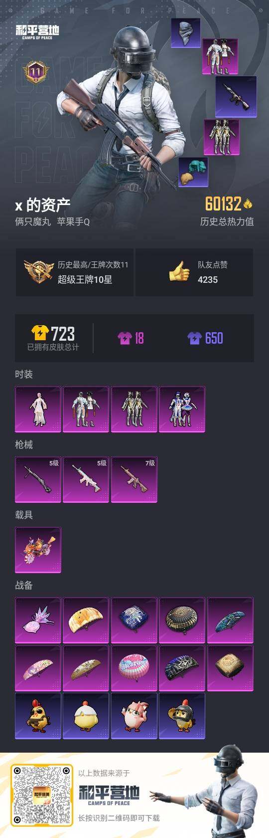【A1458】苹果【男神号 智能音符 星空之魅 绚金战神 烟云彩露 ,M416-心之恋语(七级 鬼马风驰】手Q-4粉装-3特效枪-1载具-1粉色飞行器-60132热力值-11王牌印记-185套装-194枪皮