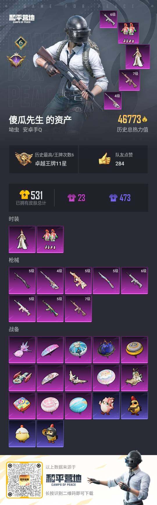 【A1589】安卓【男神号 炫光之旅 萨利娅 SCAR-L-纯梦嫁纱(六级) M416-心之恋语(七级) 】 手Q-2粉装-8特效枪-0载具-4粉色飞行器-46773热力值-6王牌印记-94套装-155枪皮