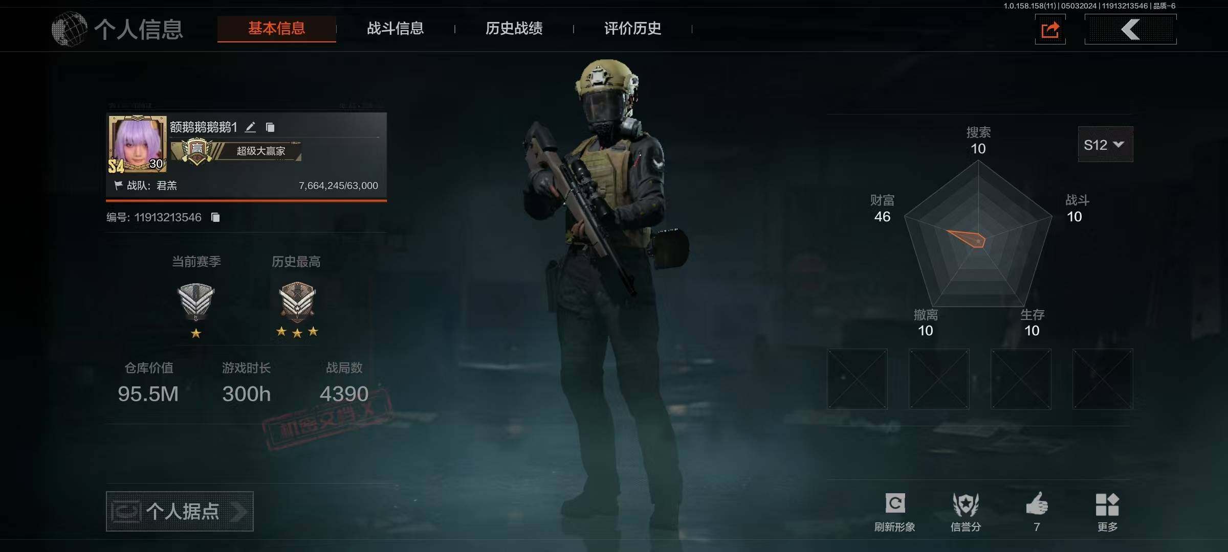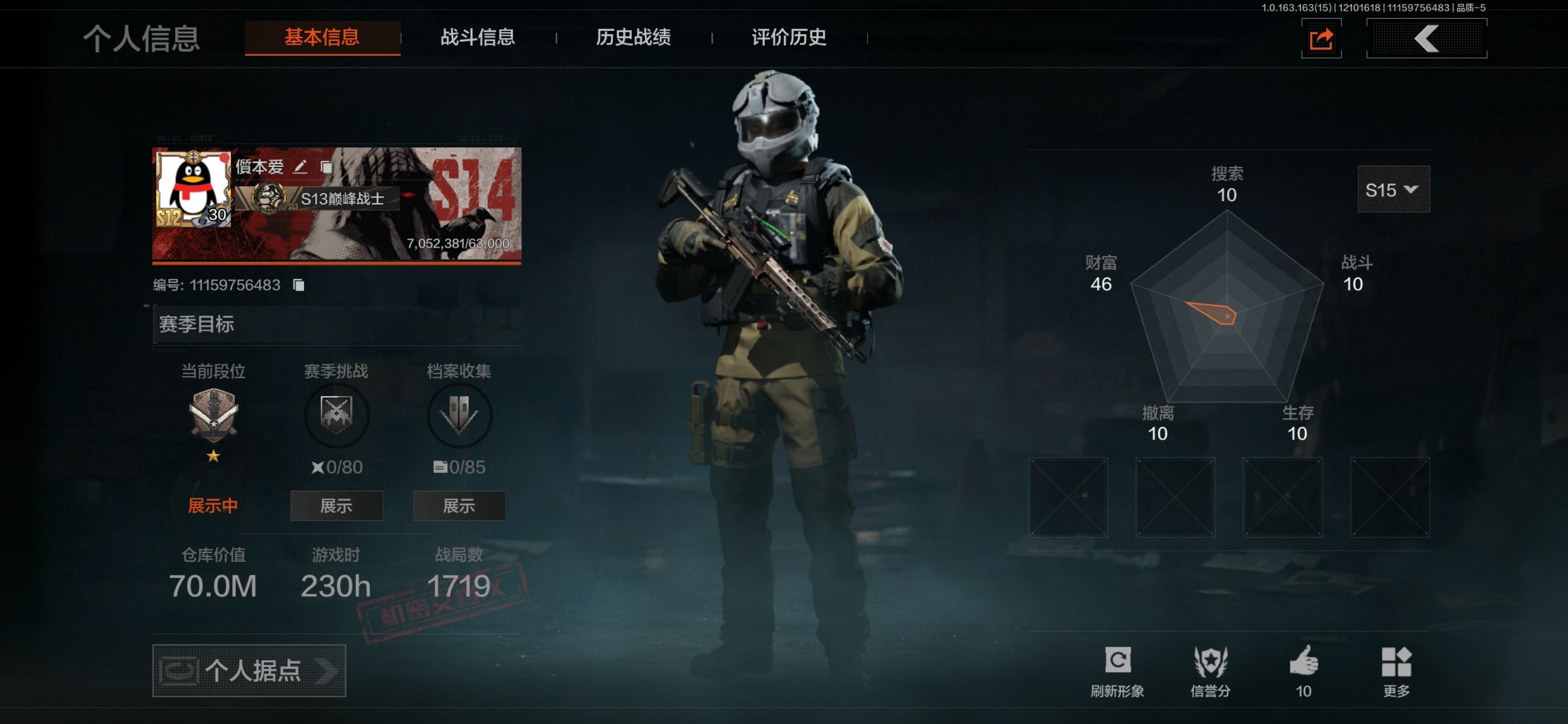 FY5862,总资产:70m,近战武器:赢家匕首,角色装扮(紫):三周年·卫衣,暗区无限·联动夹克衫,几何棱彩·上衣,都市夜影套装,金色枪皮:告丧夜曲·AUG,旧王圣谕·VSS,旧王圣谕·QBZ191,紫色枪皮:鱼跃丹青·AK102,典礼武备·Groza,棱光裂变·莫辛,秘域鎏金·RPK16,典礼武备·MK14,鱼跃丹青·QBU191,莫克斯·M24,大金: