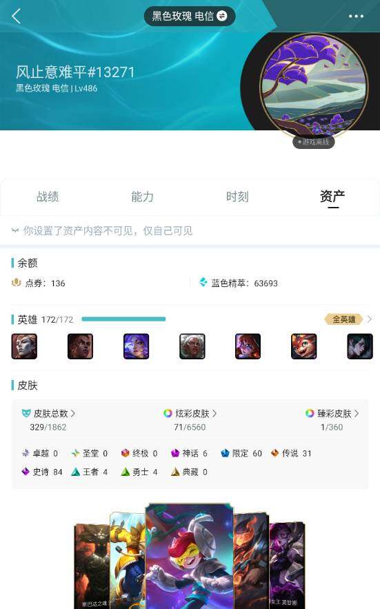 黄金段位-172英雄-329皮肤-71炫彩-0终极-6神话-60限定-31传说-84史诗