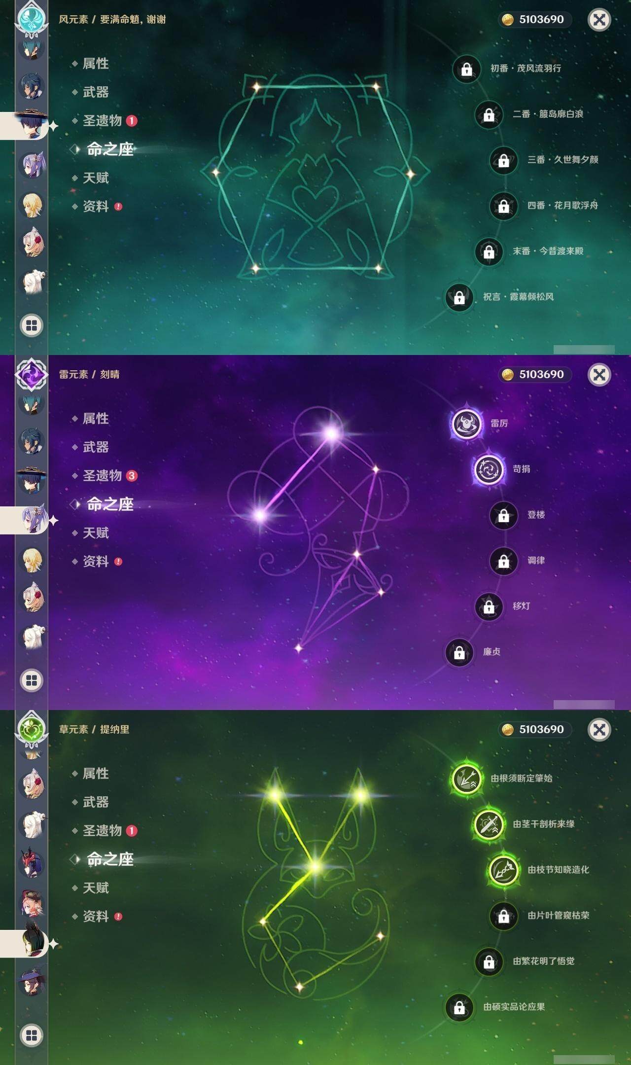 0命阿蕾奇诺,0命流浪者,1命纳西妲,3命提纳里,2命八重神子,0命荒泷一斗,0命雷电将军,0命枫原万叶,0命胡桃,0命甘雨,1命魈,0命宵宫,2命刻晴,2命七七,4命琴,1命莫娜,0命迪卢克,精1苇海信标,精1若水,精1神乐之真意,精1赤角石溃杵,精1和璞鸢,精1阿莫斯之弓