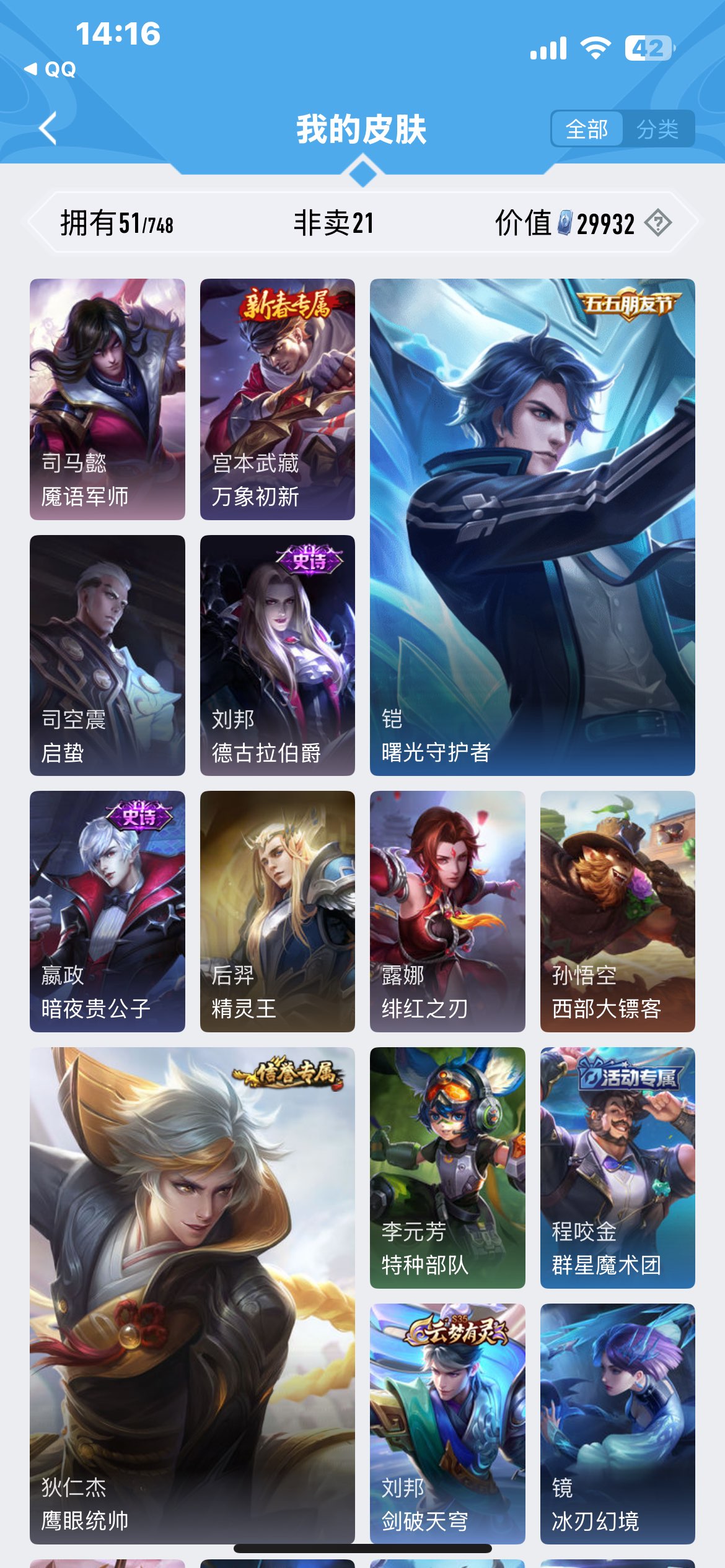 安卓QQ-3传说-51皮肤-85英雄-尊贵铂金-李逍遥云鹰飞将孙策花嫁打野号