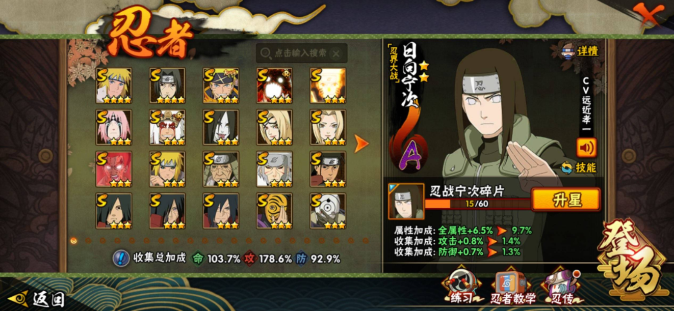 【S级忍者】宇智波带土「忍界大战」(3星),迈特凯「死门」(3星),大筒木舍人「最终章」(3星),漩涡鸣人「暴怒·第六尾」(3星),宇智波斑「秽土转生·解」(3星),春野樱「