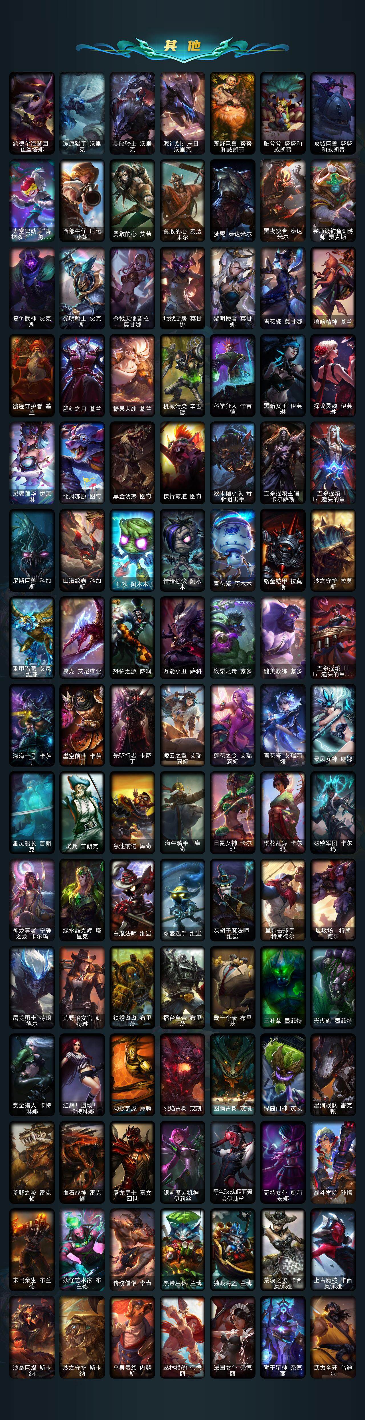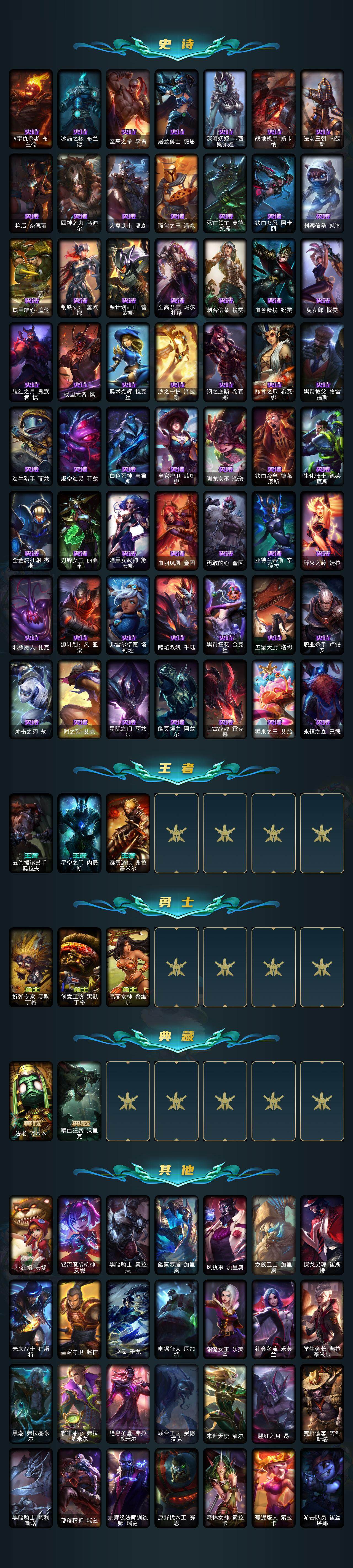 172英雄/463皮肤/12神话/81限定/9臻彩/268炫彩/34传说/98史诗