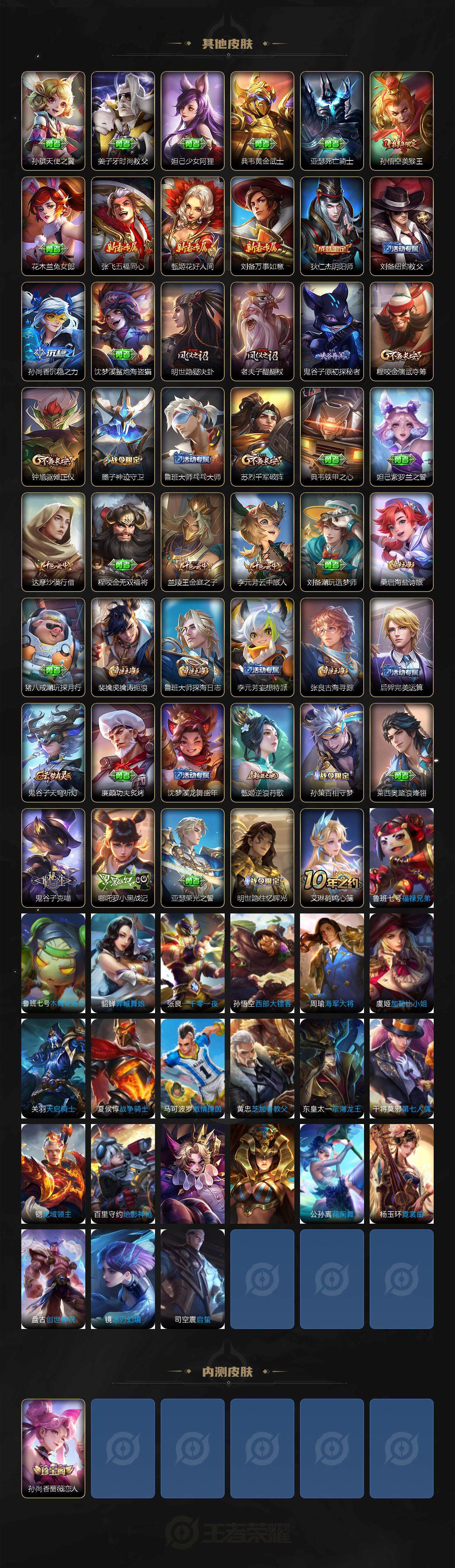 【限定皮肤】:狄仁杰阴阳师,赵云皇家上将,墨子神迹守卫,孙尚香蔷薇恋人,庄周高山流水,达摩沙漠行僧,项羽海滩派对,老夫子醍醐杖,老夫子航海奇遇记,程咬金演武夺筹,兰陵王金庭之子,孙悟空美猴王,孙悟空至尊宝,李元芳云中旅人,钟馗驱傩正仪,鬼谷子原初探秘者,苏烈千军破阵,百里玄策原初追逐者,明世隐疑决卦,裴