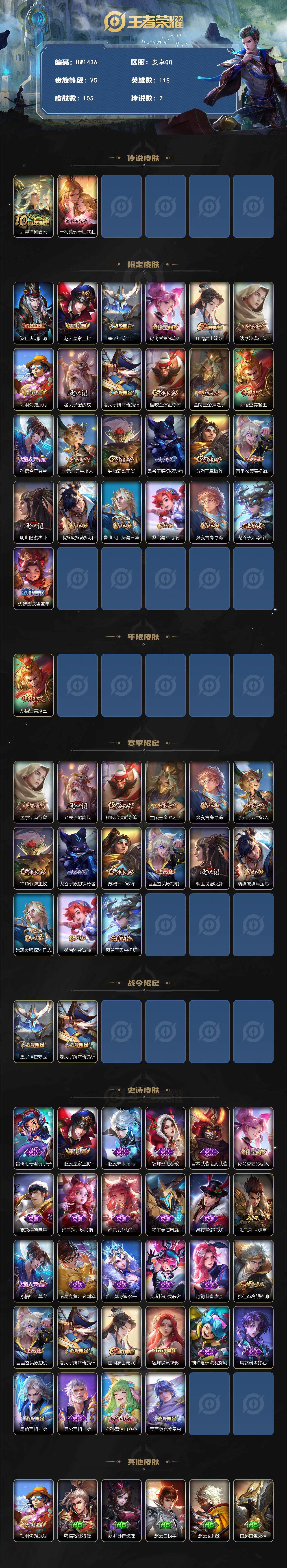 安卓QQ-2传说-105皮肤-118英雄-荣耀王者-至尊宝 美猴王 千山共赴 105皮肤2传说28史诗 神树通天【限定皮肤】:狄