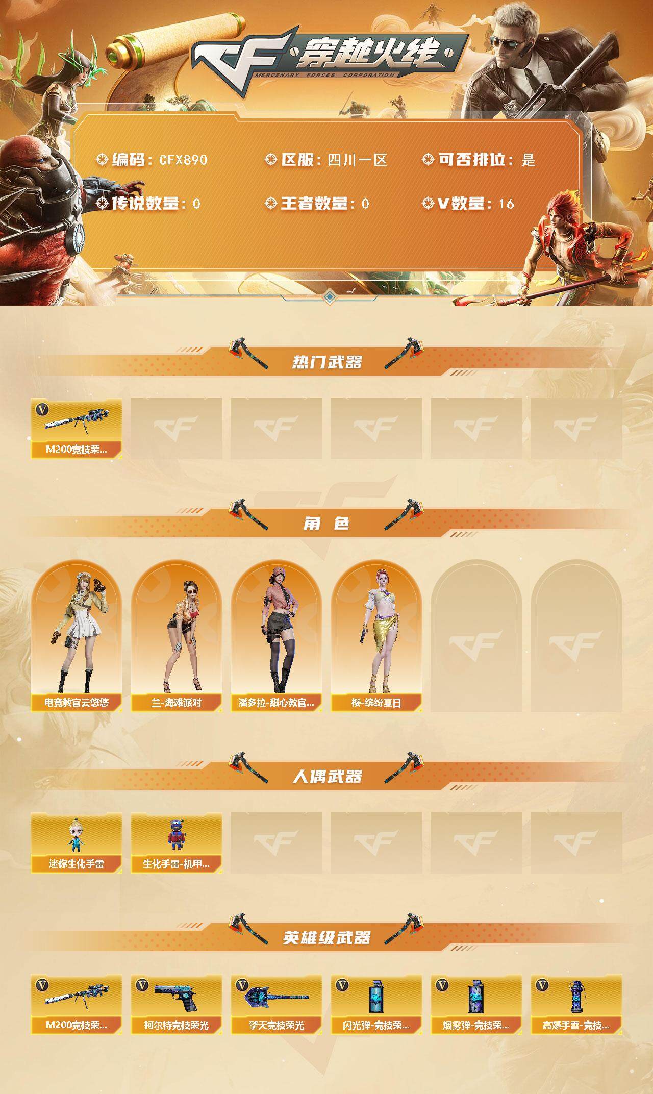 【CFX890】14V/51级/尉官/2英雄/M200_竞技荣光/电竞教官云悠悠/兰-海滩派对/潘多拉-甜心教官/樱-缤纷夏日/迷你生化手雷/生化手雷-机甲核心/柯尔特_竞技荣光/擎天-竞技荣光/高爆手雷-竞技荣光/闪光弹-竞技荣光/烟雾弹-竞技荣光/CFS限定背包/绿色巨人/灵魂忍者/迷雾幽灵/夺命之镰/防化服/枪王排位29赛季金色流光/防弹头盔/防弹衣/C4工具钳/手雷包