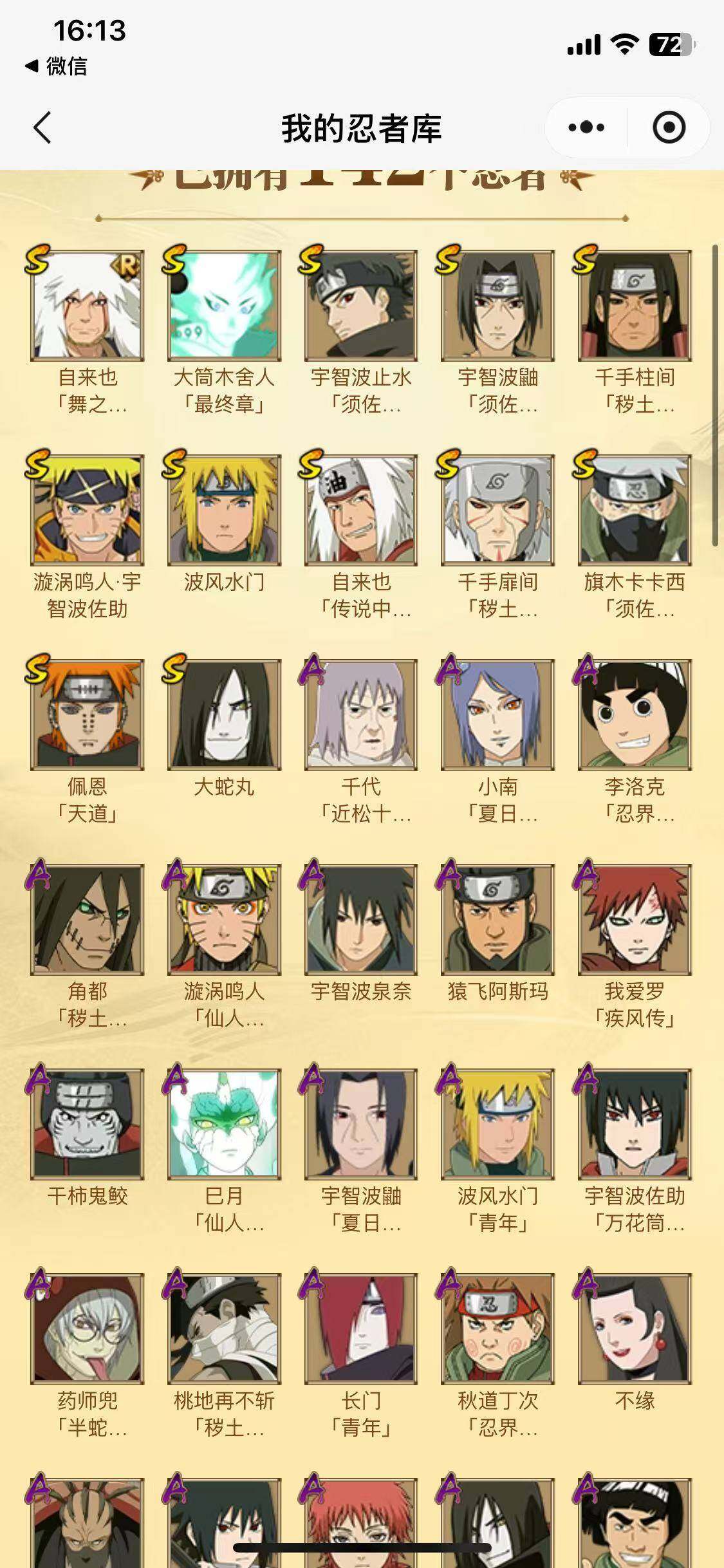 【S级忍者】:千手扉间「秽土转生」(3星),千手柱间「秽土转生」(3星),宇智波鼬「须佐能乎」(3星),宇智波止水「须佐能乎」(3星),旗木卡卡西「须佐能乎」(3星),自来也「舞之豪杰」(3星),大蛇丸(3星),自来也「传说中的三忍」(3星),波风水门(3星),佩恩「天道」(3星),大筒木舍人「最终章」(3星),漩涡鸣人·宇智波佐助(3星)