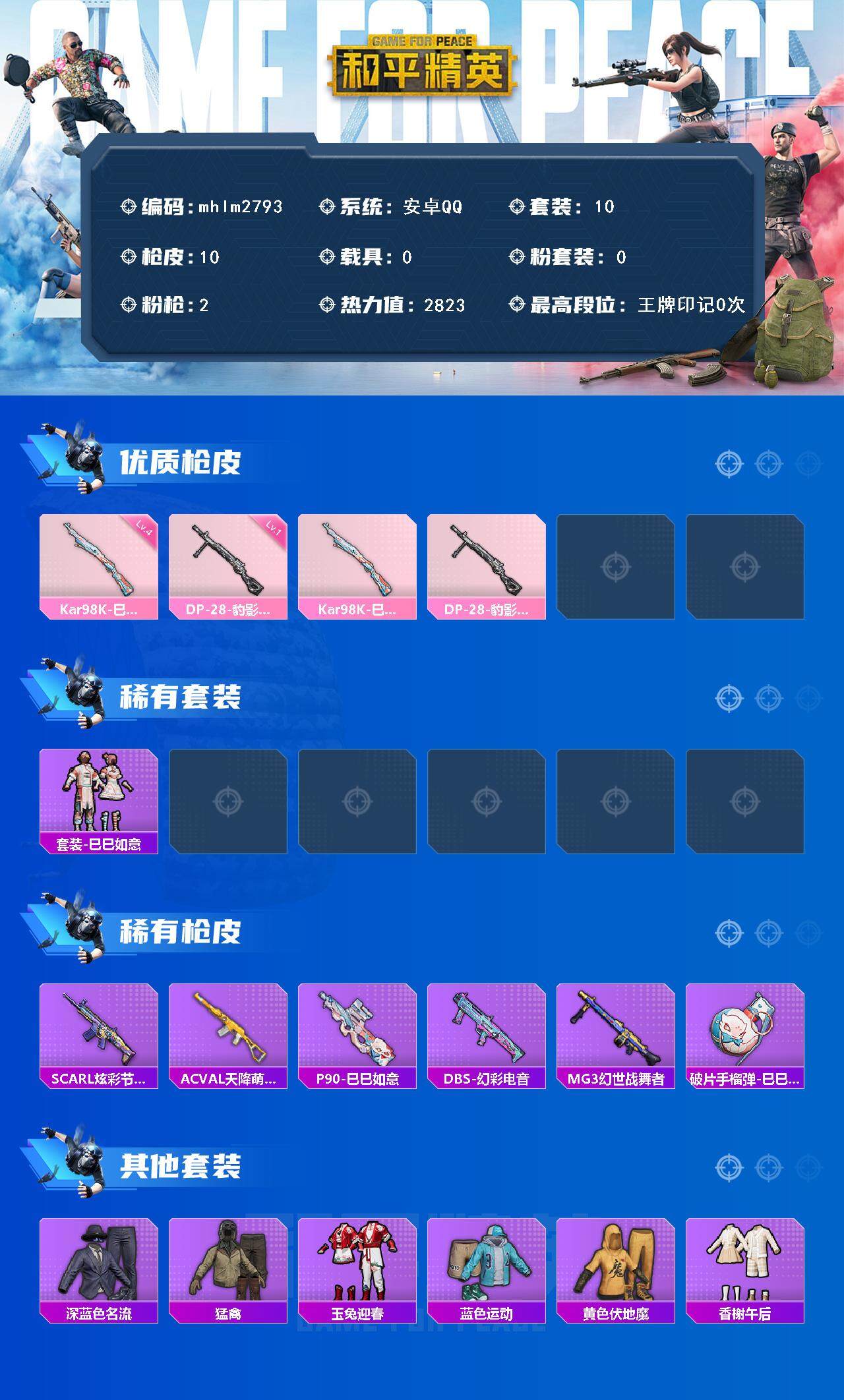 【mhlm2793】安卓 手Q-0粉装-2特效枪-0载具-0粉色飞行器-2823热力值-0王牌印记-10套装-10枪皮