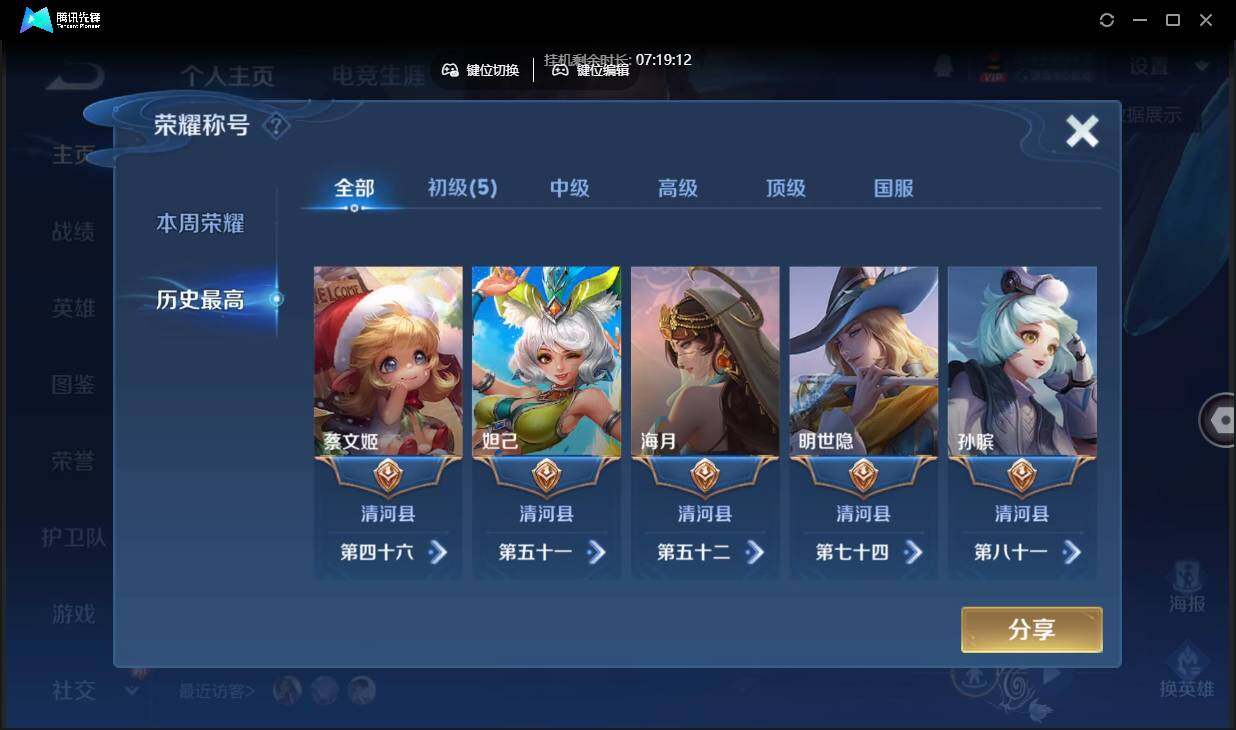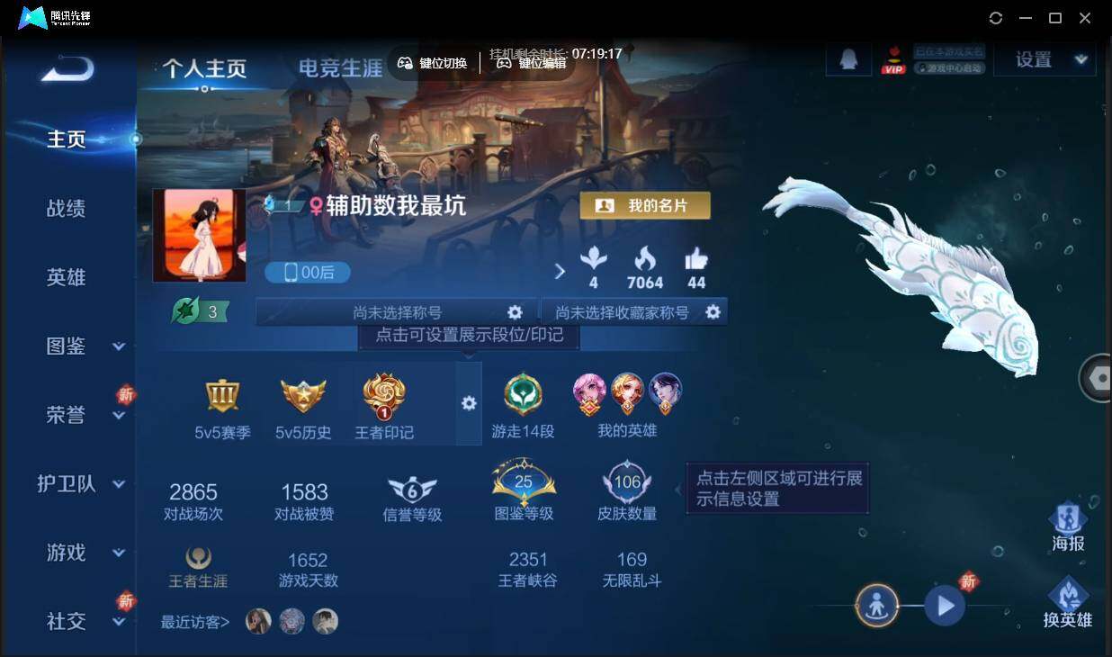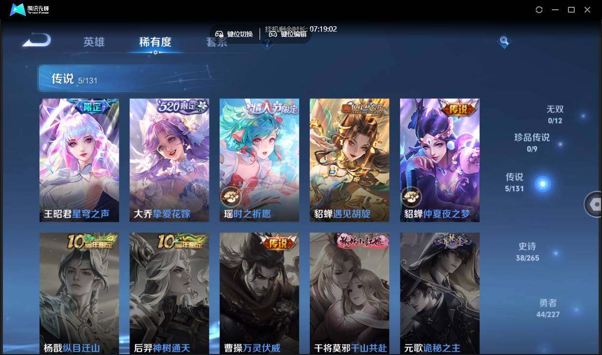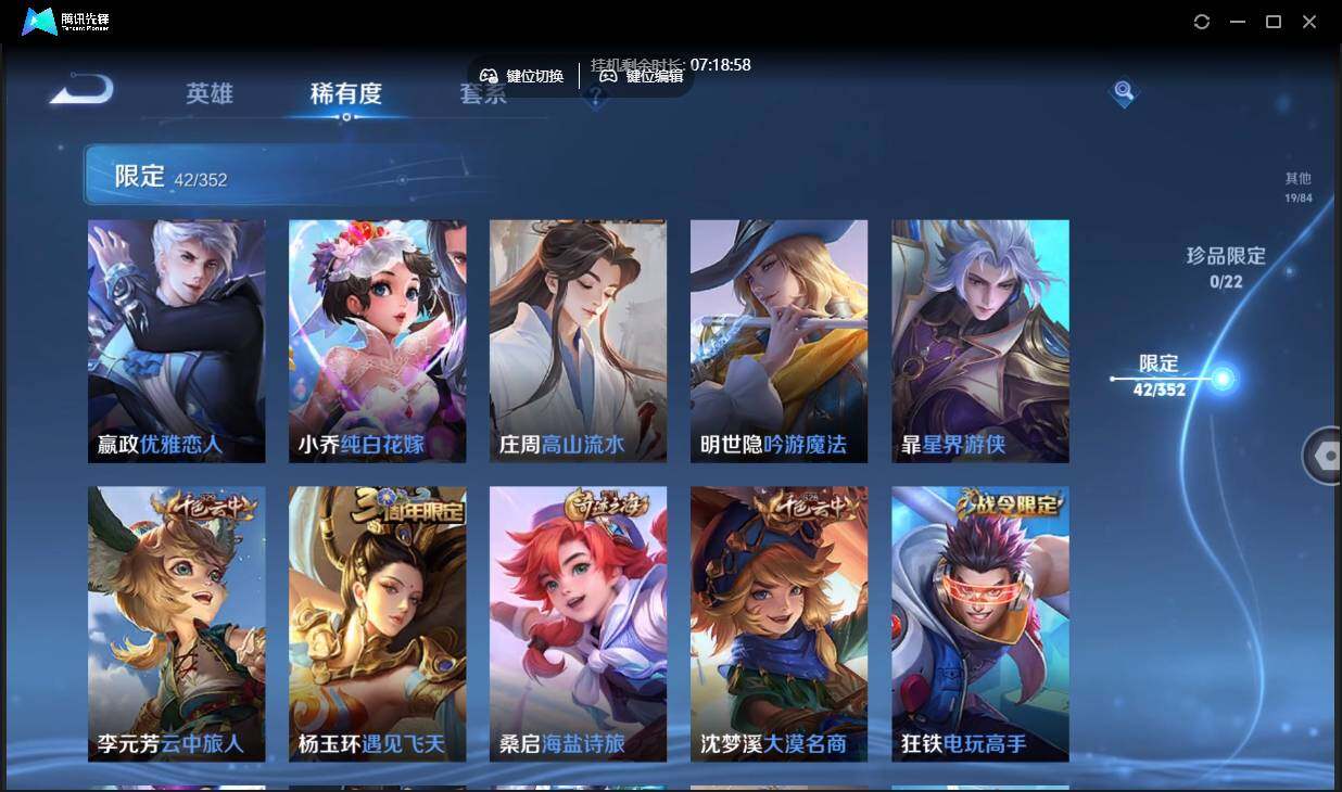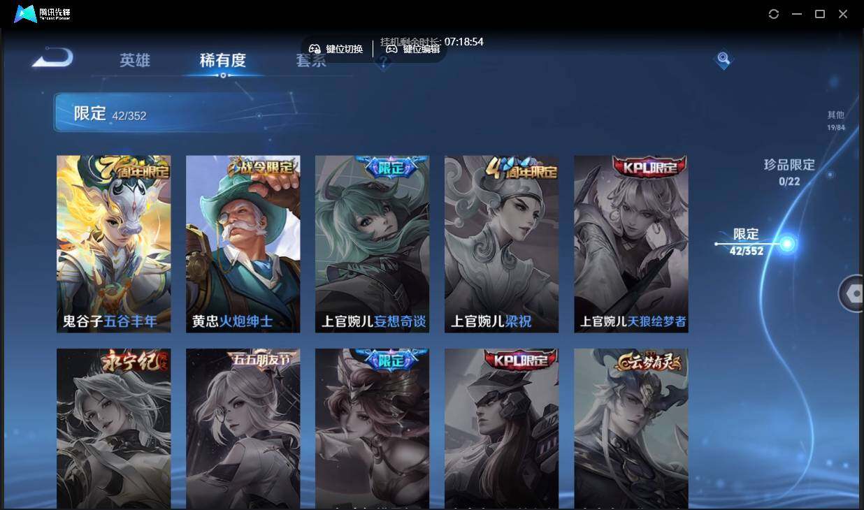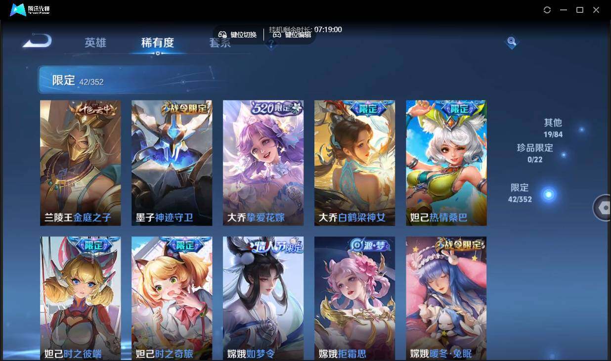 安卓q-有二次-贵7-84英雄-106皮肤-5传说-42限定-9按键-贵族积分3.1w