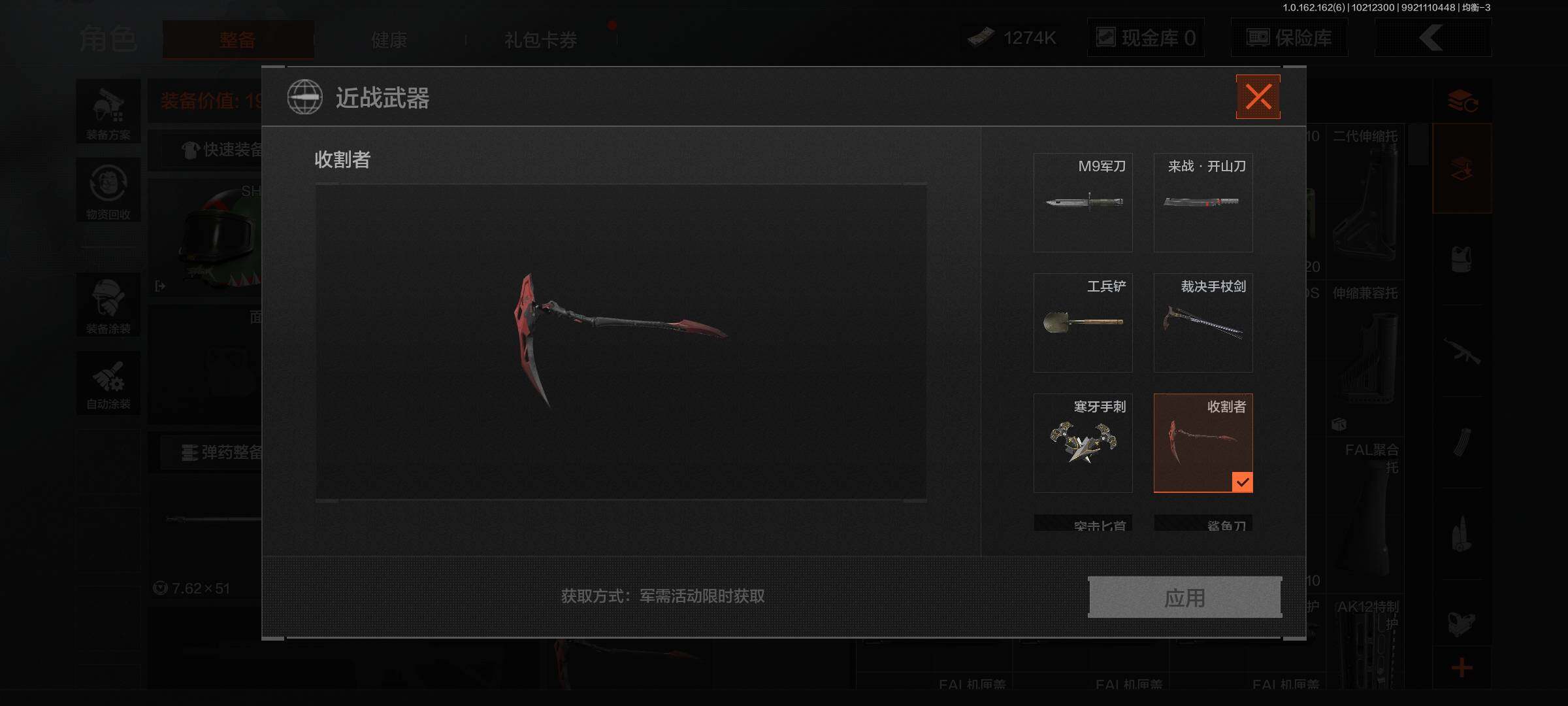 安卓QQ,3把手感不错的刀皮,8把金枪,3个金衣,仓库价值5M,科恩币1274