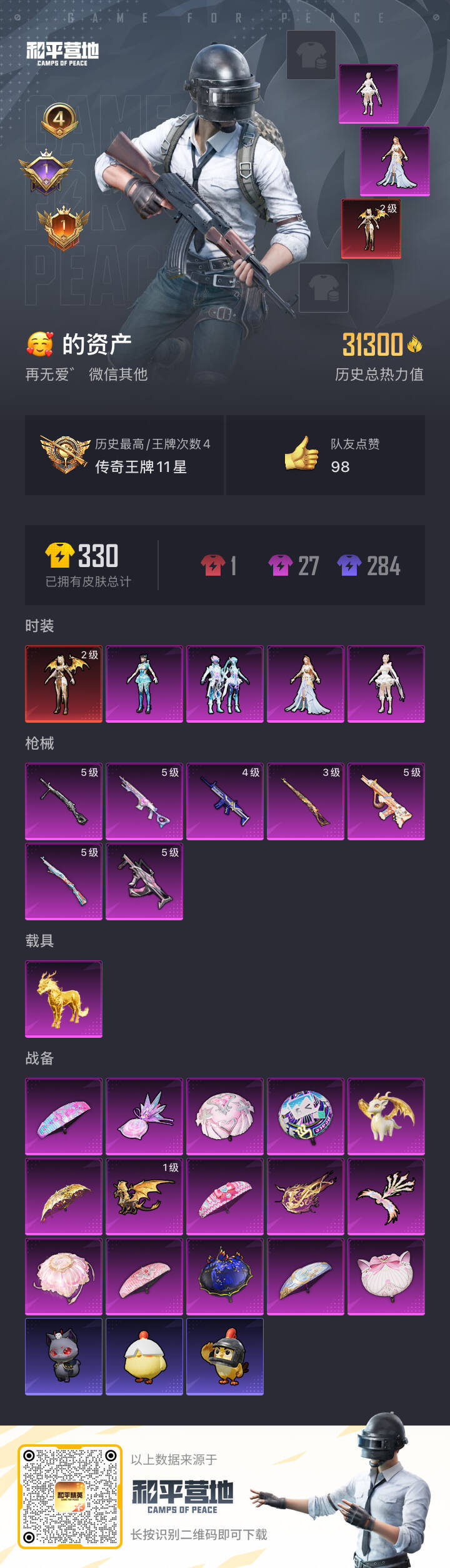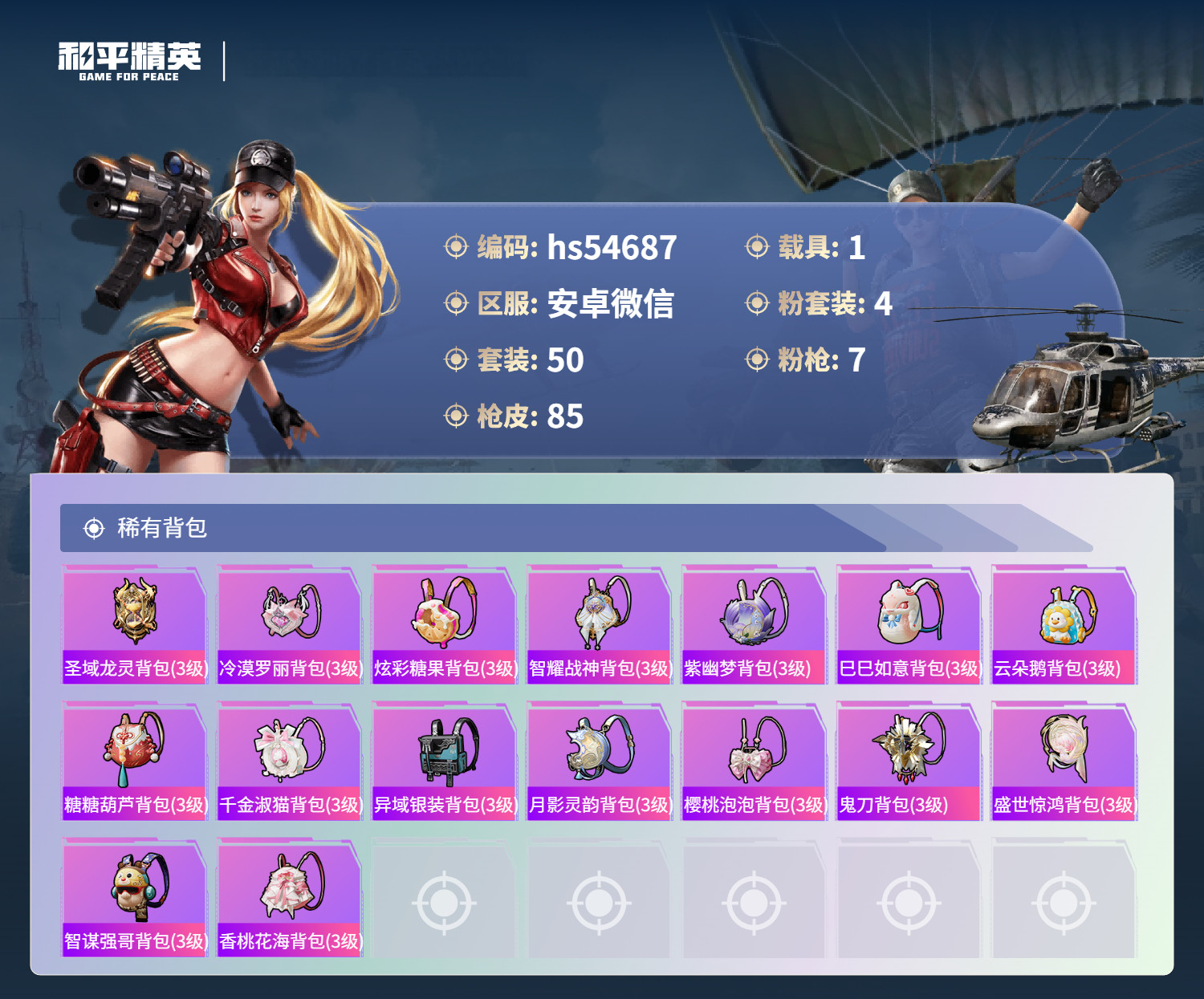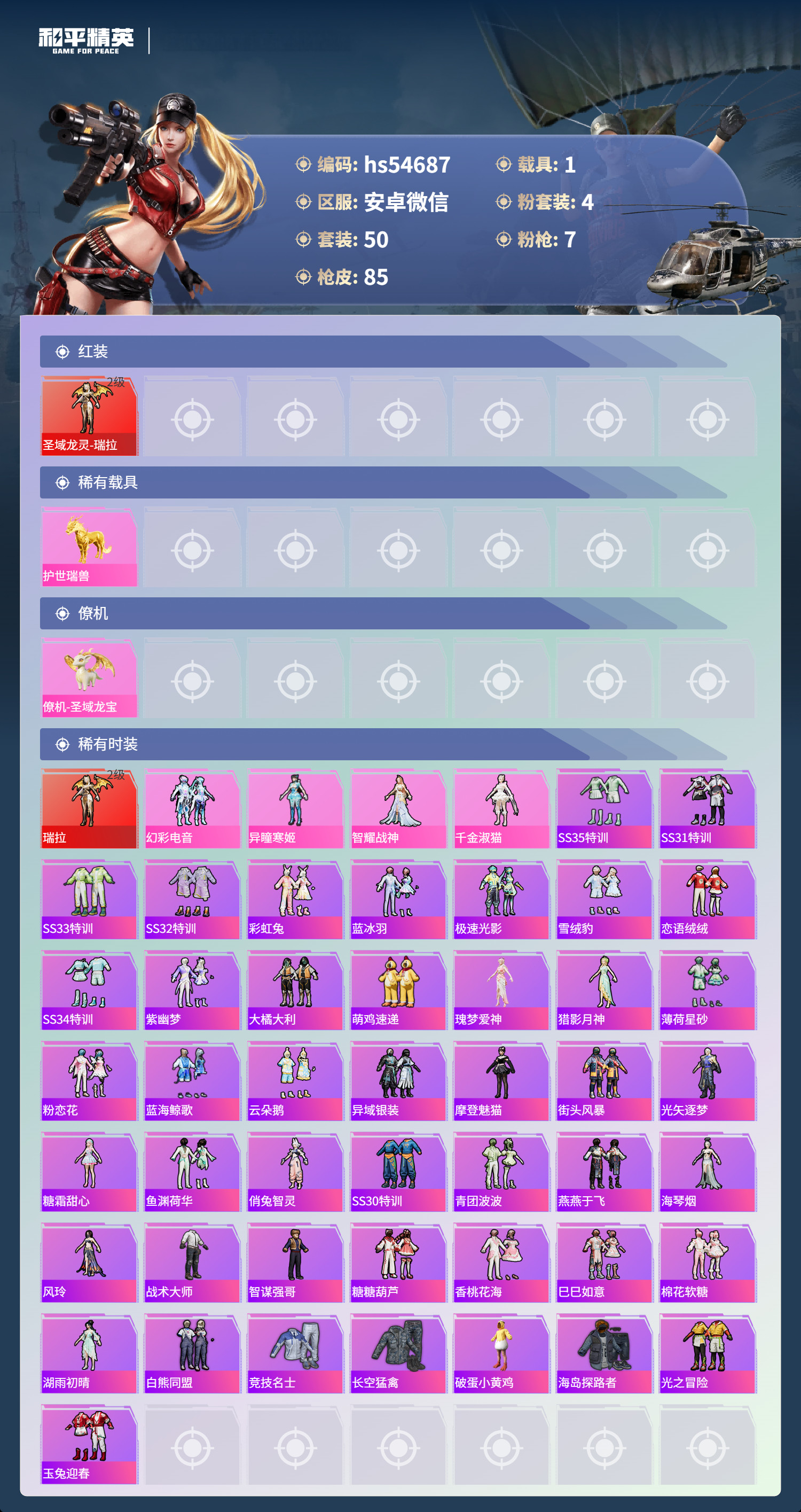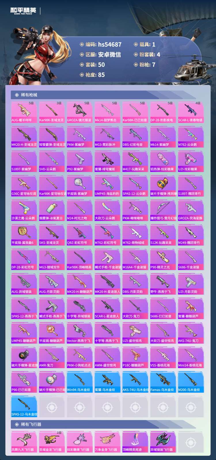 hs54687 安卓v-4王牌印记-1红装-4粉装-7特效枪-1载具-31300热力值-50套装-