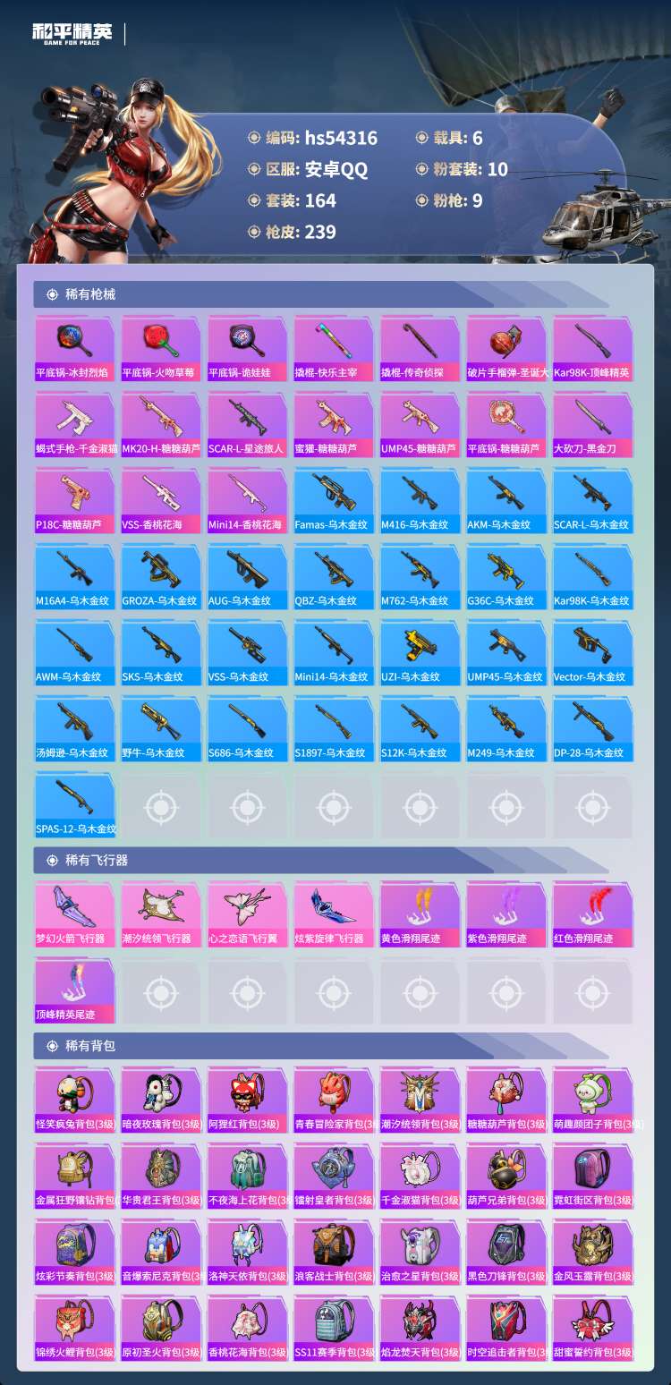 hs54316 安卓手Q-1王牌印记-10粉装-9特效枪-6载具-77762热力值-164套装-23