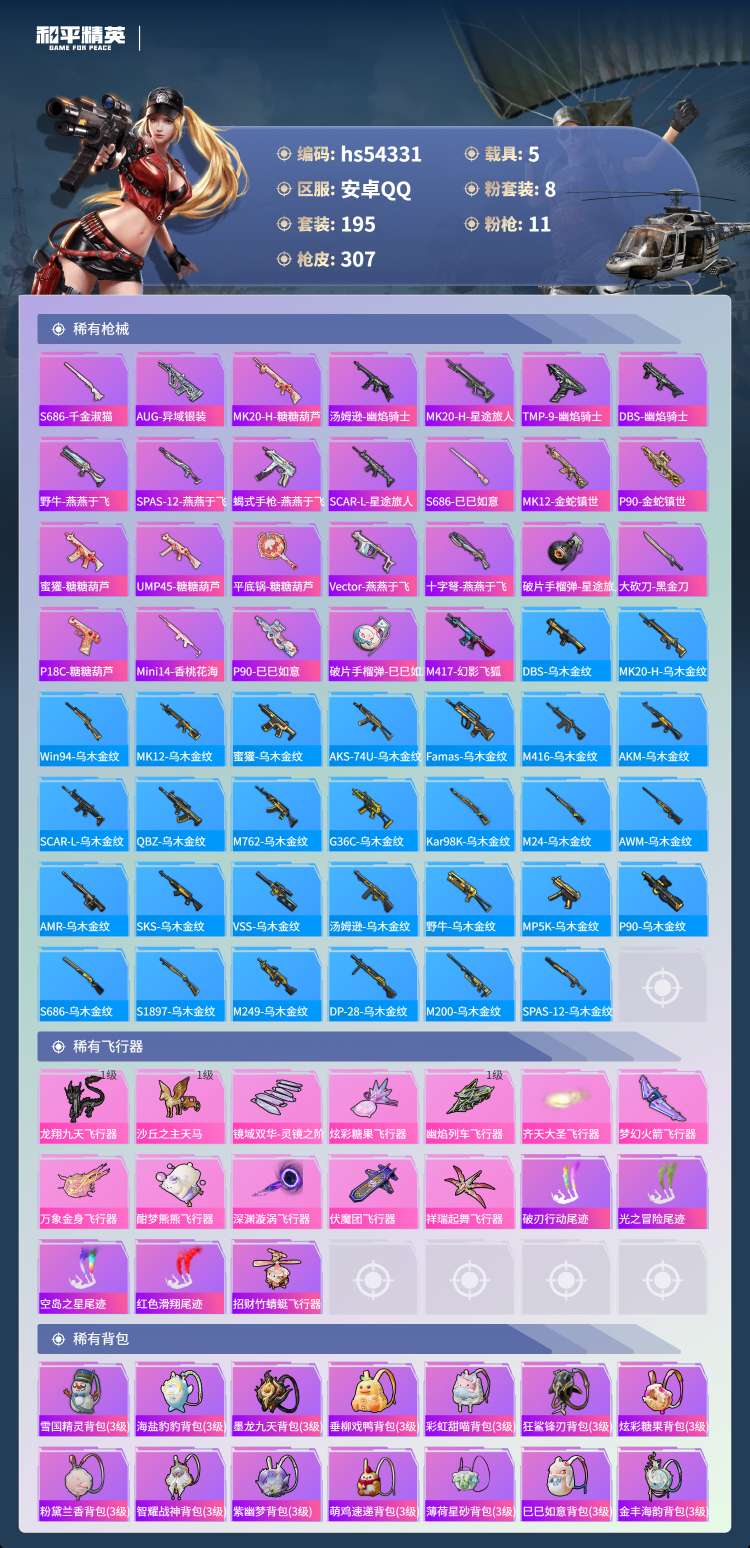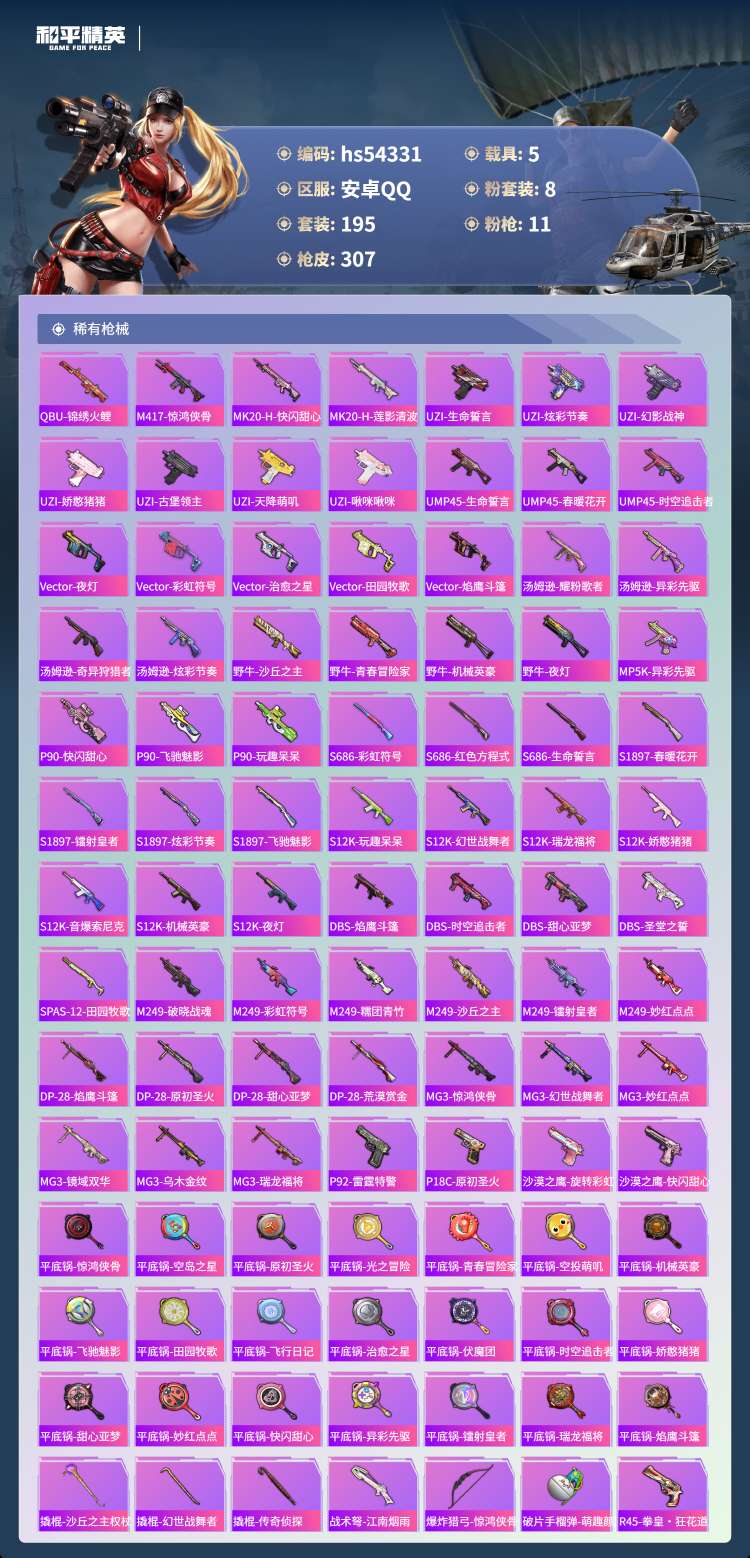 hs54331 安卓手Q-13王牌印记-3红装-8粉装-11特效枪-5载具-106823热力值-19