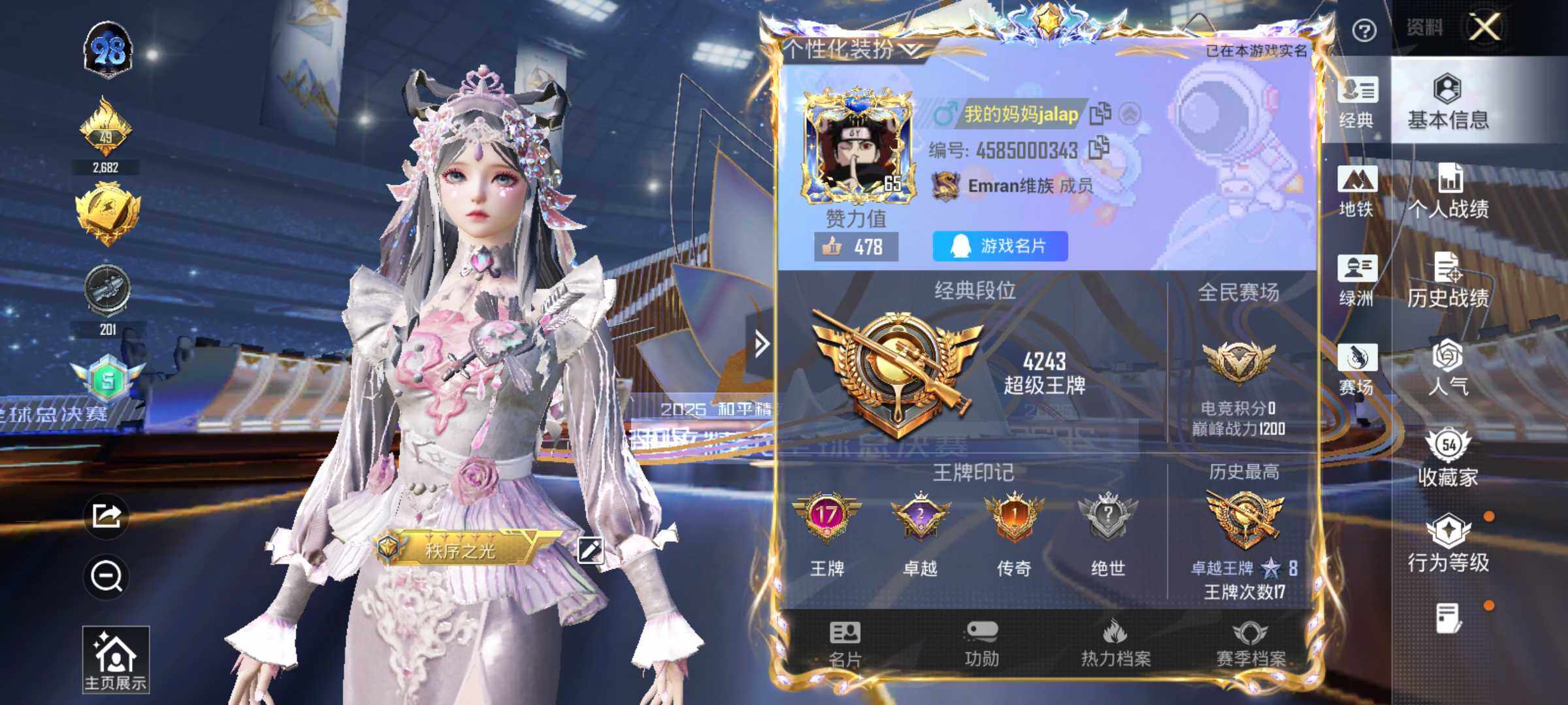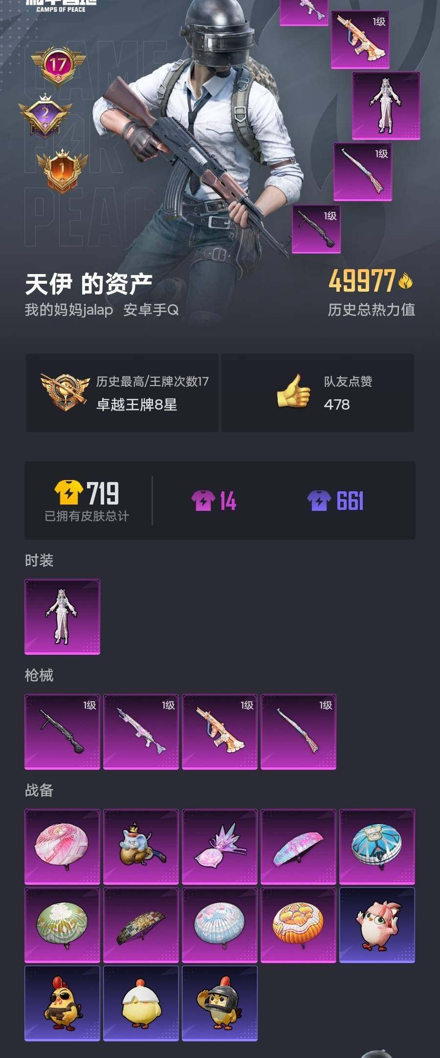 147套装/枪械4/装备213/战备174/王牌印记17/热力值49977/一级AUG-暖羊咩咩/一级Kar98K-巳巳如意/一级Mk14-甜梦熊击/一级DP-28-豹影疾电/套装-龟仙人/角色-冷漠罗丽/AUG-暖羊咩咩/Kar98K-巳巳如意/Mk14-甜梦熊击/DP-28-豹影疾电/极意拳锋飞行器/绝对恒星降落伞/华贵君王降落伞/橘柚倾心降落伞/彩虹甜喵降落伞/闲梦青缨降落伞/异瞳寒姬降落
