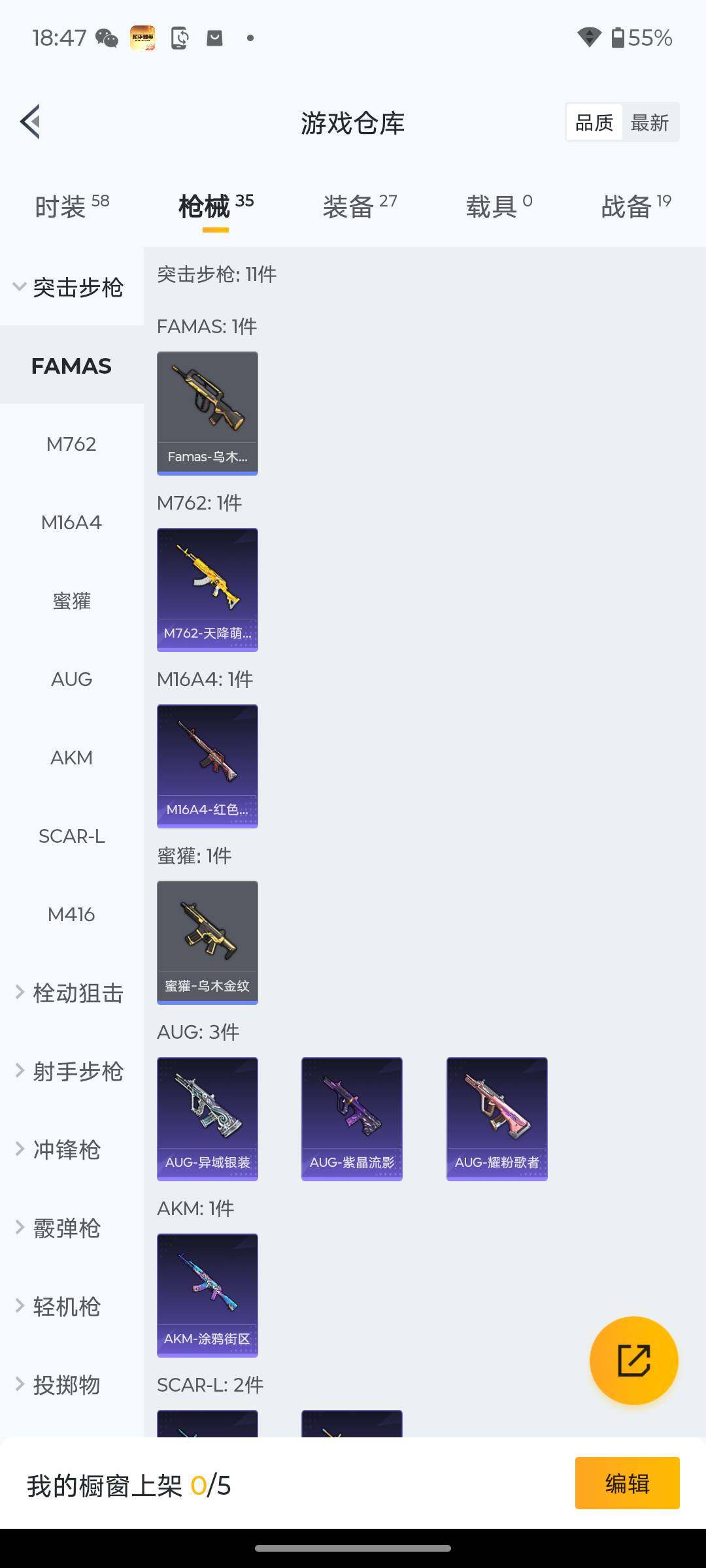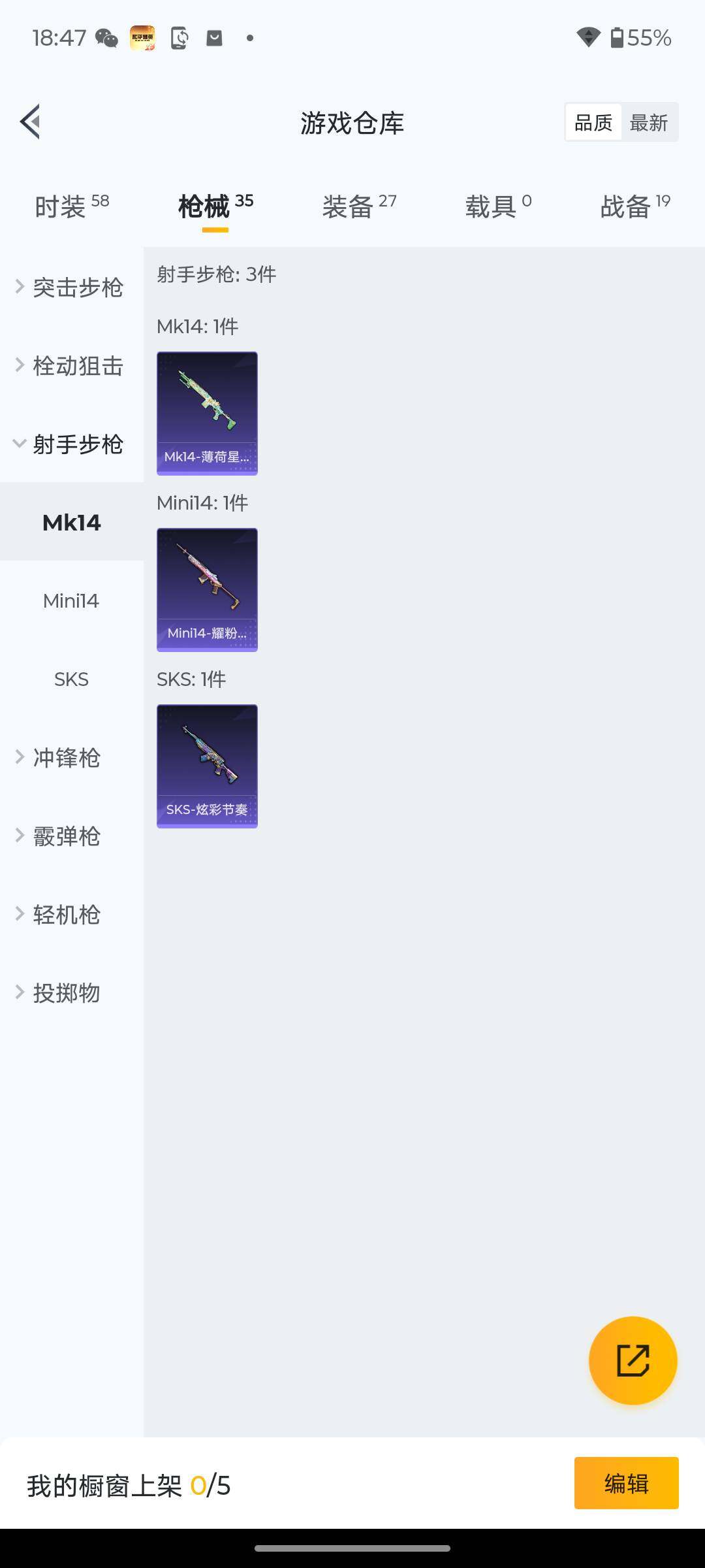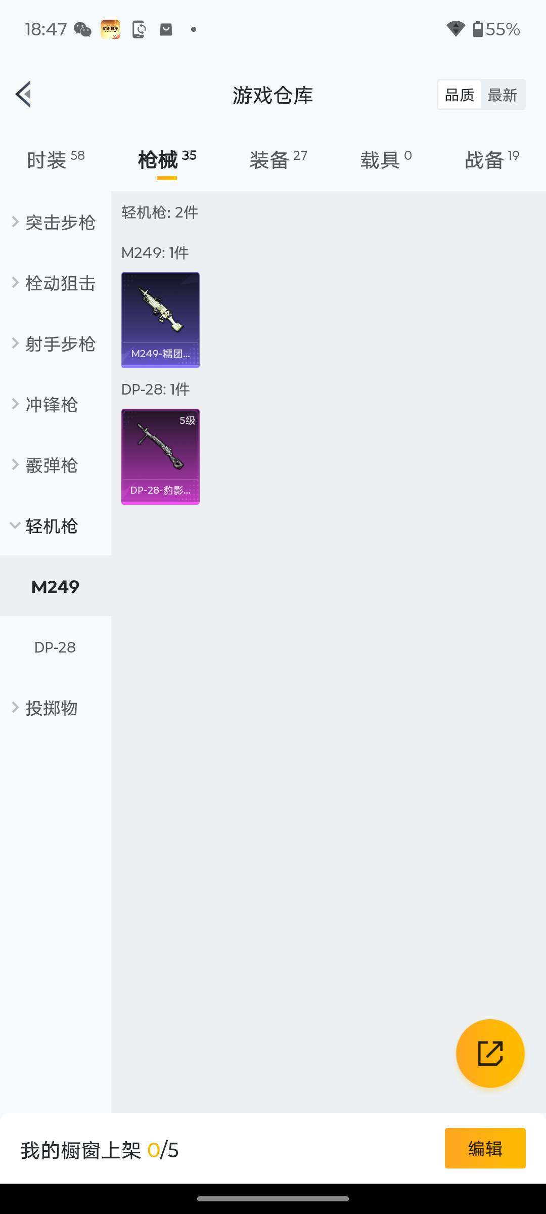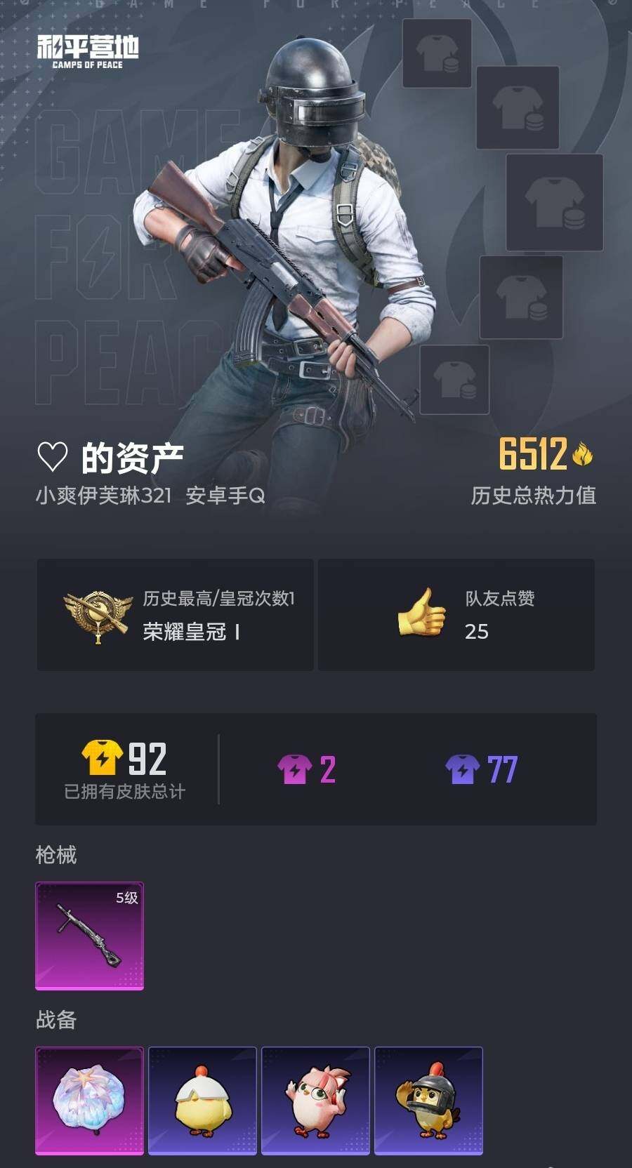 11套装/枪械1/装备27/战备19/热力值6512/五级DP-28-豹影疾电/DP-28-豹影疾电/荧海星豚降落伞/M16A4-红色方程式/M416-蓝色火焰/AUG-耀粉歌者/M762-天降萌叽/UZI-啾咪啾咪/UMP45-夜灯/UMP45-生命誓言/汤姆逊-天降萌叽/汤姆逊-耀粉歌者/Kar98K-红色方程式/SKS-炫彩节奏/Mini14-耀粉歌者/S686-红色方程式/S1897-荧