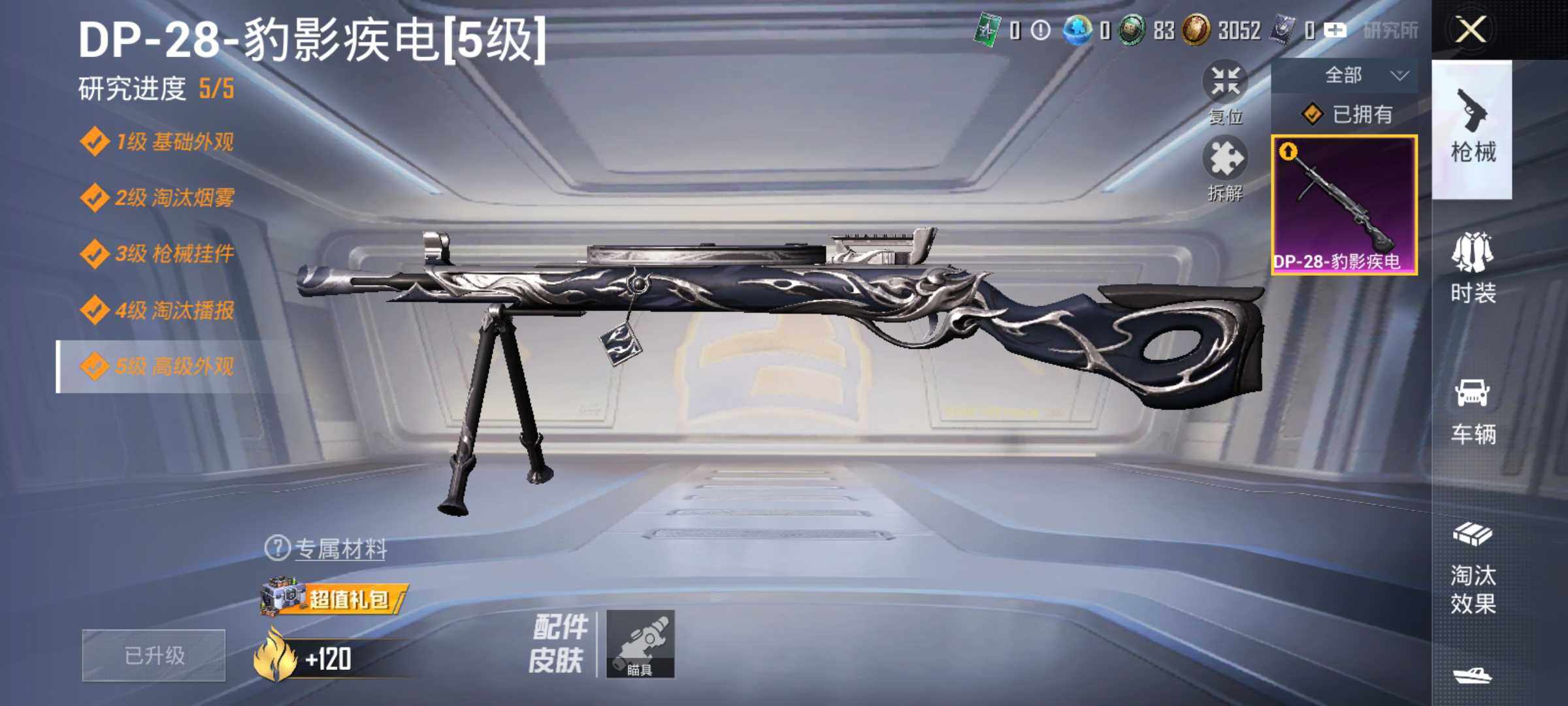 11套装/枪械1/装备27/战备19/热力值6512/五级DP-28-豹影疾电