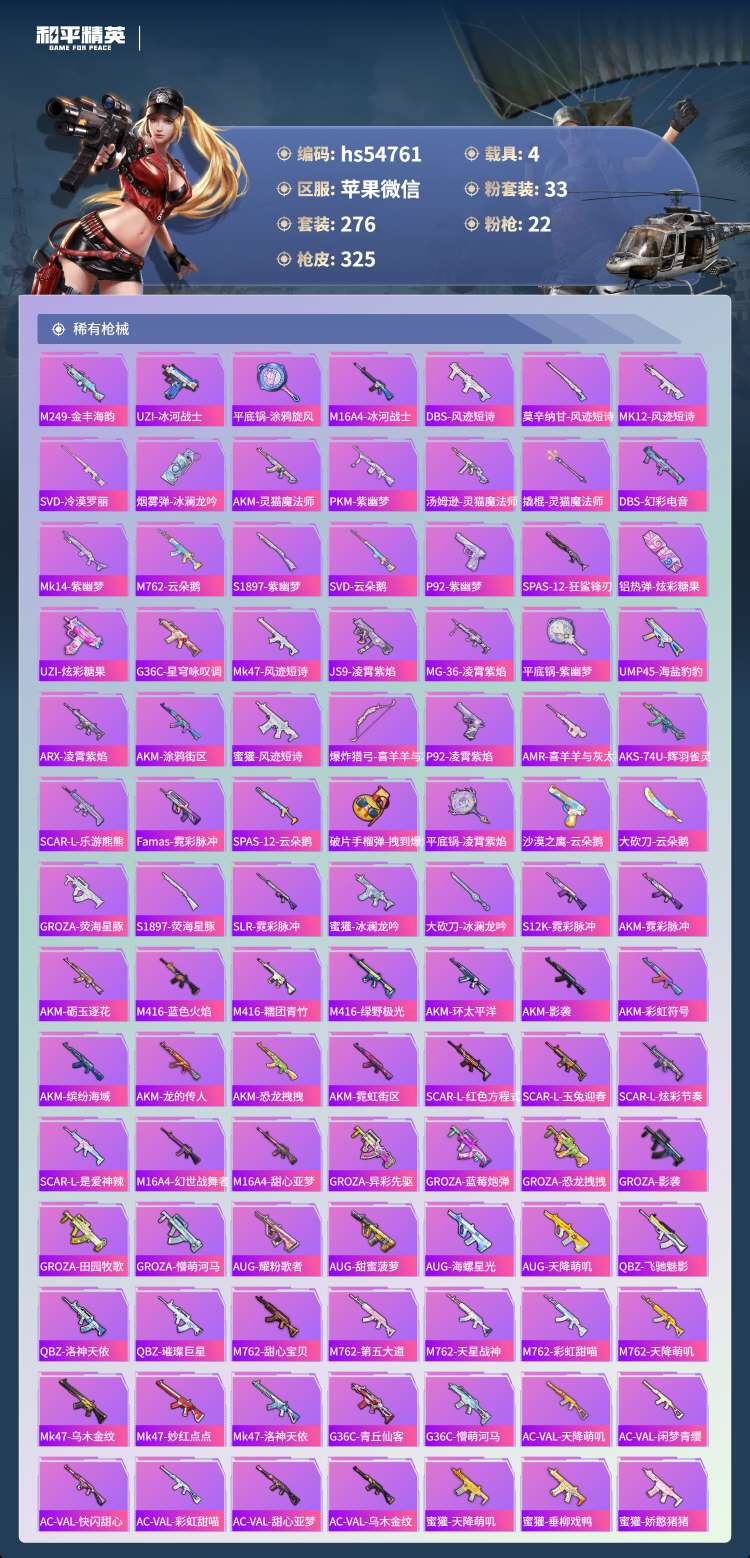 hs54761 苹果微-18王牌印记-有战神框-2红装-33粉装-22特效枪-4载具-134353