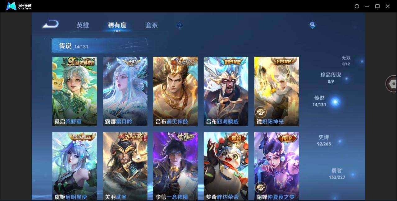 【传说皮肤】:桑启鸣野蒿,露娜霜月吟,吕布遇见神鼓,吕布怒海麟威,镜炽阳神光,虞姬启明星使,关羽武圣,李信一念神魔,梦奇胖达荣荣,貂蝉仲夏夜之梦,李白凤