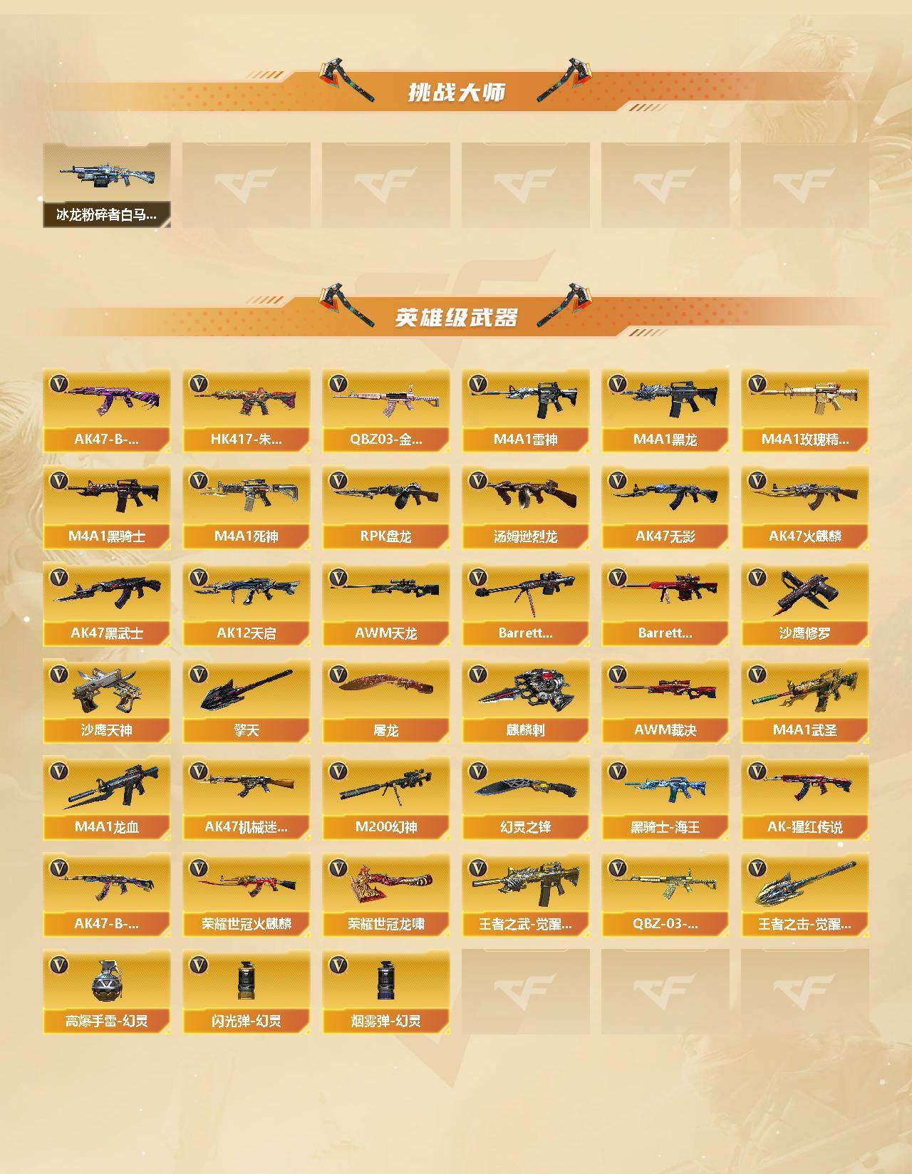 【热门武器】:传说光耀,QBZ03-金色蔷薇,HK417-朱雀,M200-幻神,死亡之眼,荣耀世冠-火麒麟,C.A.T,M4A1-黑骑士*2,汤姆逊-烈龙*3,RPK-盘龙,羊驼玩偶,降世魔童,沙鹰-修罗*3,荣耀世冠-龙啸