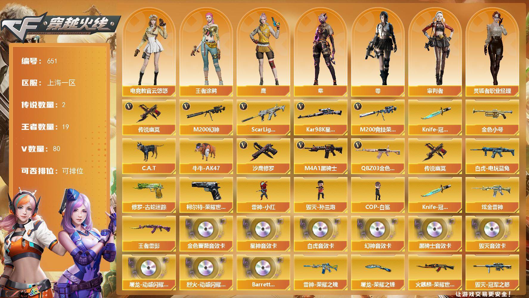 【热门武器】:传说灵眸,QBZ03-金色蔷薇*2,Scar Light-白虎,M200-幻神*2,死亡之眼*2,Kar98K-星神,金色小号,M4A1-黑骑士,汤姆逊-烈龙*6,RPK-盘龙*5,加特林-炼狱*2,斯泰尔-蝴蝶,雷神-小红,裁决-雪莉杨,COP-白鲨*2,USP-雷暴*2,COP 357-幻灵,沙鹰-修罗*3,炽芒蝶刃