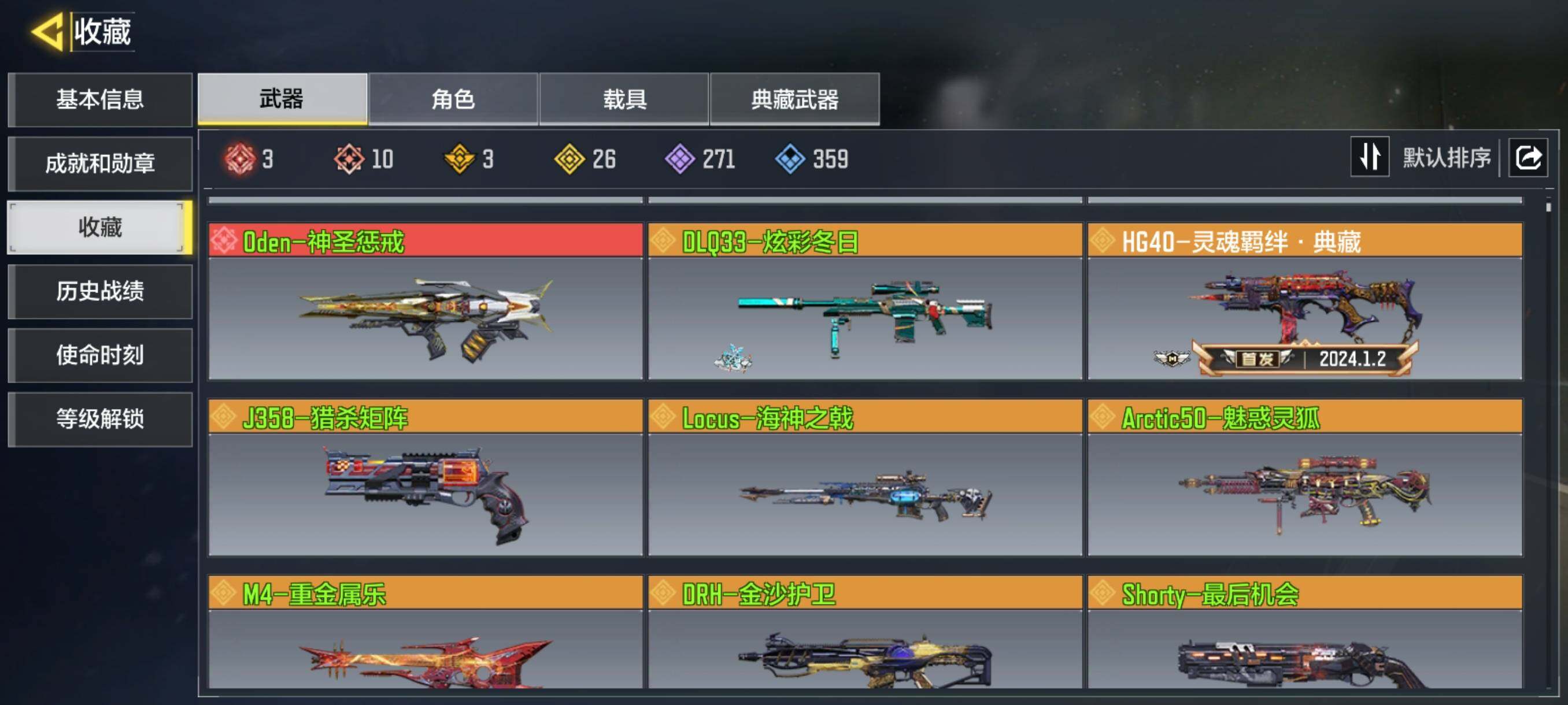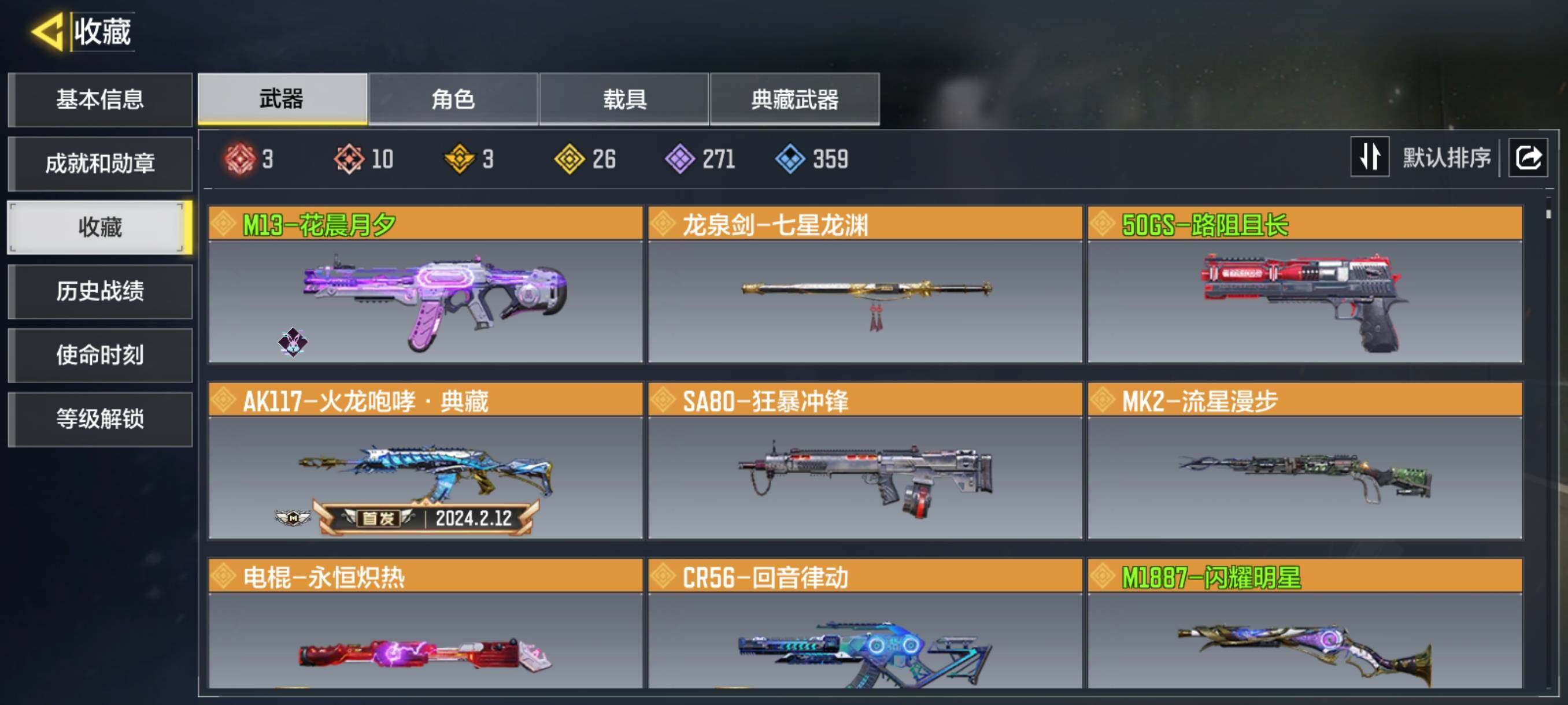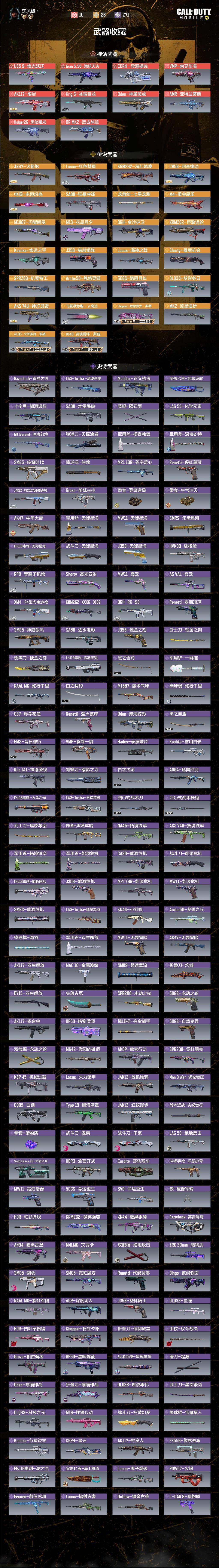 ,Grau 5.56-源核天灾,CBR4-异源侵蚀,USS9-焕光跃迁,DR MK2-远古神迹,AMR-亚特兰蒂斯,Krig6-冰霜巨龙,M13-黑耀星辰,VMP-幽冥花海,AK117-熔岩,Oden-神圣惩戒,DLQ33-炫彩冬日,Locus-海神之戟,Arctic50-魅惑灵狐,DRH-金沙护卫,Shorty-最后机会,M13-花晨月夕,SPR208-机要特工,KRM