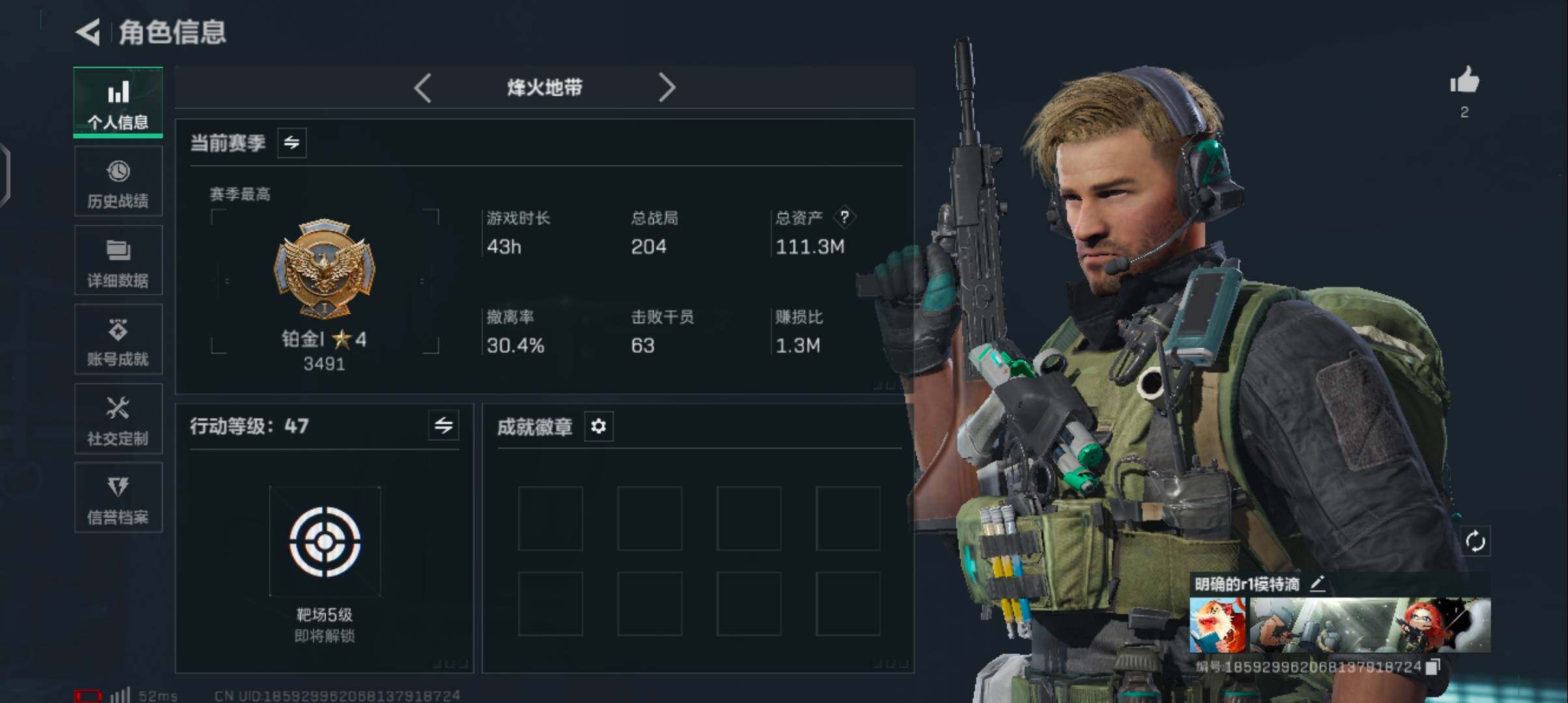 111m总资产-1178k哈伏币-47烽火等级-铂金-5战场等级-无军衔【近