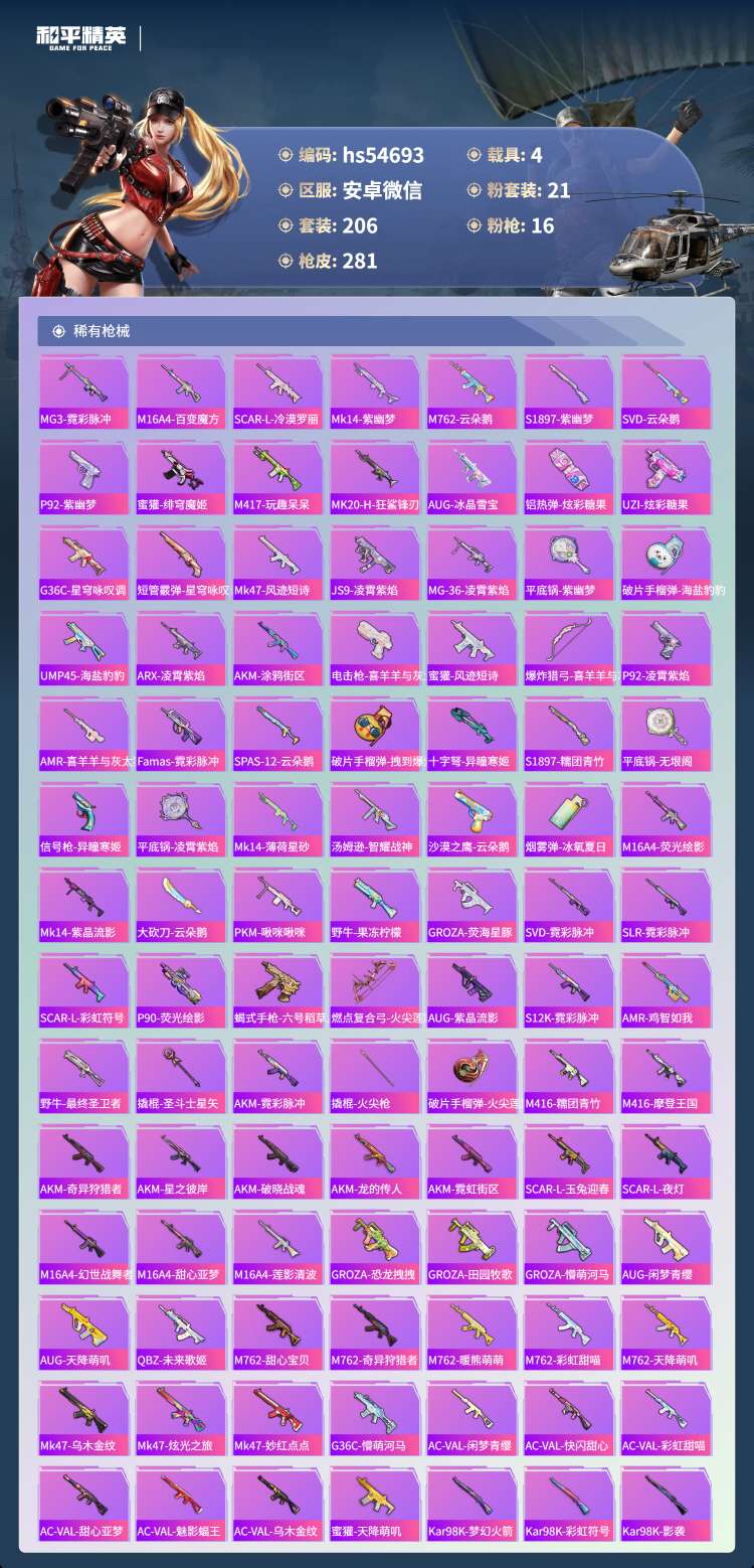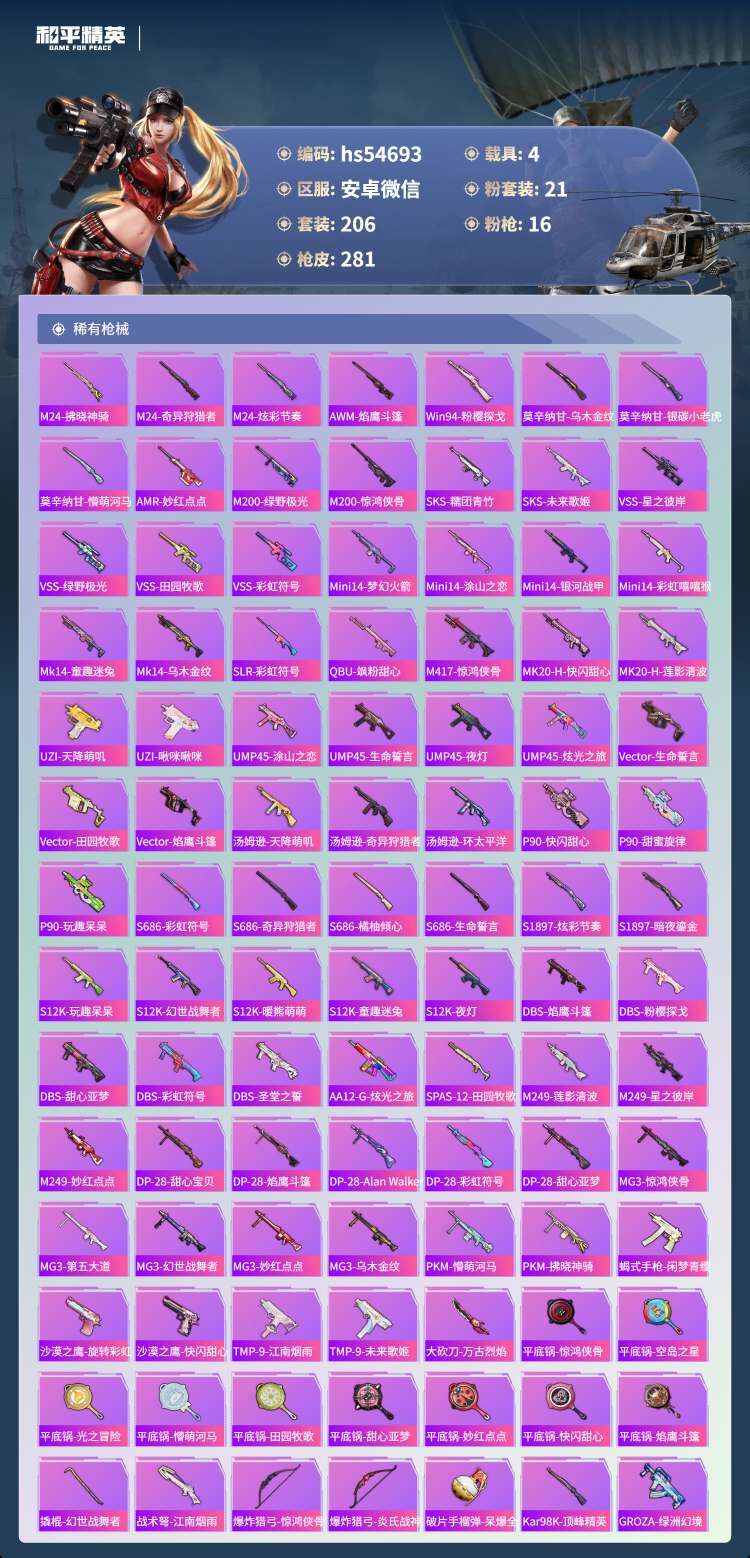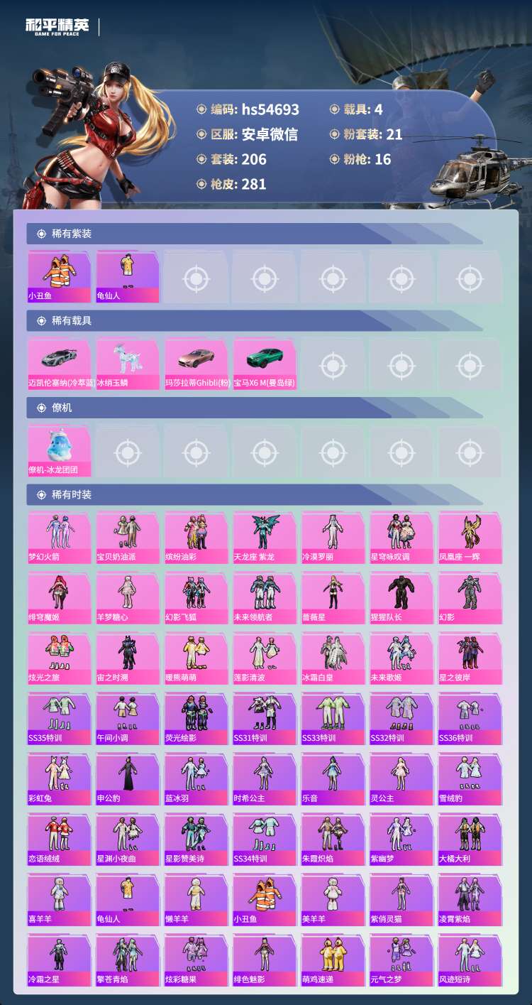 hs54693 安卓微-13王牌印记-21粉装-16特效枪-4载具-106131热力值-206套装