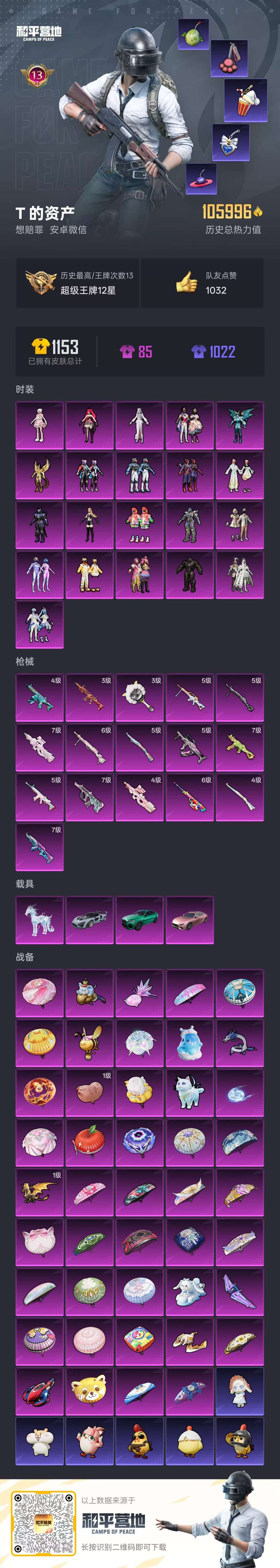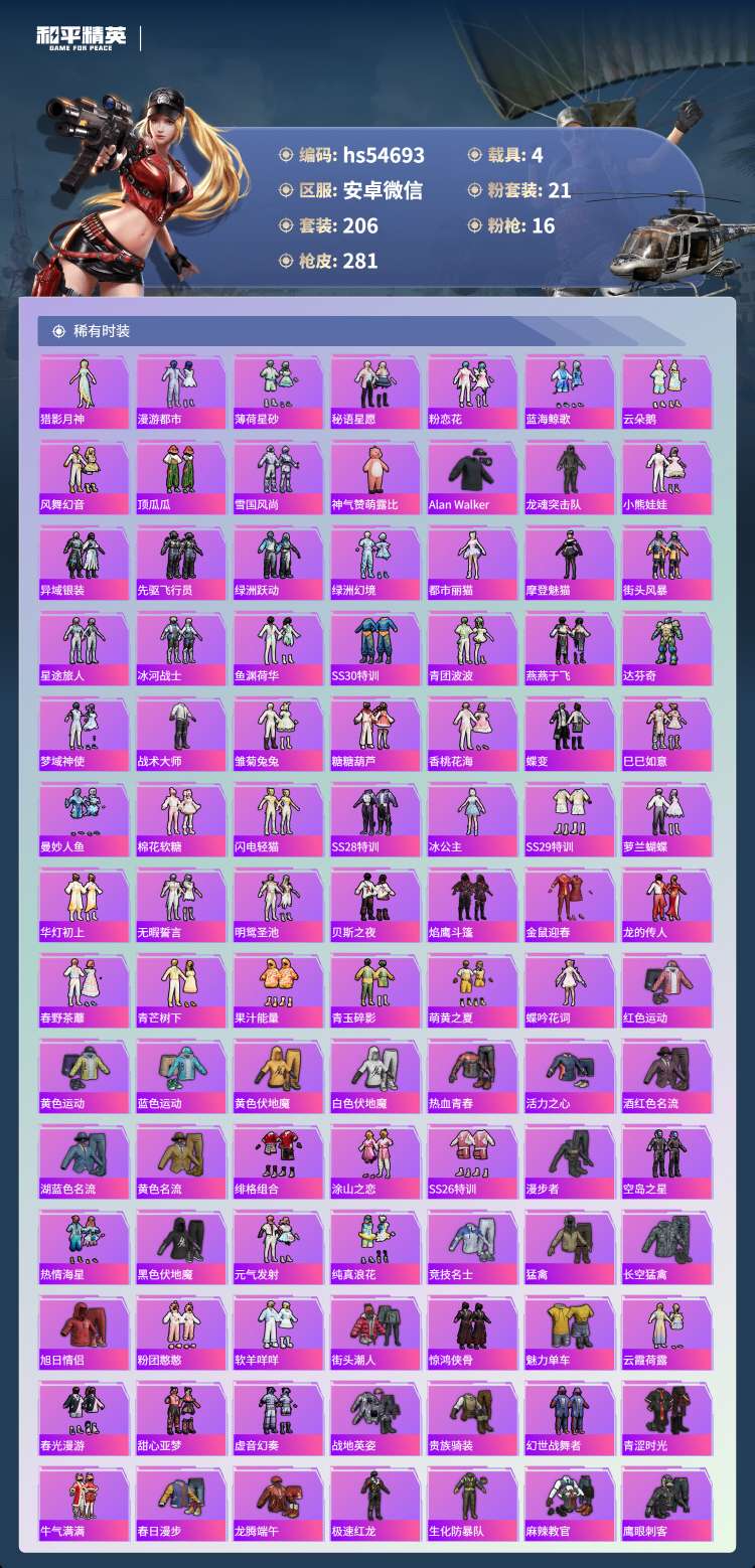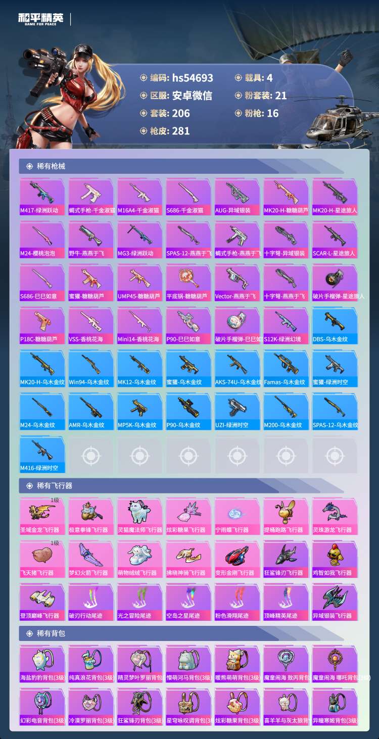 hs54693 安卓微-13王牌印记-21粉装-16特效枪-4载具-106131热力值-206套装