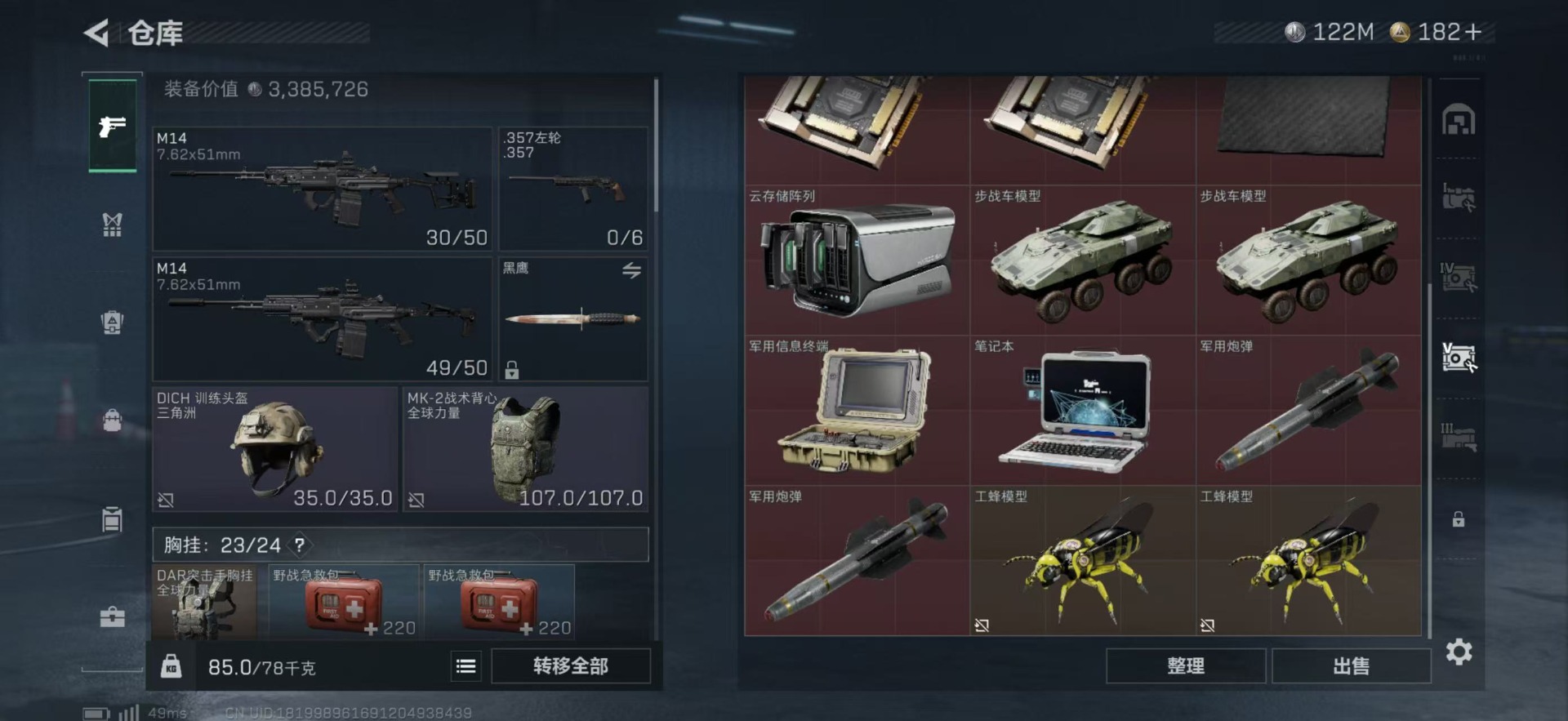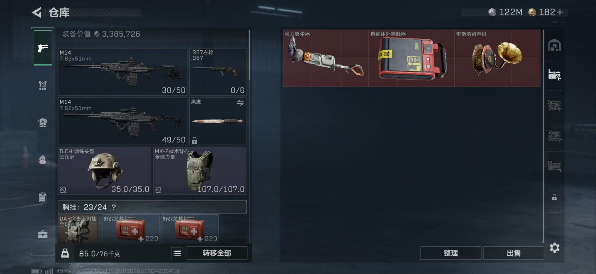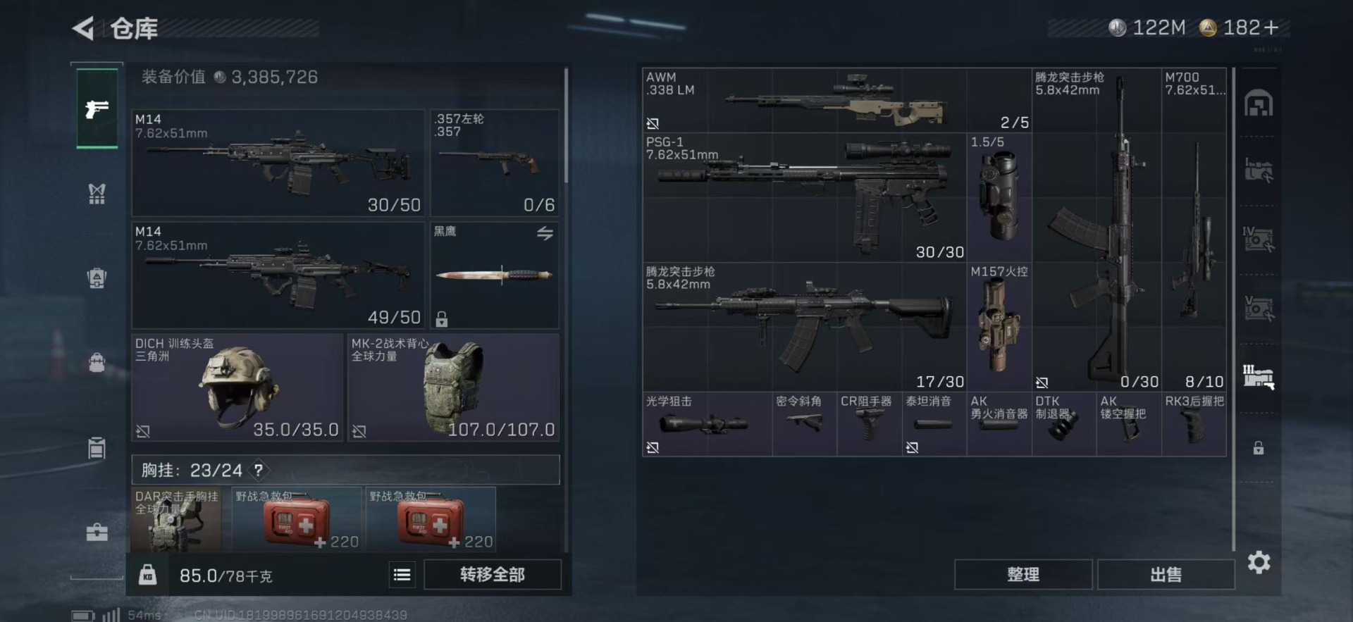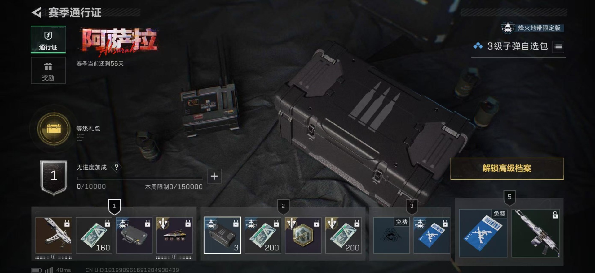 总资产:249.1M 1干员外观 10传说枪械 哈夫币:122K 可二次 可修改实名