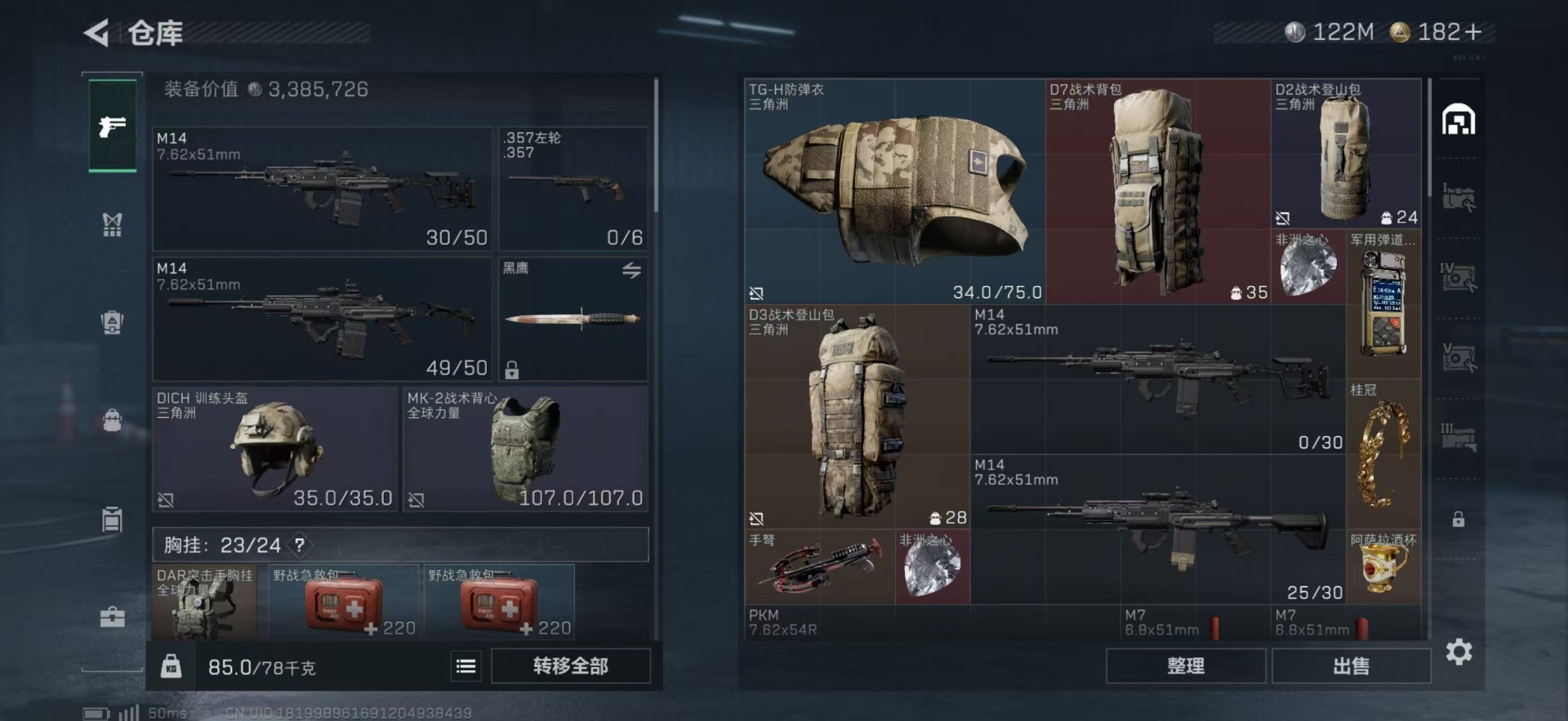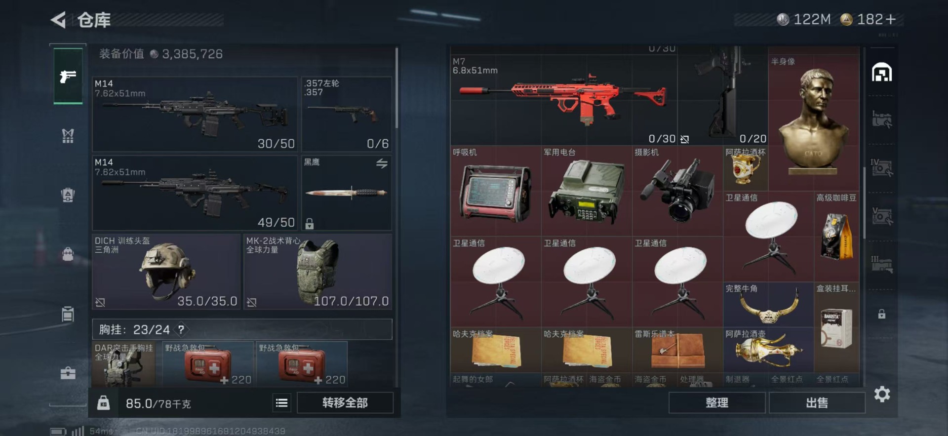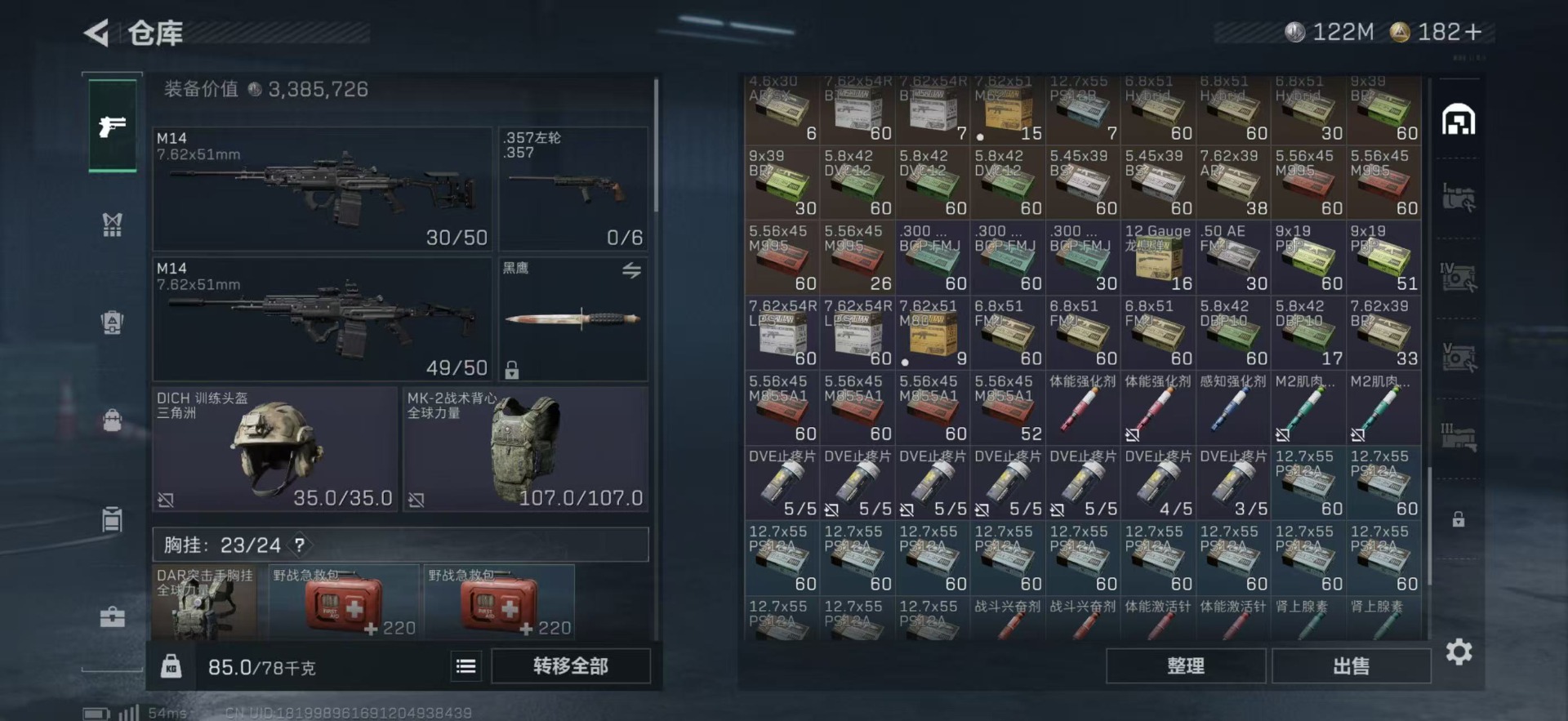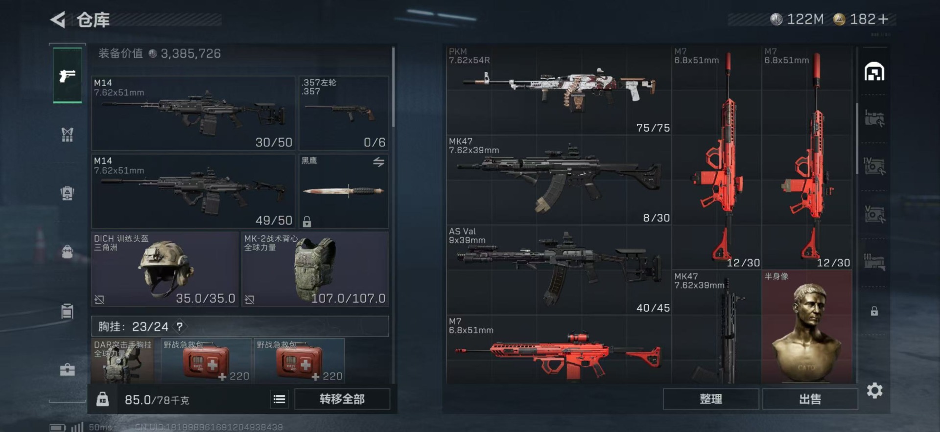 总资产:249.1M 1干员外观 10传说枪械 哈夫币:122K 可二次 可修改实名
