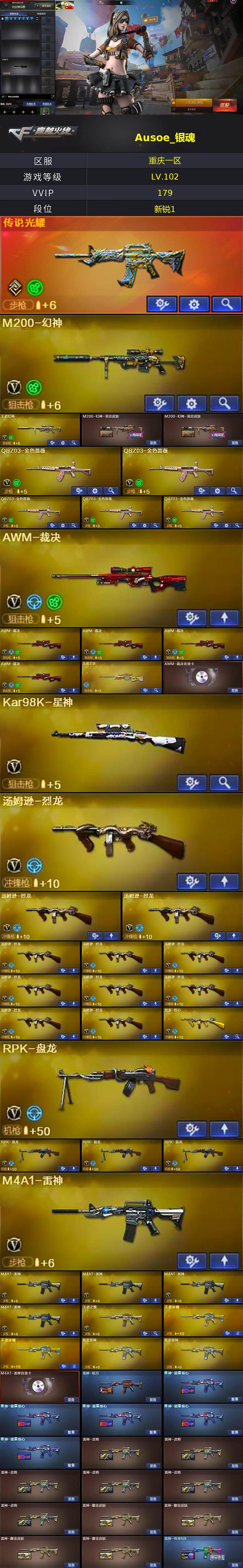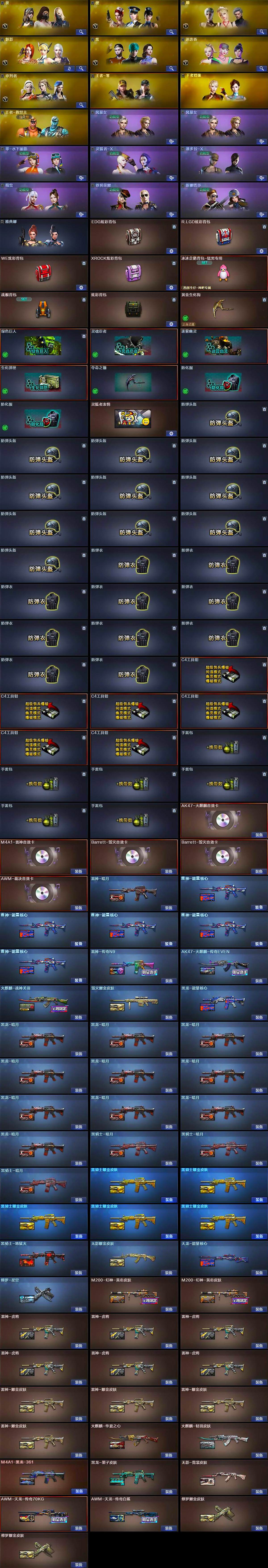 【热门武器】:传说光耀,QBZ03-金色蔷薇*5,HK417-朱雀,M4A1-青龙,M200-幻神,死亡之眼,Kar98K-星神,金色小号,C.A.T,M4A1-黑骑士*2,汤姆逊-烈龙*11,RPK-盘龙*4,加特林-炼狱*11,斯泰尔-蝴蝶,降世魔童,火麒麟-绝迹,COP-白鲨,沙鹰-修罗*6